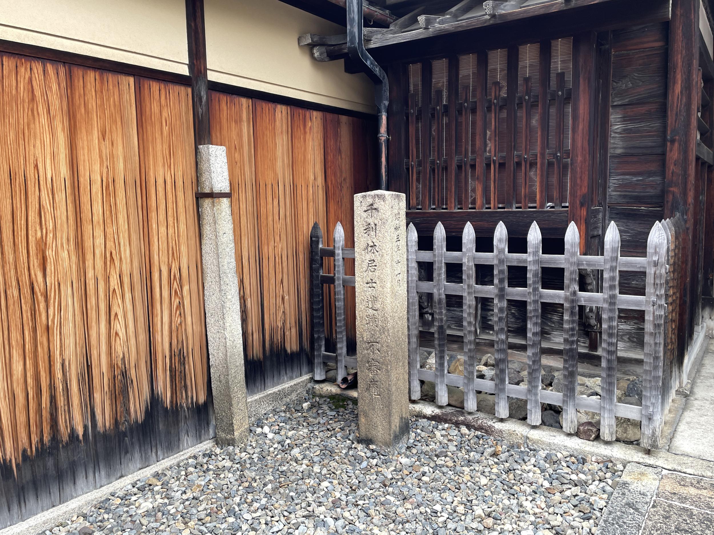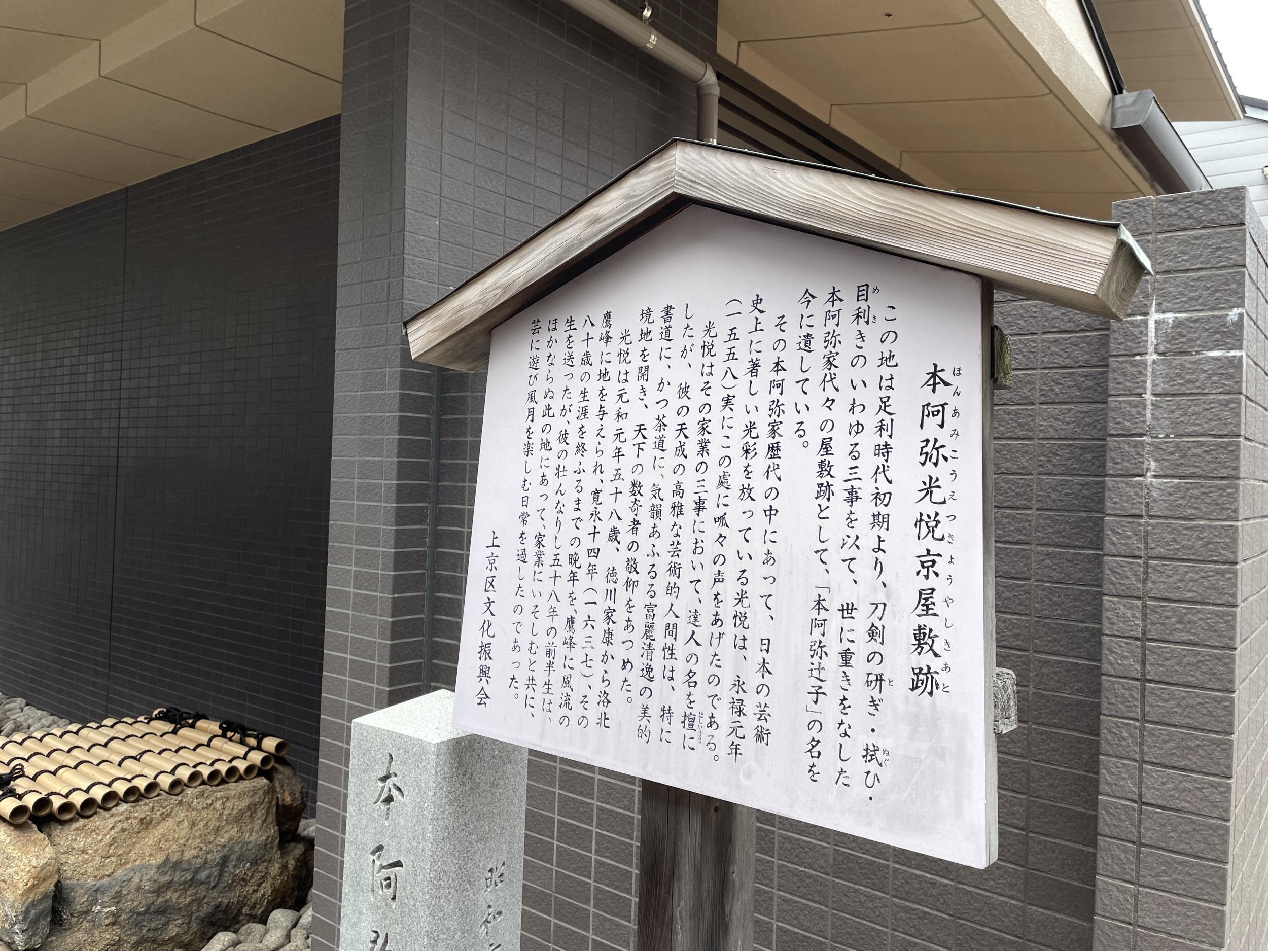 美しい和服女性が出てきたお屋敷門前に千利休居士遺跡不審庵の石碑。不審庵とは千利休が営んだ茶室の名で歴代の家元がこれを継承してきたと表千家のホームページにありました。つまりここが表千家のお屋敷そのもののようです。不審とは自然の偉大さ、不思議さに感動する心だそうです。本阿弥光悦の足跡を探していたつもりが10分ほど歩くだけで千利休に行き着いてしまいました。