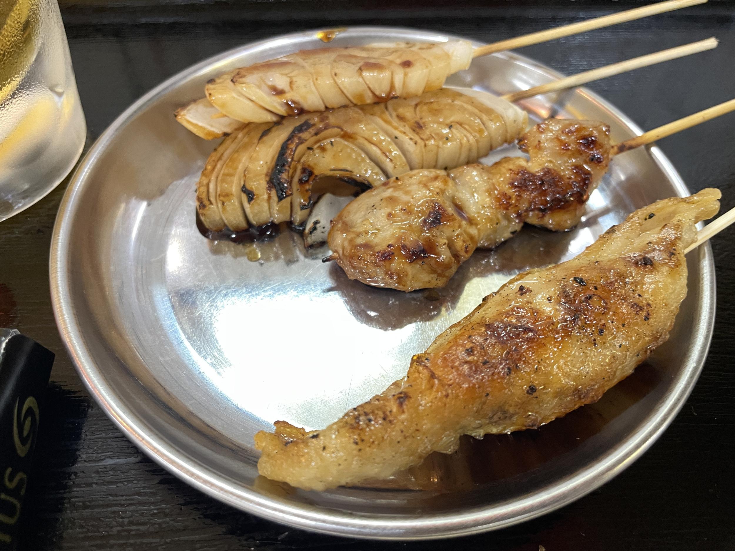 すっかりお店のお母さんに顔を覚えてもらったタルショウでプファー、まじ美味かった。串は手前から鶏皮ぎょうざ、豚味噌漬け、たまねぎタレ焼です。