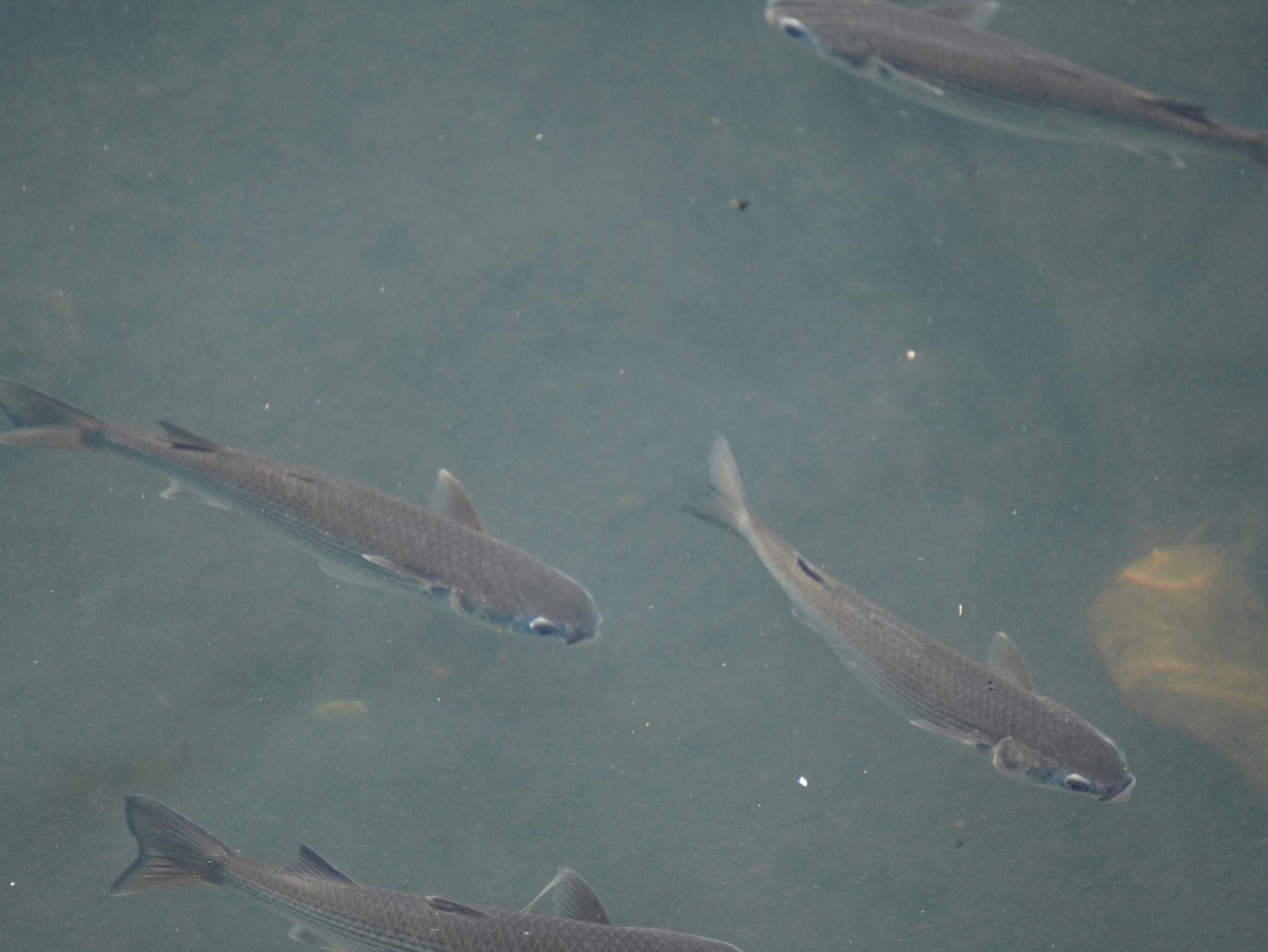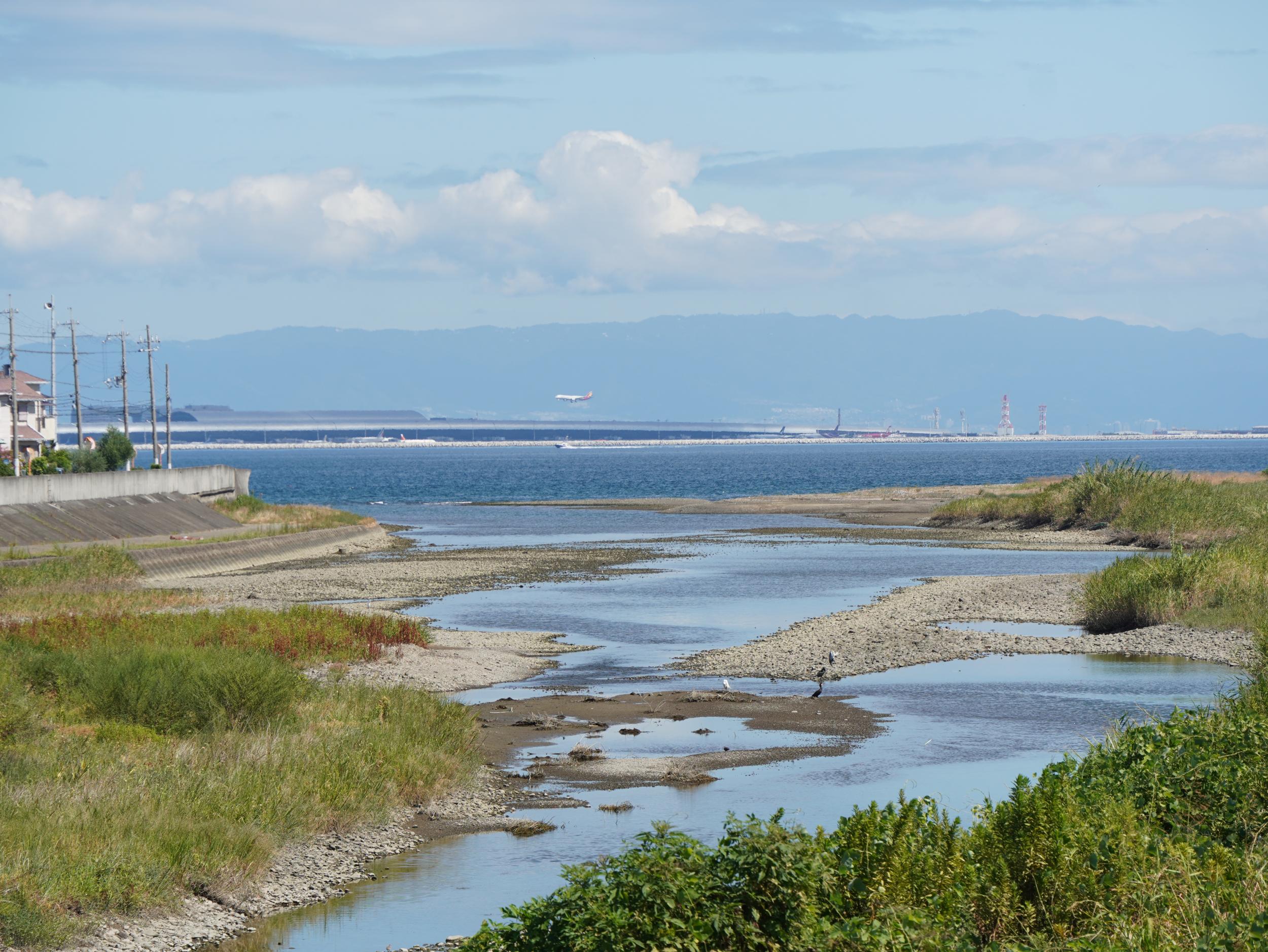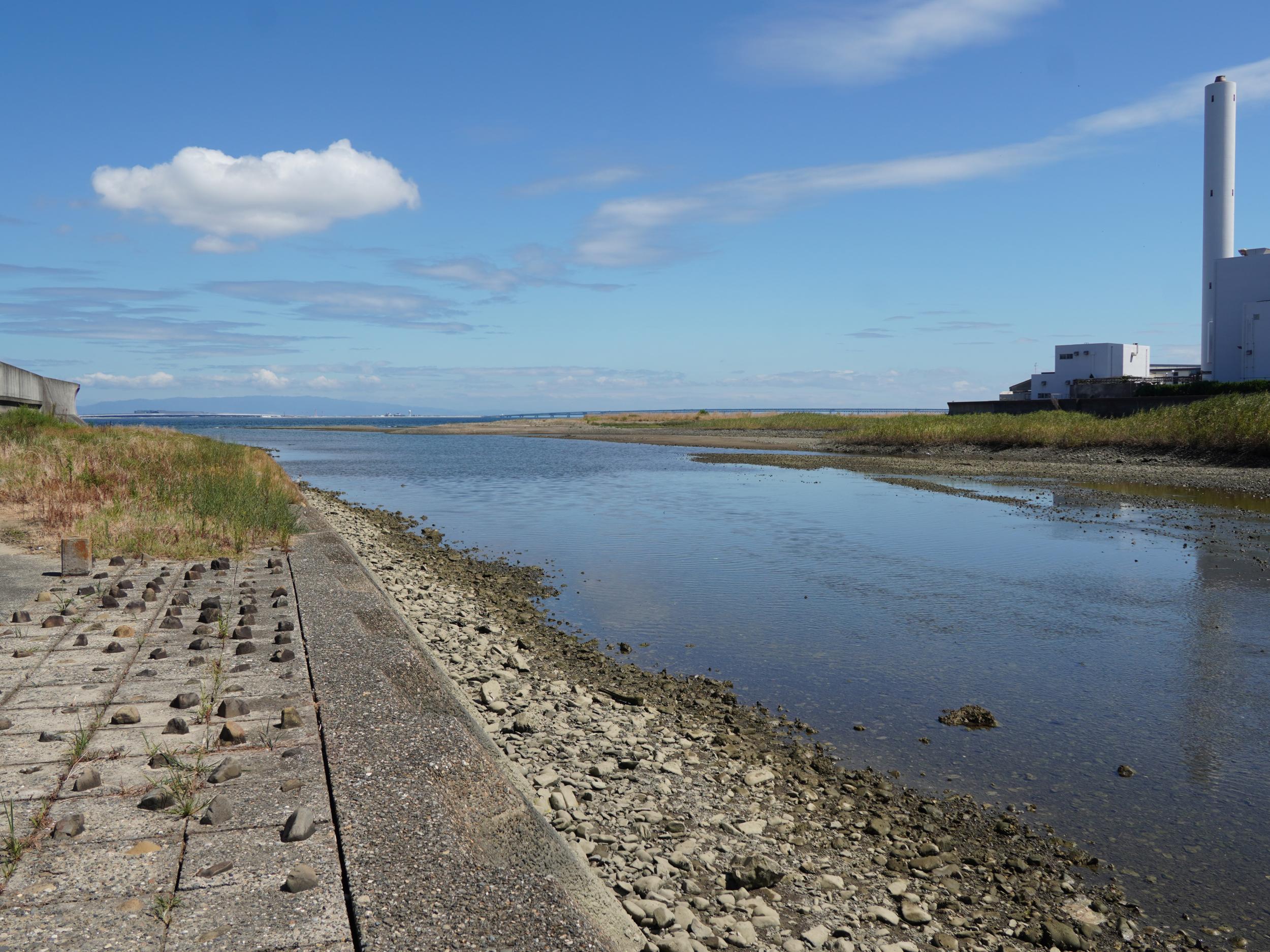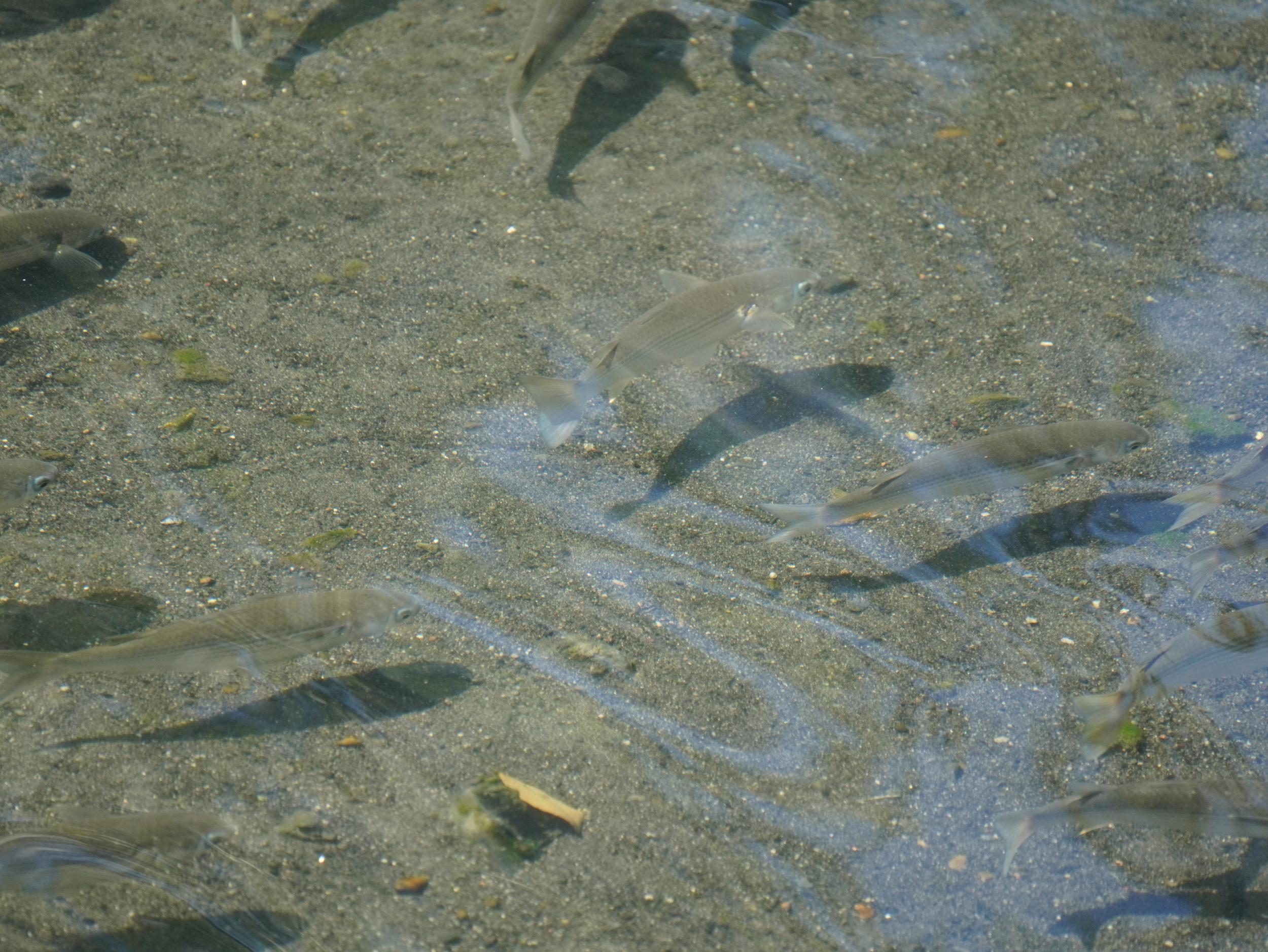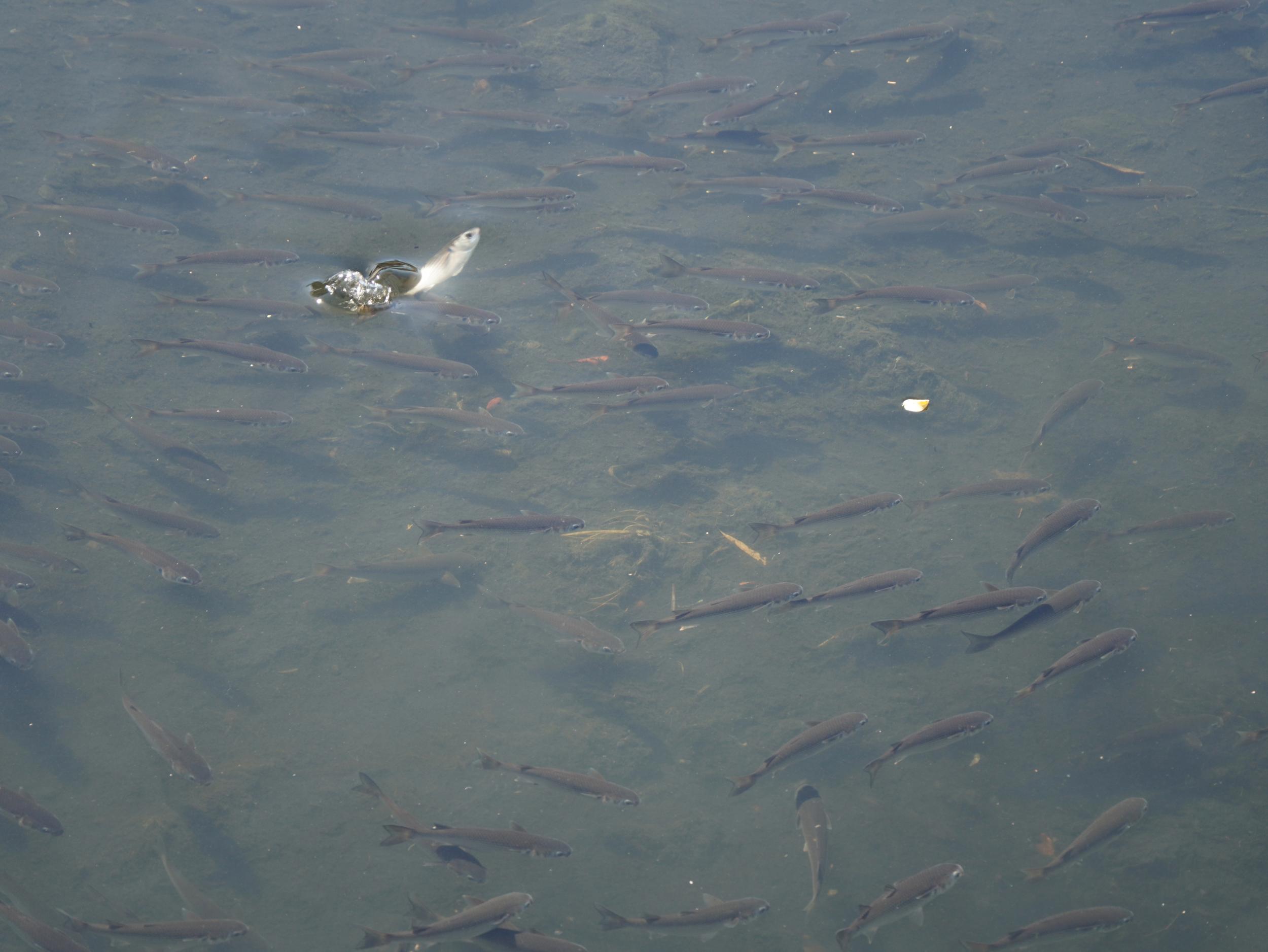 水路を南側へ遡ると水が綺麗になり、スバシリたちがくっきり見えます。そこかしこに大集団がいて、水路全体で千匹近くいそうです。2年前にその源流らしきを訪ねていますが、この水路は男里川とはつながっておらず、付近の地下水を集めて、緑道下の暗渠をくぐって男里川左岸河口のちょっと北側から大阪湾につながっているらしいと分かりました。Google Mapでも国土地理院地図でもこの水路の名前が出てこないのですが八反(はったん)川のはずです。