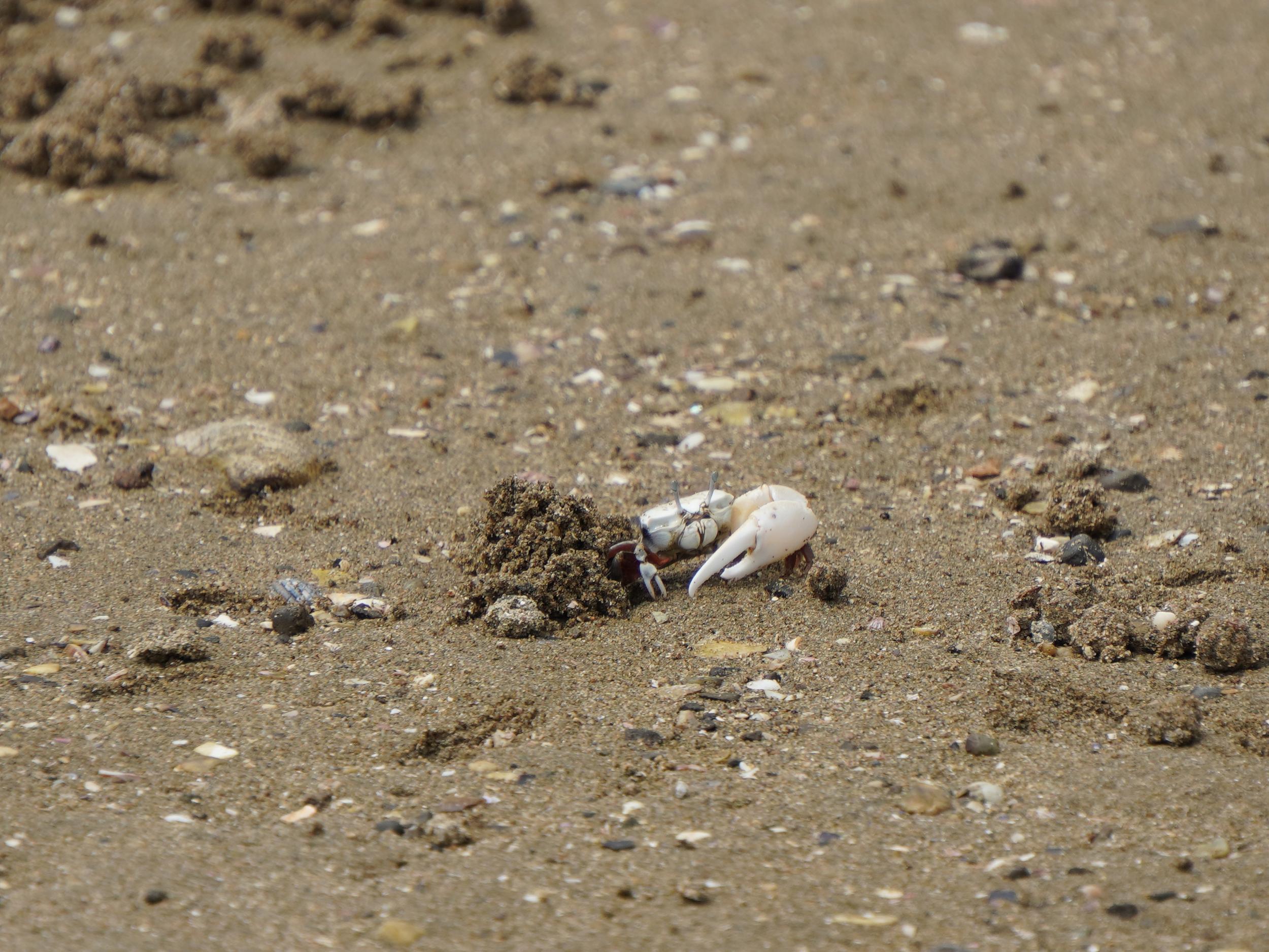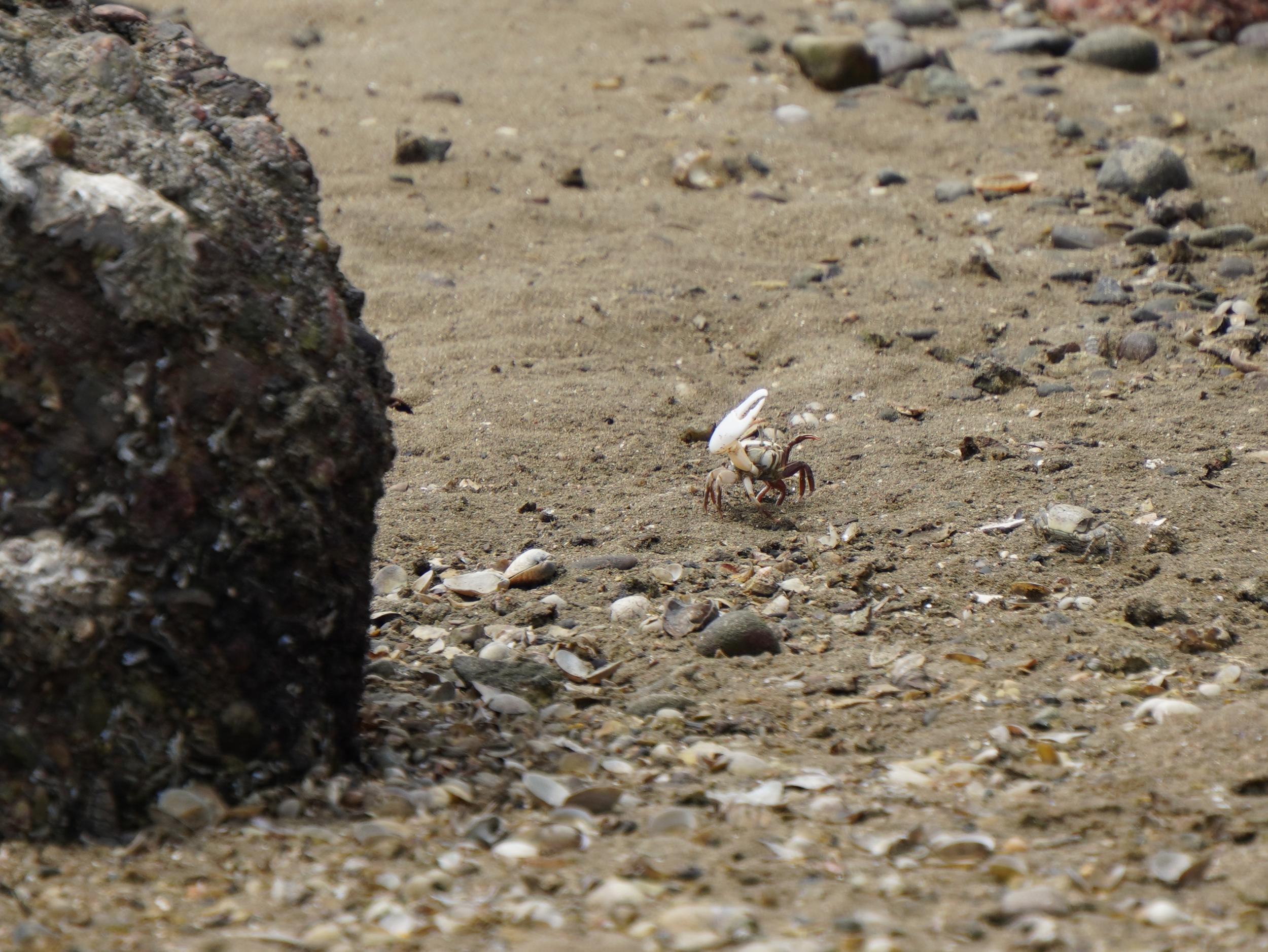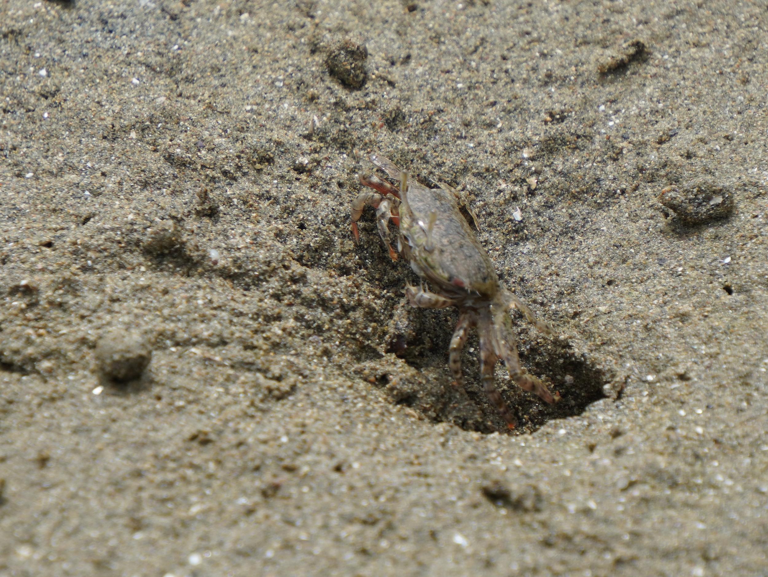 オサガニ科オサガニです。甲羅がすべすべしていて横に長いのも特徴的。泥の中にいるヤマトオサガニと砂の穴にもぐっているオサガニ、生態が全然違ってます。ハサミもかなり小さい。