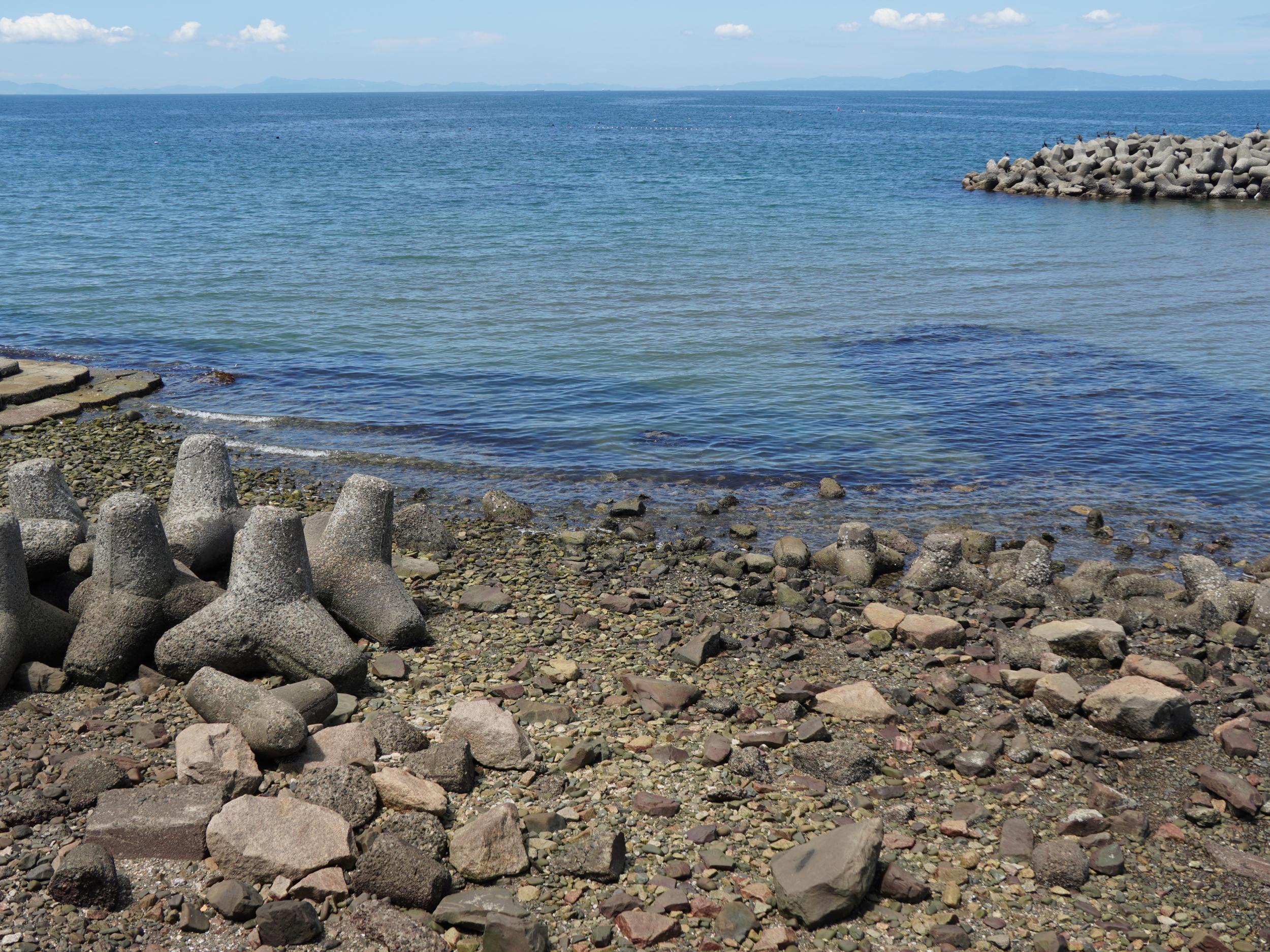 いつもは海面下の磯も潮が引いて石段の浜まで歩いて行けるようになっていました。透き通った水が綺麗。