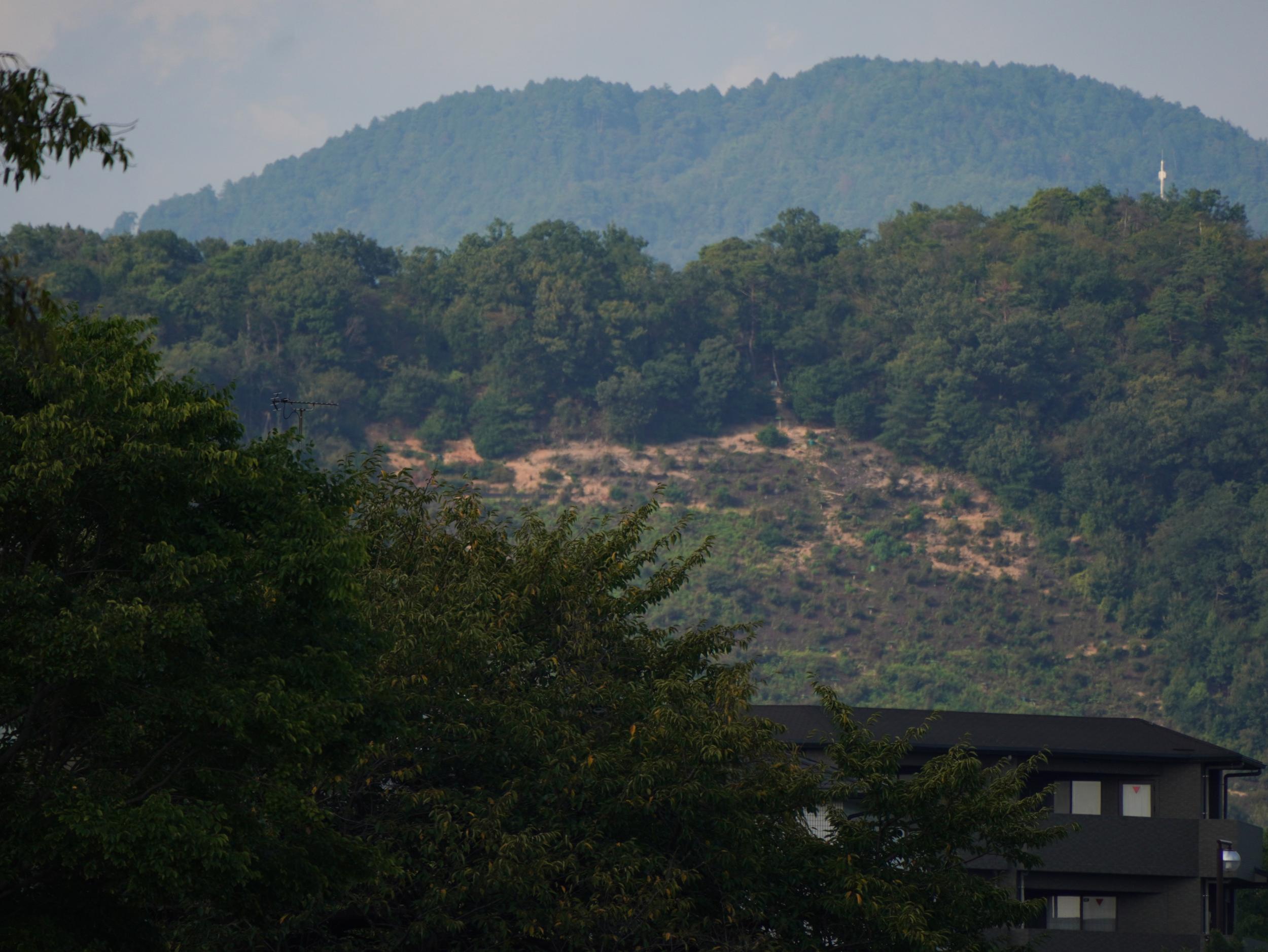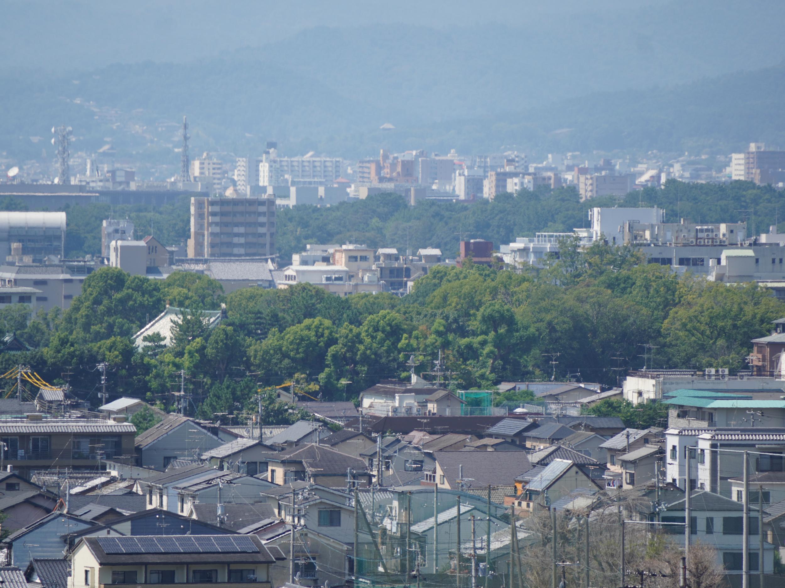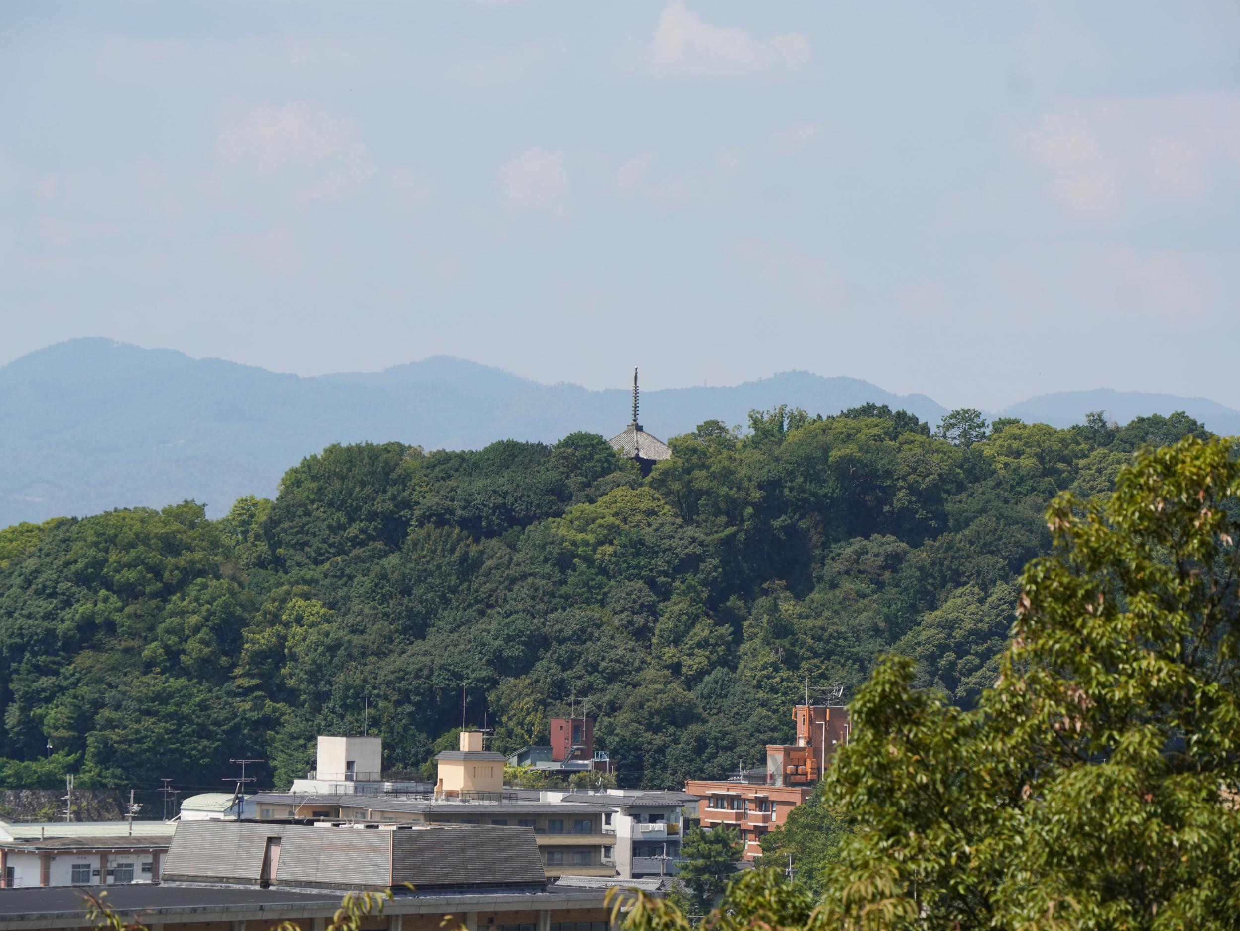 すぐ目に入ってくる金色の像は京セラ美術館で9月1日まで開催されていた「村上隆もののけ京都」展の「お花の親子」、展覧会は終了もまだ撤去されていない様子。その向こうに平安神宮の大鳥居、画面左端に岡崎動物園のレトロ観覧車が見えます。平安時代法勝寺の十三重塔が立っていた場所です。残念ながら5頭の象たちは見えません。