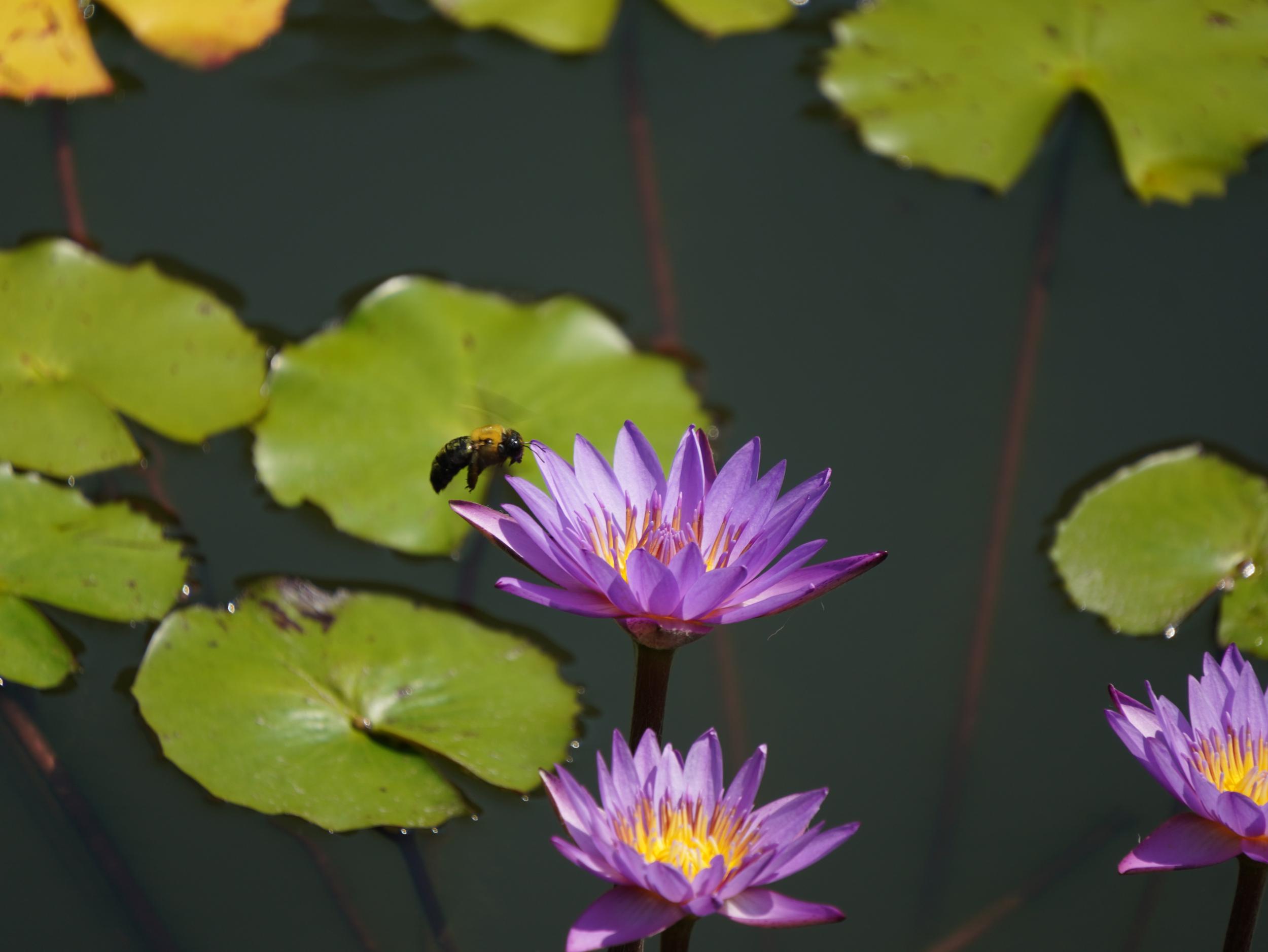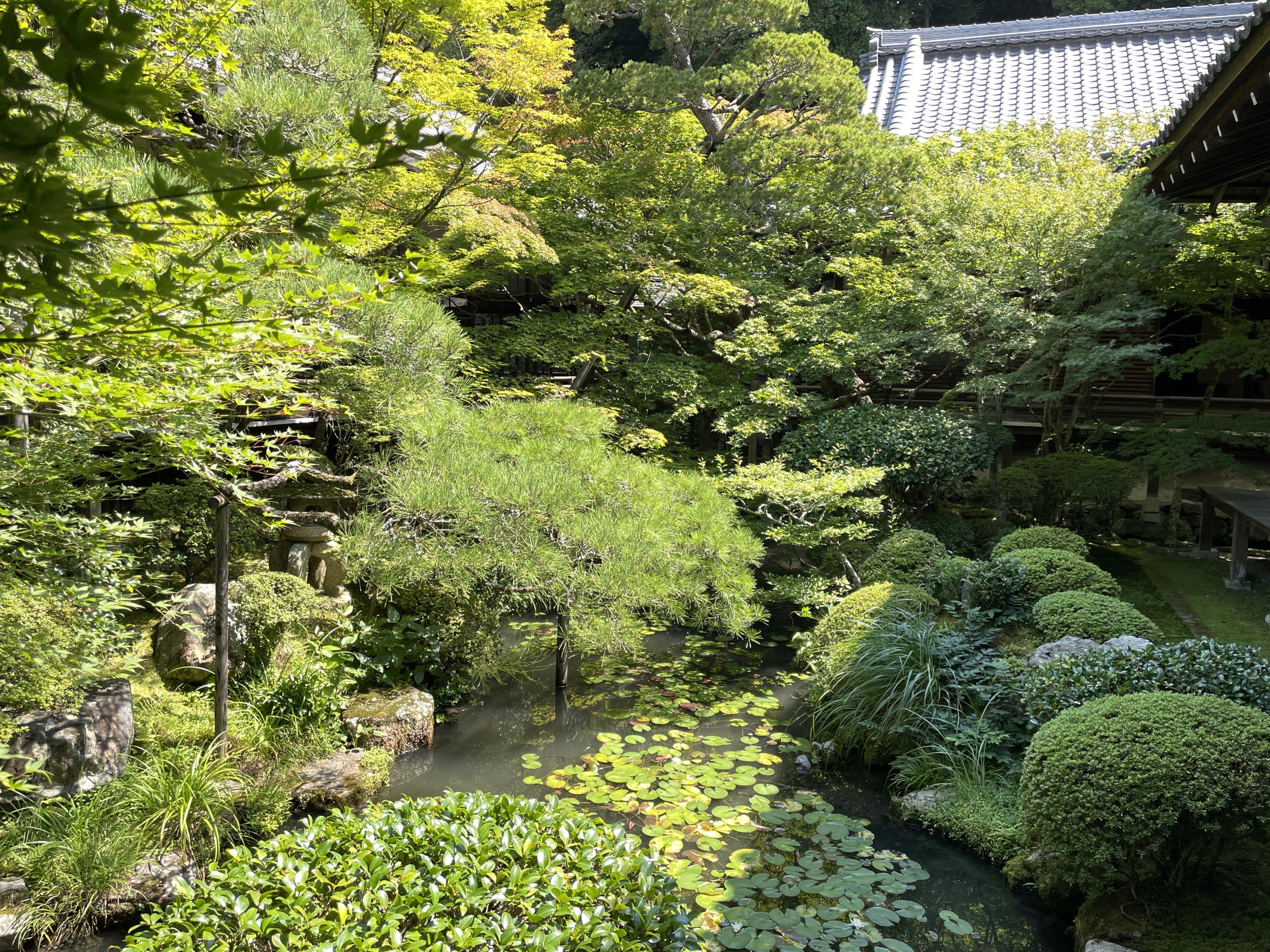 境内図の鶴寿台、釈迦堂、瑞紫殿、古方丈の4つの建物に囲まれた池のこちらからと向こうからの眺めです。