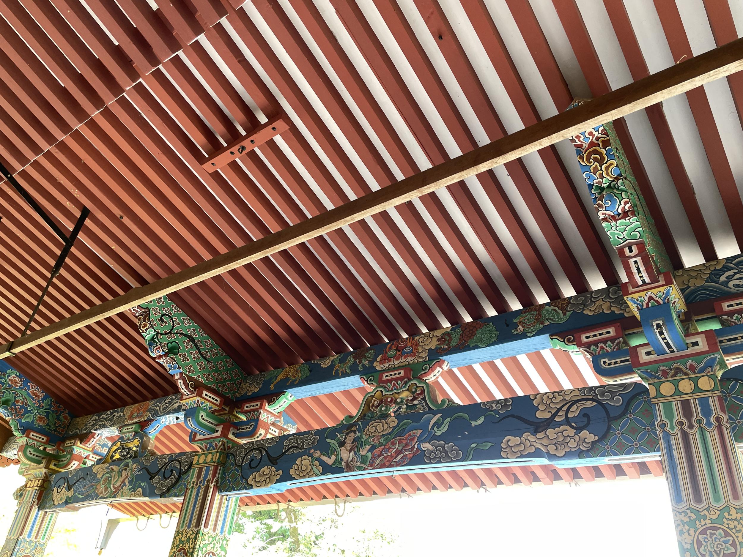 阿弥陀堂は四天王寺の曼荼羅堂を慶長12年豊臣秀頼が移築したもので、鴨居は極彩色、調査結果に基づき5年近くを費やし復元されたそうです。永観堂のウェブページで、鐶木瓜花久留子・切竹久留子文(かんもっこうはなくるす・きりたけくるすもん)と呼ばれる十字架をモチーフにした幾何学模様、と紹介されています。どうやら屋根を支えている緑色の部分がそれのようです。慶長12年といえばまだ禁教令が出される前のことで、キリスト教に関わる文化がこのように継承できたものと推測します。