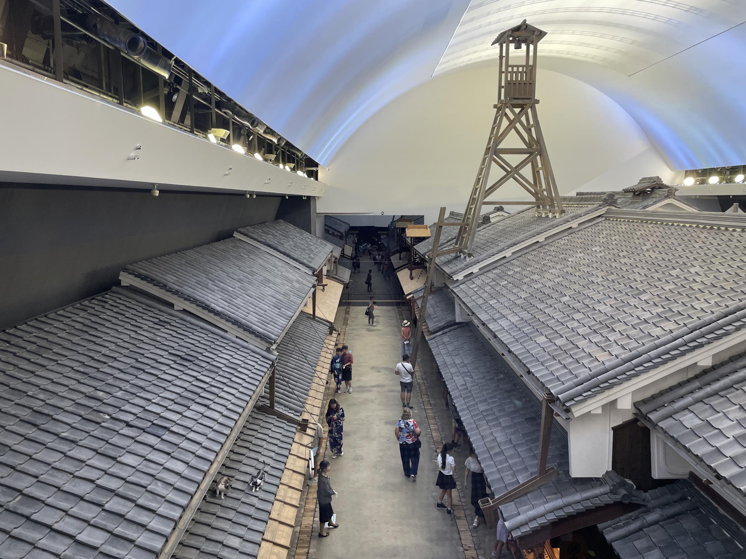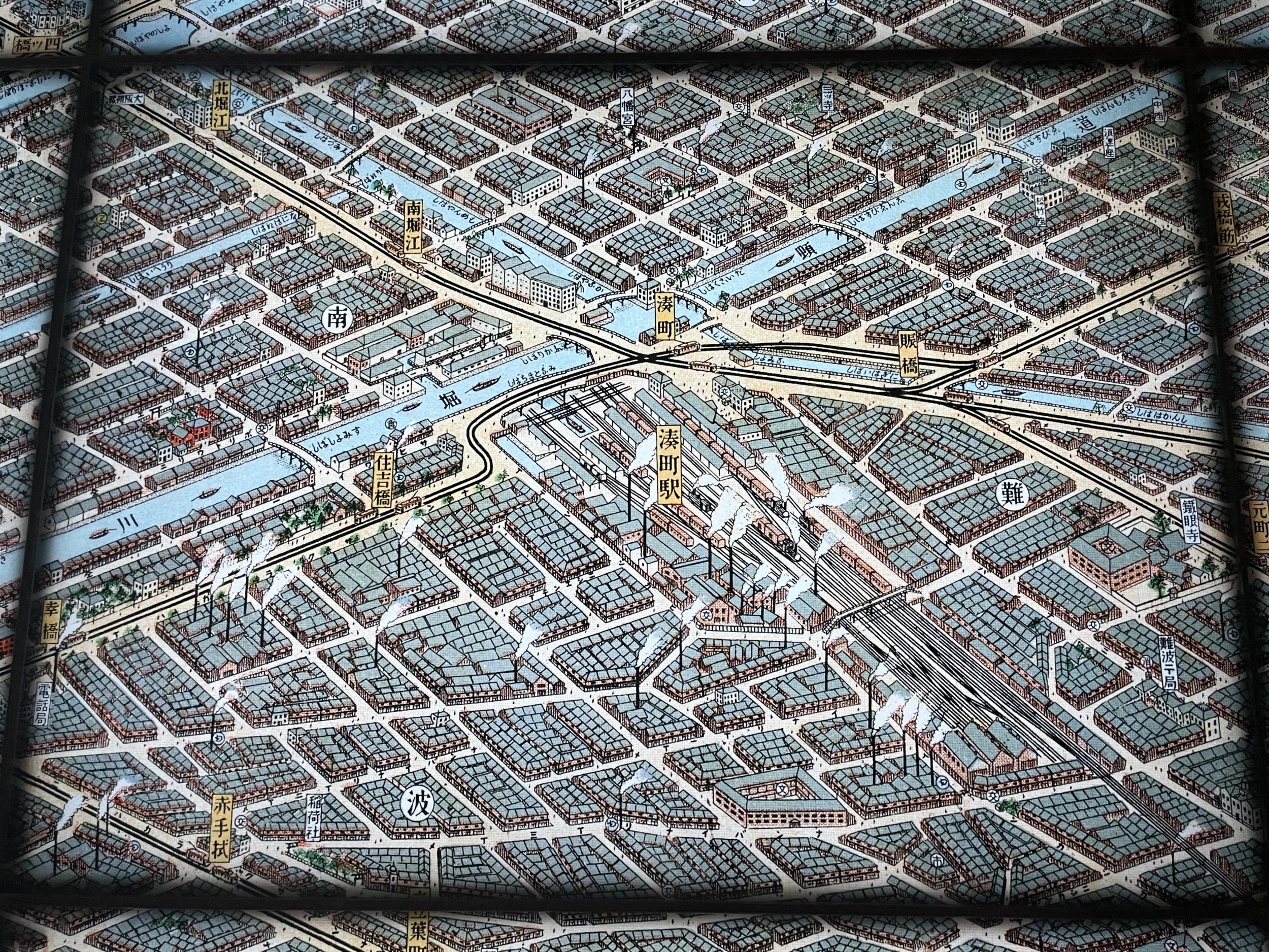 6年前にも大阪市パノラマ地圖の特大JPG(地図のダウンロード元はリンク切れも、国際文化センターサイト等で見つかります)でタイムトラベルをしていますが、今昔館の床の地図はフレームで区切られてはいるものの、高精細で大きく拡大され強化ガラスにプリントされているので、JPGよりずっと鮮明です。