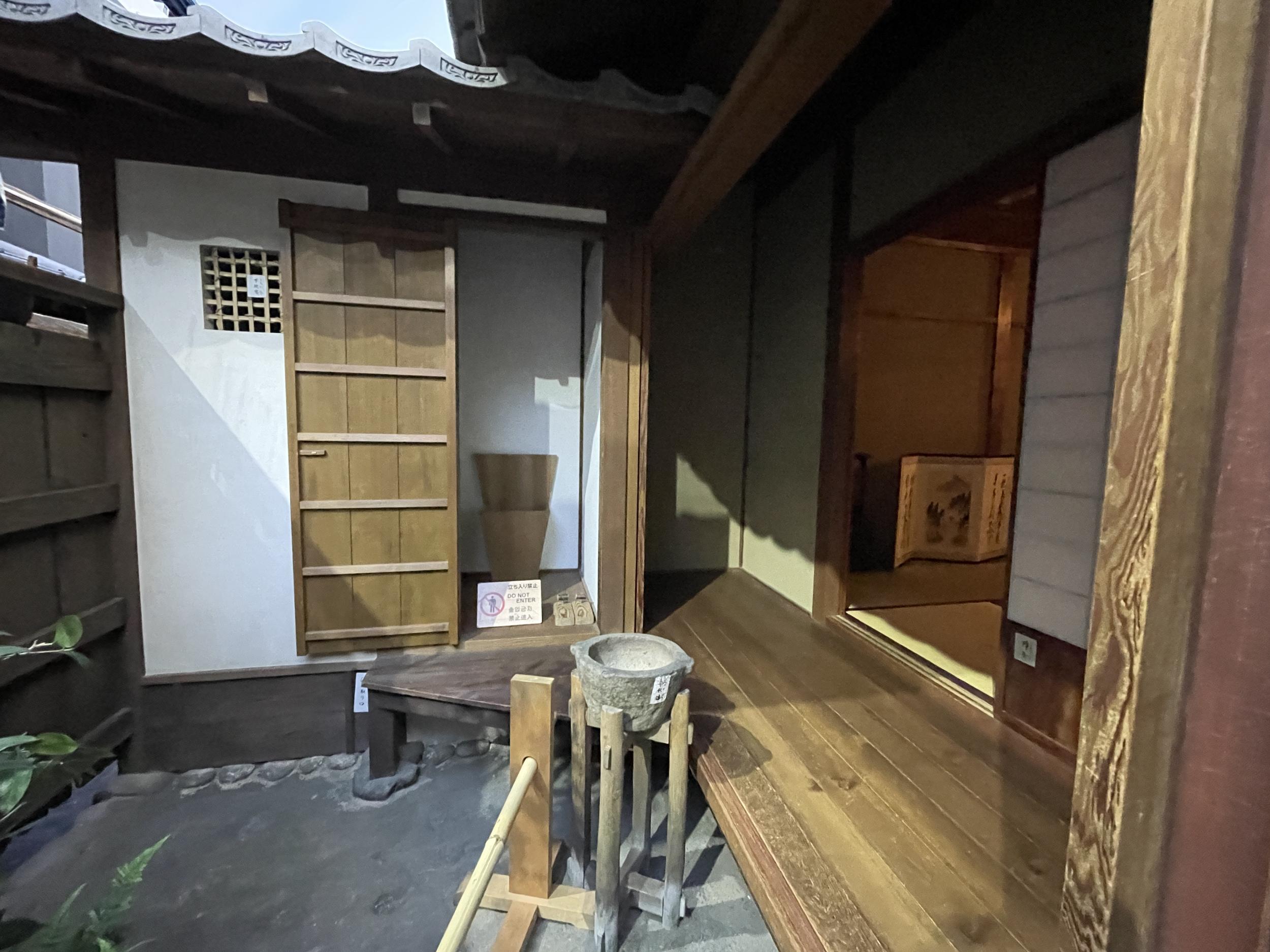 商家の板の間のレプリカじゃなくて本物と思われる段梯子、座敷の縁側の雪隠と手水、こんなに広いものではないですが、同じ構成が自分の実家にもありました。6年前にも同じようなカットをアップしていました。