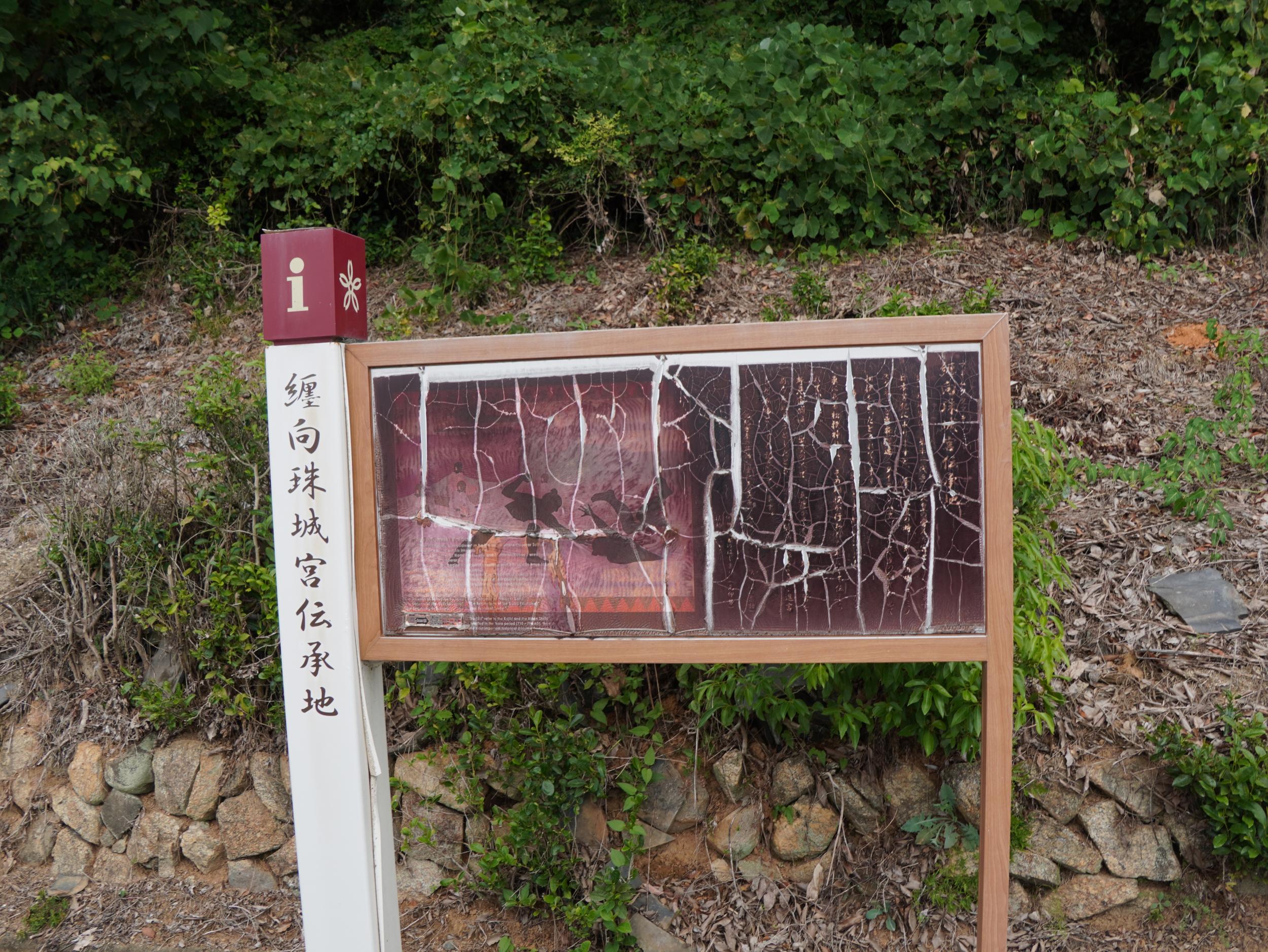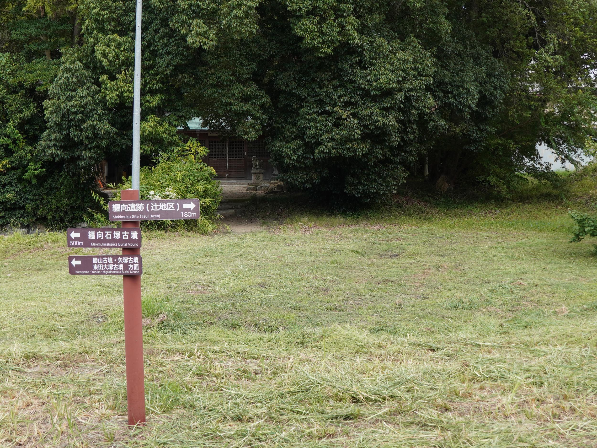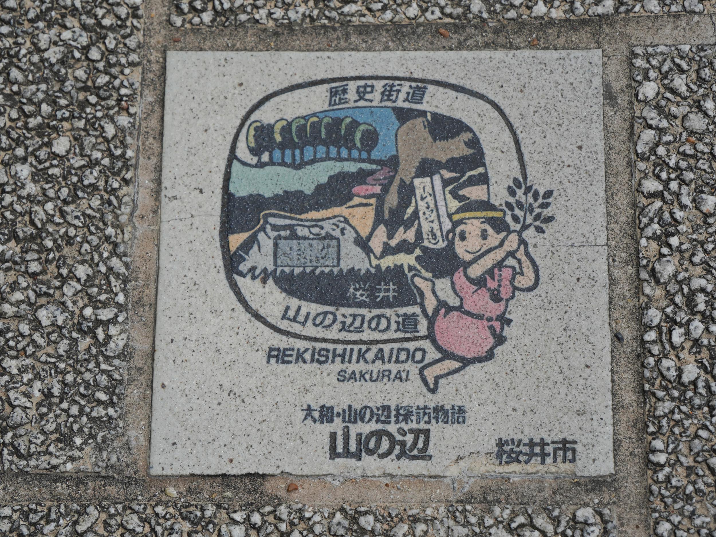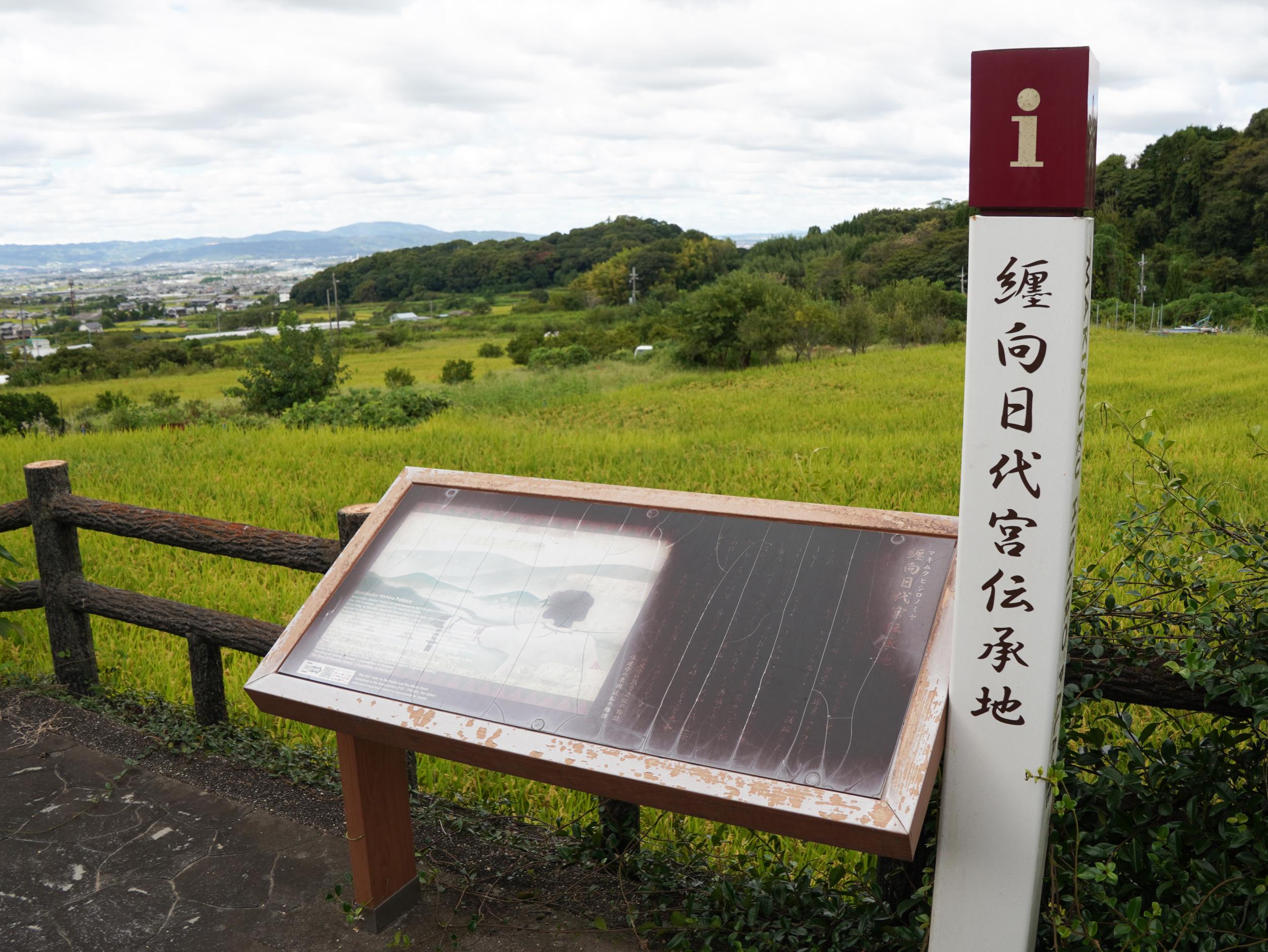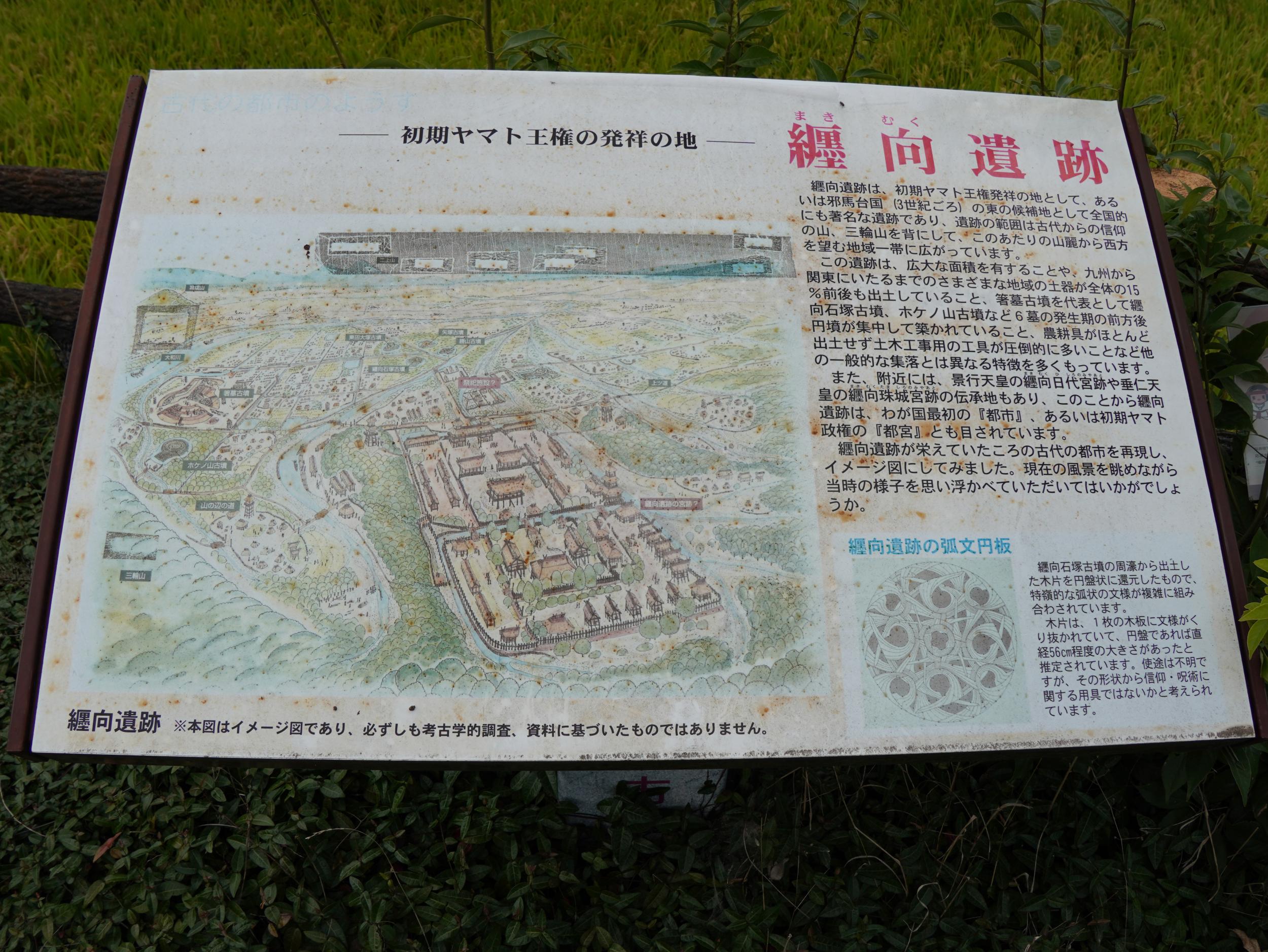 2枚の案内板があって1枚は景行天皇纒向日代宮伝承地の案内も劣化して全く読めません。Google Mapにアップされた写真で、倭建令が九州の熊襲や出雲、東国へと遠征しその帰途に「大和は國のまほろば たたなずく青垣 山ごもれる 大和し美し」と詠んだことが紹介されています。右手のイラストは大和を愛でる倭建令の後ろ姿と分かりました。アップされているのが去年の12月なので案内板は劣化じゃなくて汚れているだけのようです。