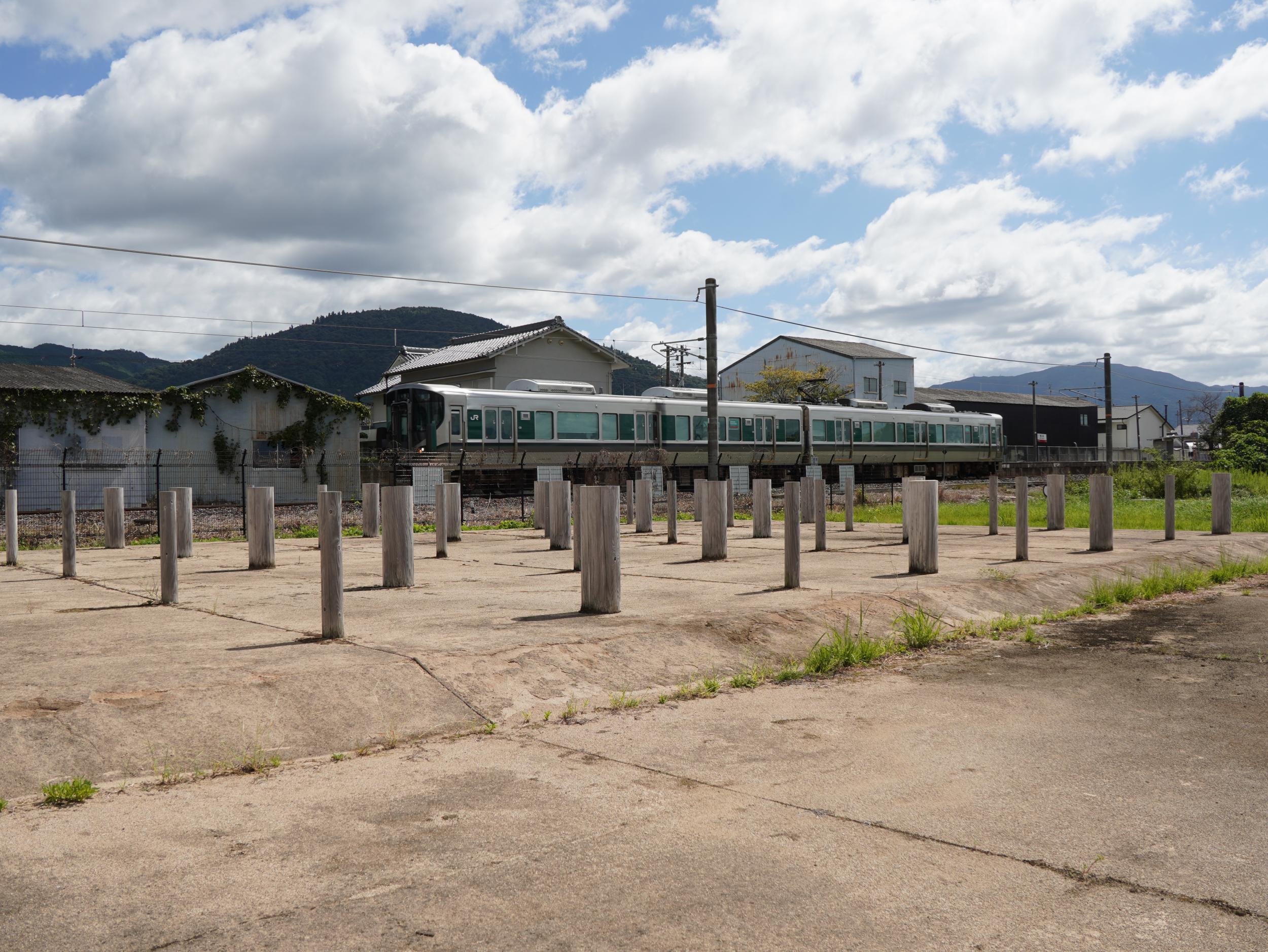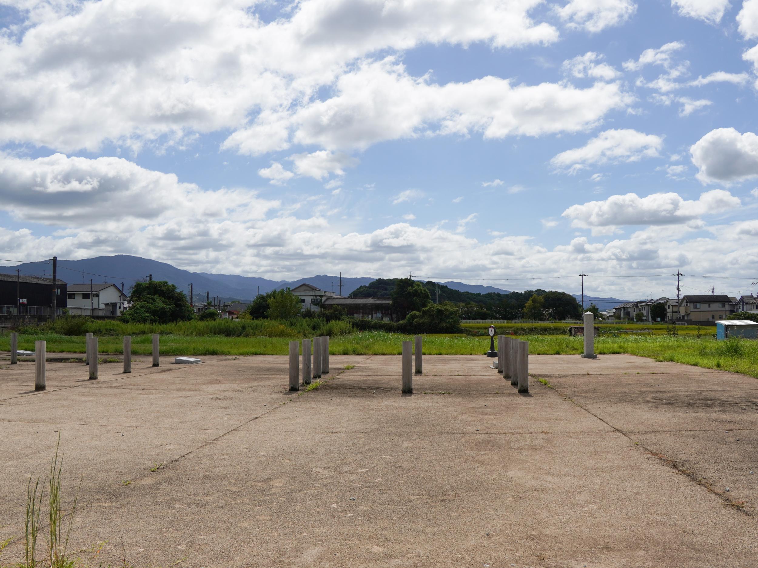 画面左端に音羽山を遠望できる遺跡の南側、石の杭真向のひょうたん島のような森は箸墓古墳、前方後円墳を真横から見た様子がよく分かります。5年前に箸墓古墳の周囲を歩いて宮内庁の大市墓の立札も見ており、少なからず記録があるはずと思い今日はパスしてしまったのですが、廃止直前だった105系や103系電車ばかりで箸墓古墳や箸中大池は殆ど写真を撮っていませんでした。
