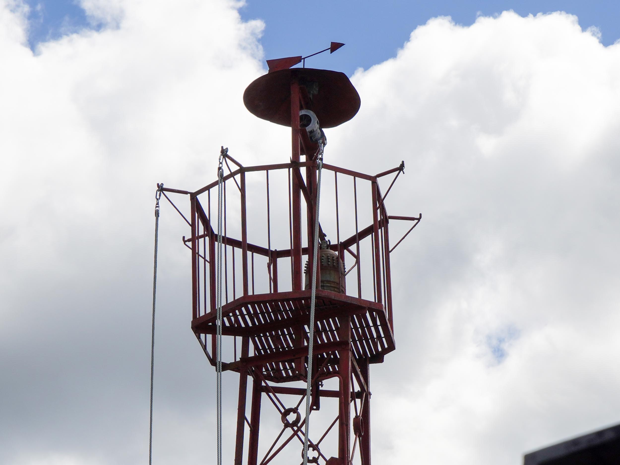 大きな土蔵や土塀の民家が密集する穴師集落の火の見櫓です。櫓の上に半鐘が置かれているのが見えます。砲筒のようなものはたぶん放水銃。