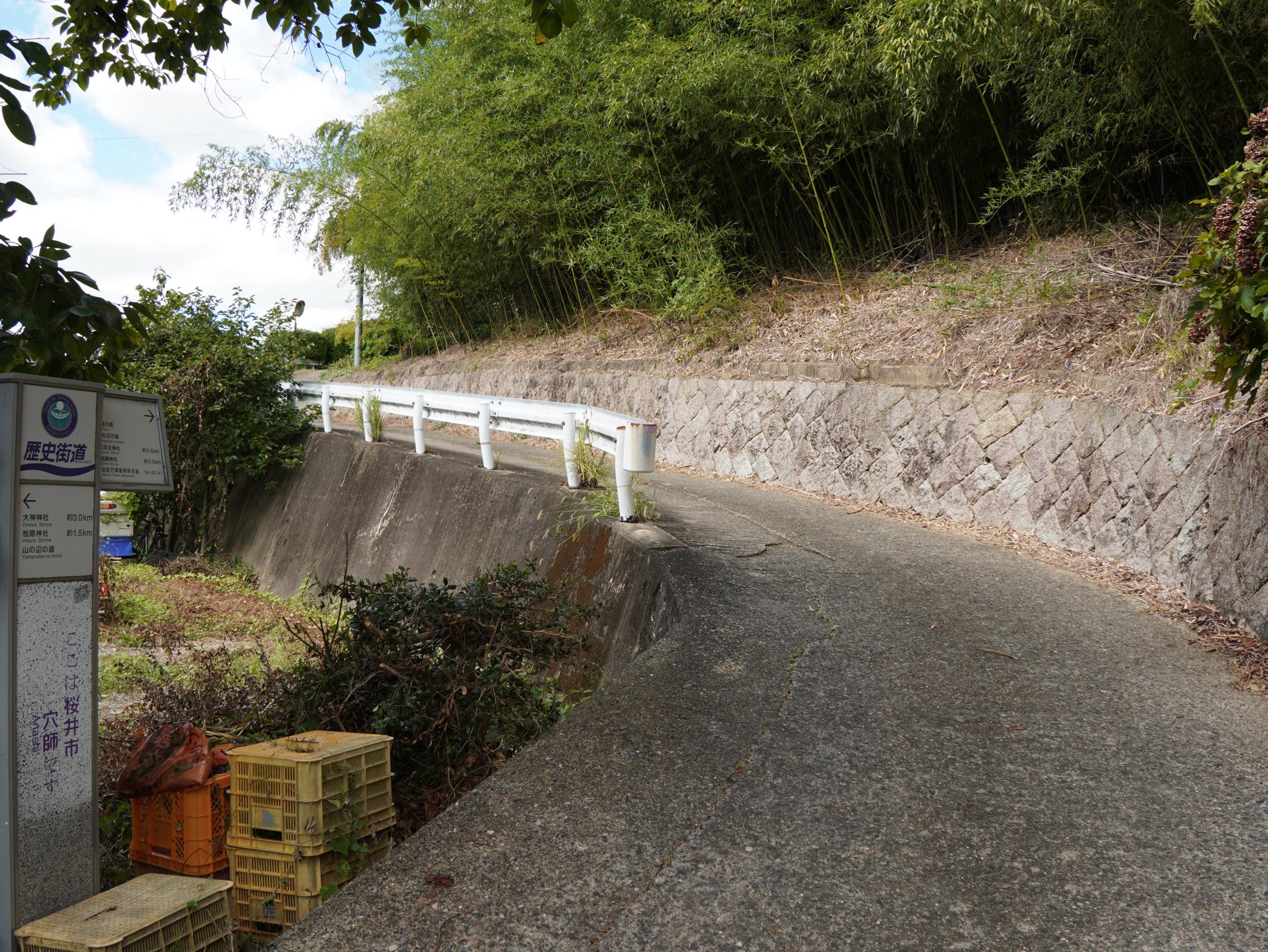集落を抜けると見覚えのある無人販売所のある三叉路に出て来ました。山の辺の道です。春に訪ねた相撲神社の方へ行きたかったのにひとつ南側の谷にいることに気づき、山の辺の道の急な坂道を北へ向かいます。