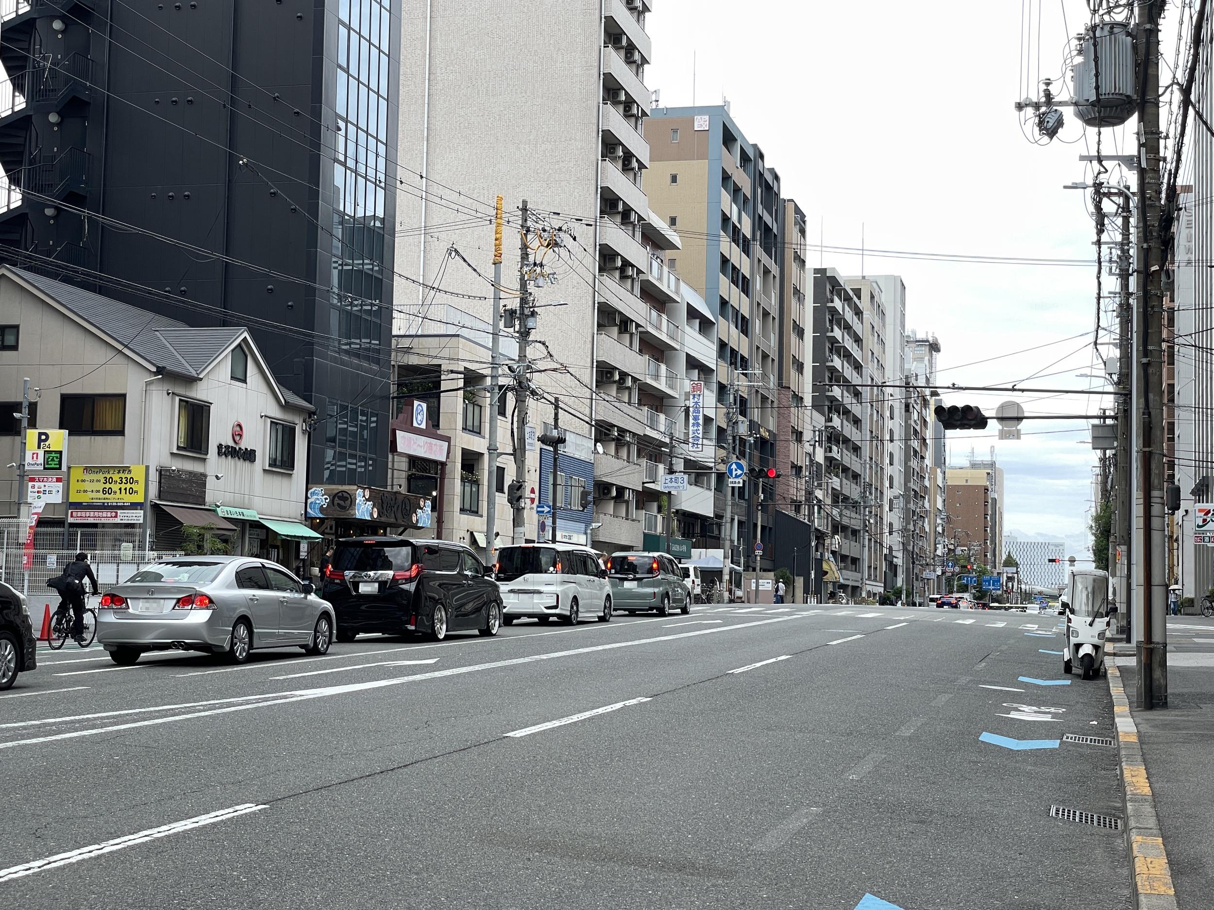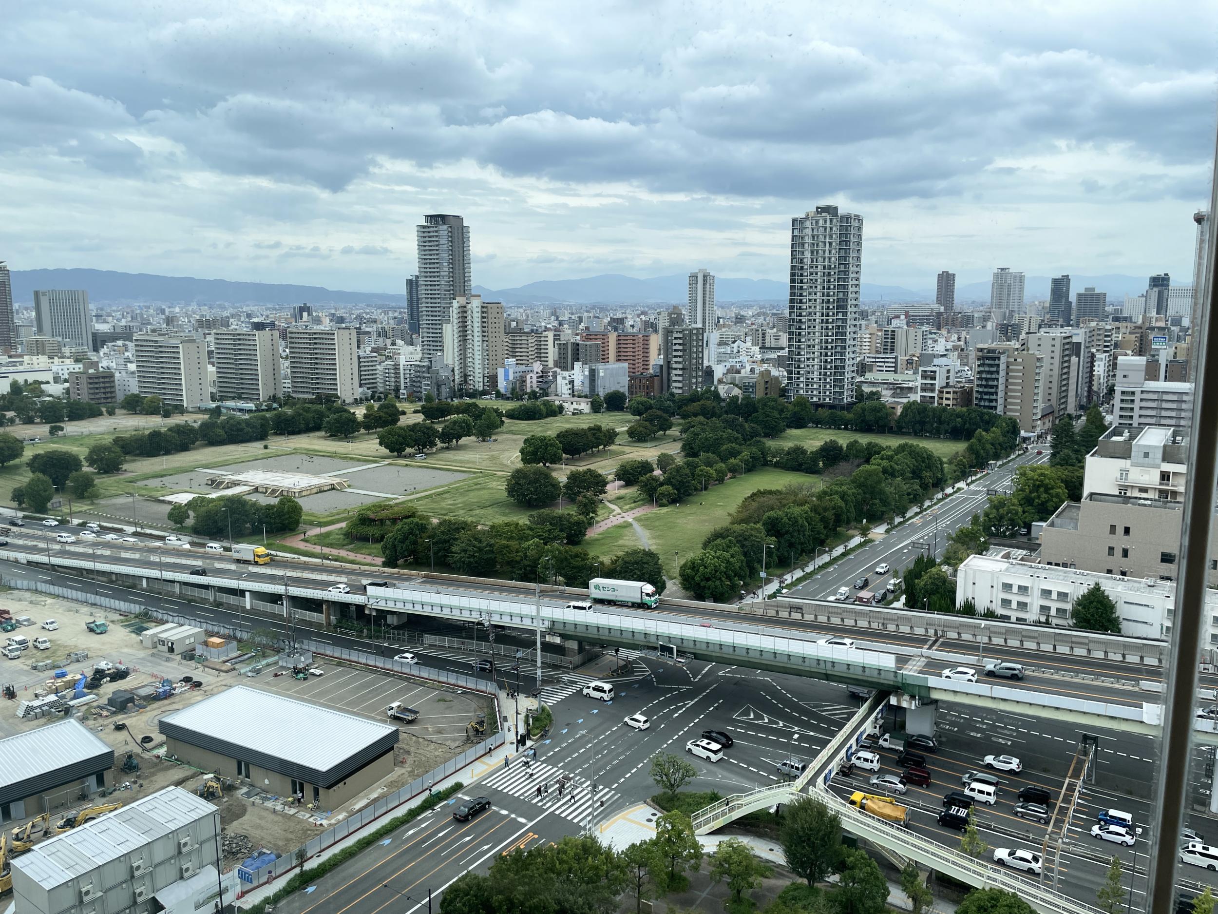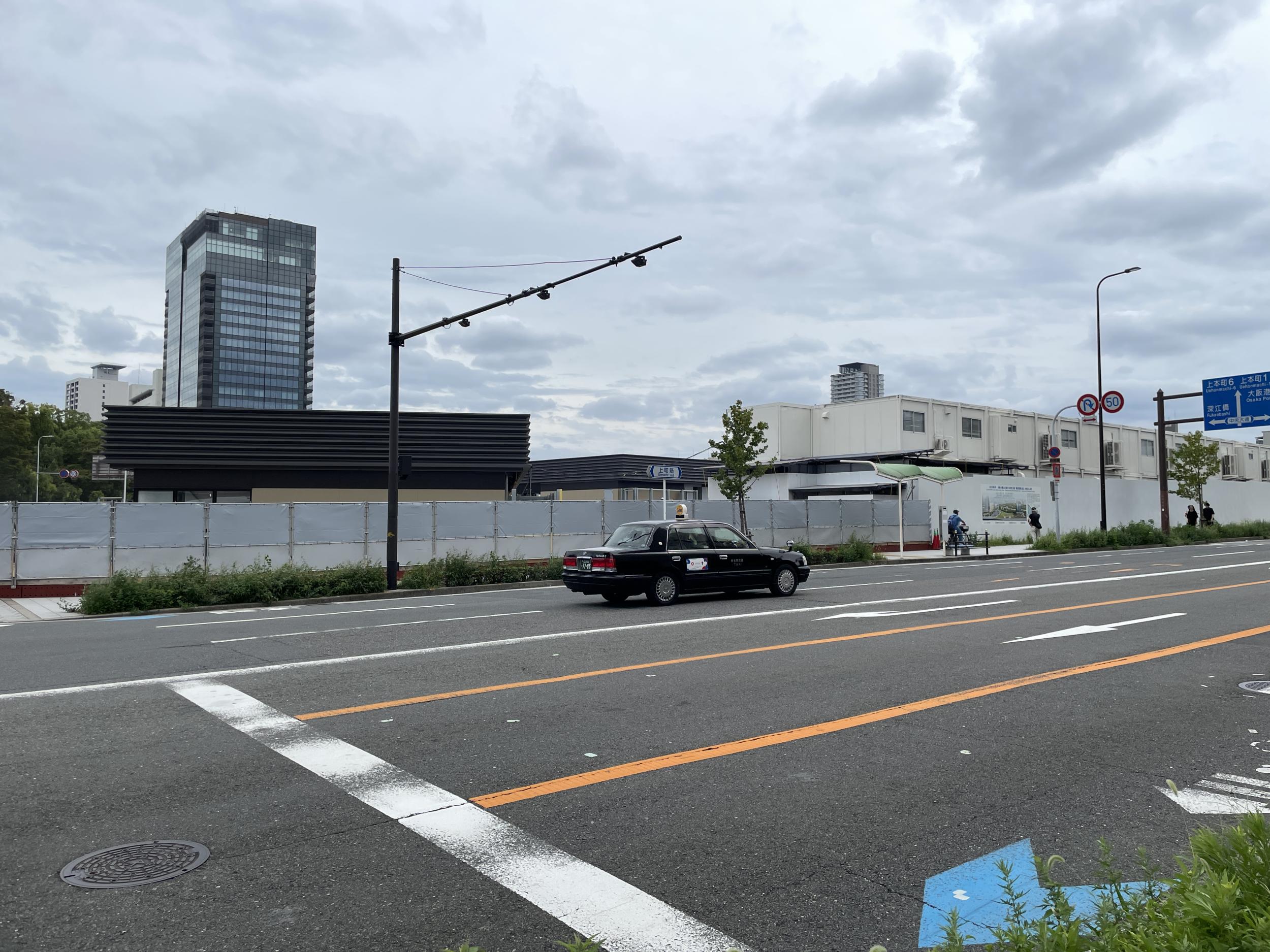 馬場町交差点の向こう側の工事が進んでいて建物も立ってます。難波宮跡公園北部ブロックというらしく来年4月開業の予定と分かりました。フェンスの向こうはカフェやレストランになるようです。