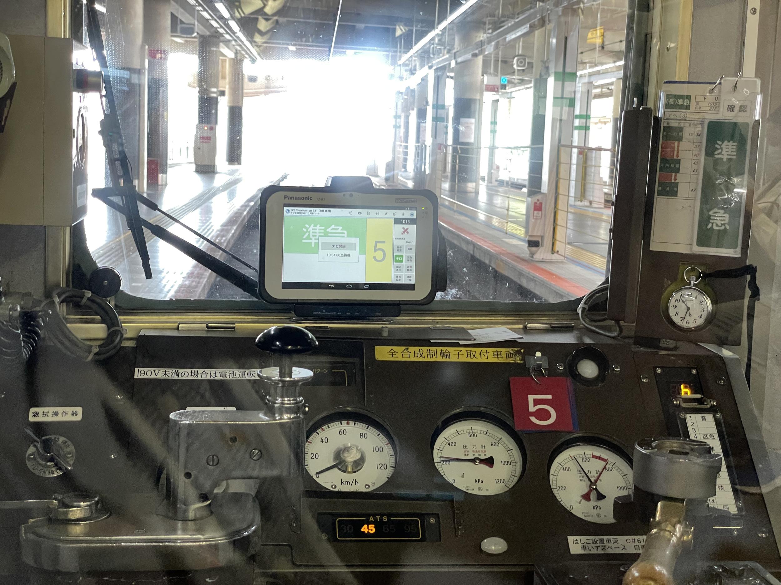河内長野行準急6020系6073の運転台、定位置に置かれた懐中時計がカッコいい。