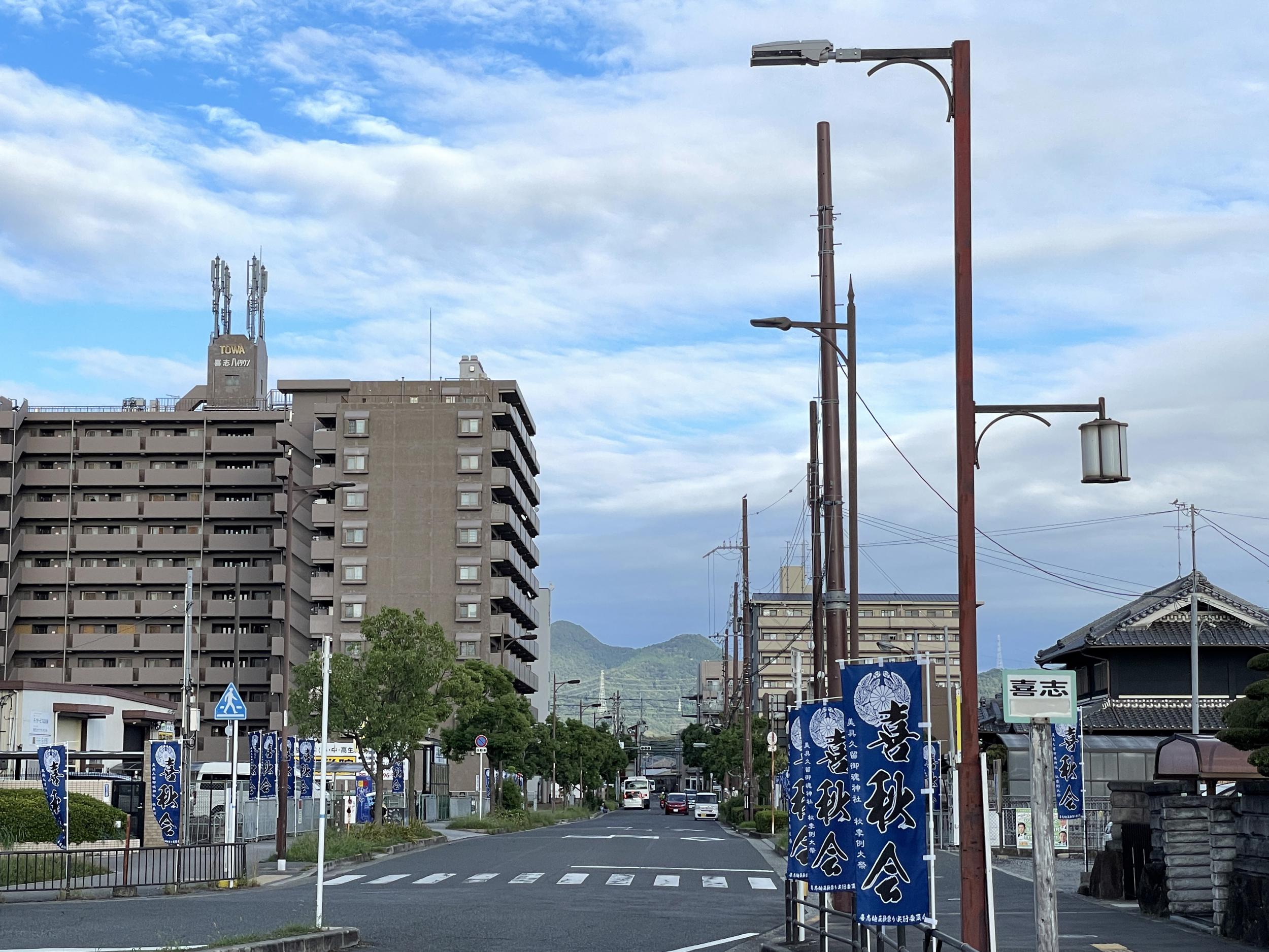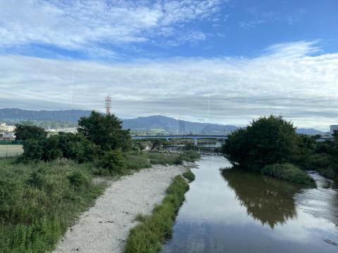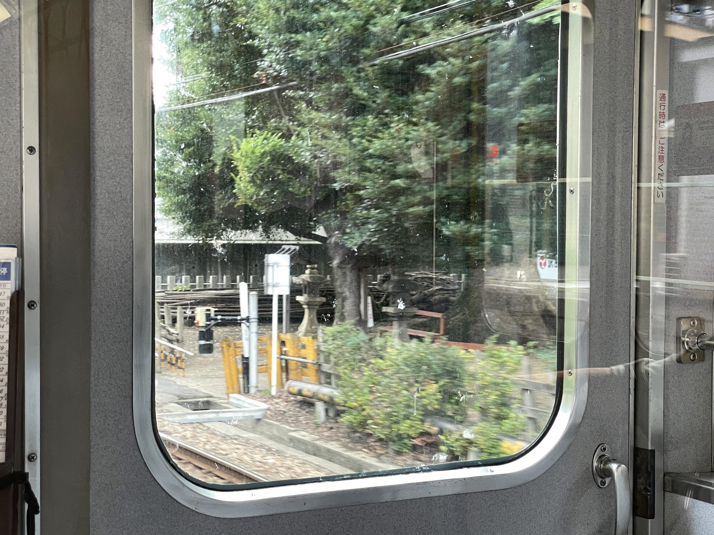 土師ノ里の手前で澤田八幡神社境内の踏切。踏切側から電車を見るとこんな感じです。土師ノ里の地名は埴輪を発明し垂仁天皇から土師職(はじのつかさ)を賜ったと日本書紀にある土師氏の本拠地がこの周辺に位置していたことに由来。