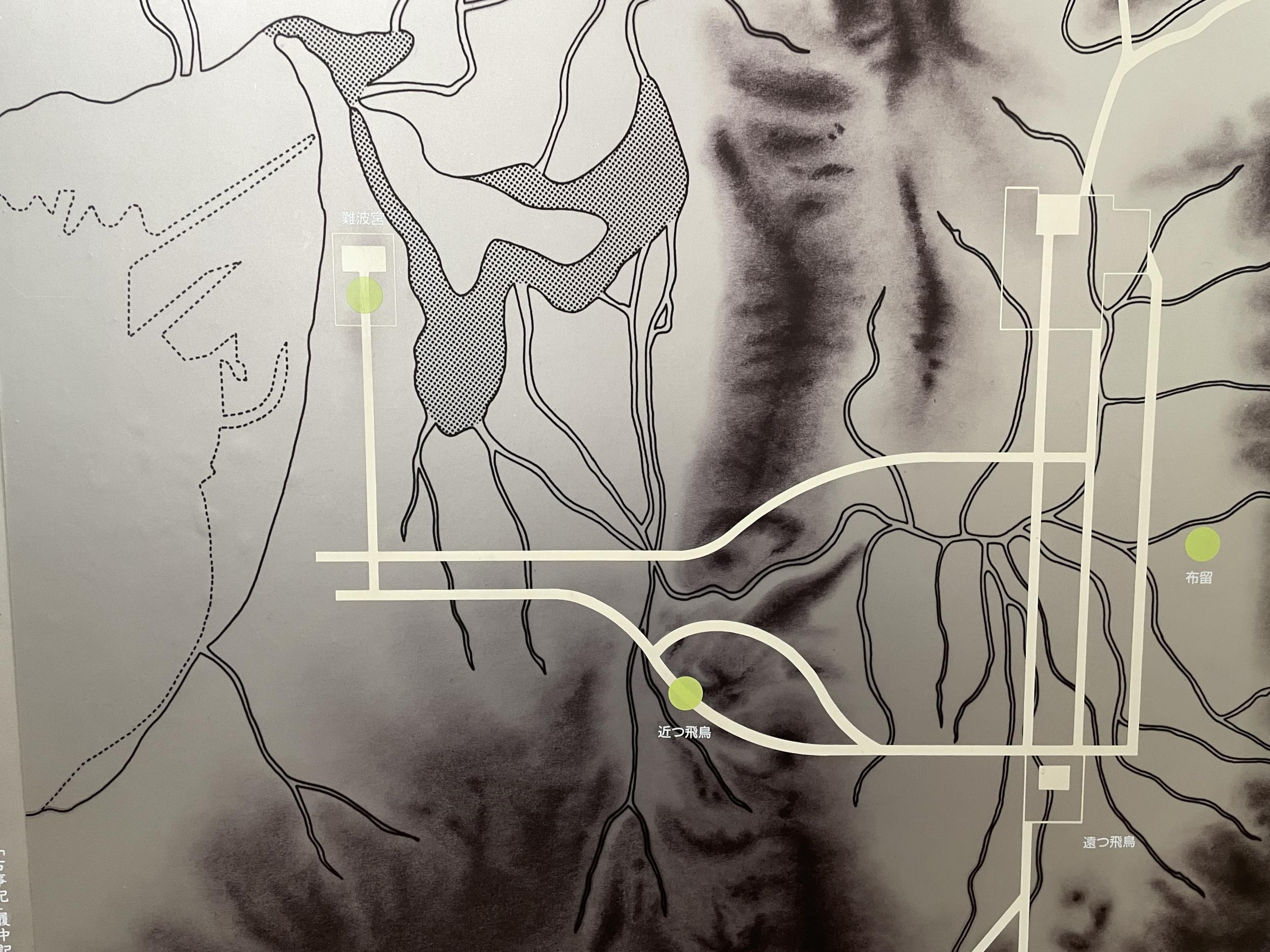 二上山の西麓が近つ飛鳥、明日香村が遠つ飛鳥です。その位置関係を示した地図では河内湖からの川の流れが示されています。今も遠つ飛鳥と近つ飛鳥のいずれにも飛鳥川という名前の別の川が流れていて、藤原京付近から明日香への遠つ明日香の飛鳥川沿いをレンタサイクルで、駒ヶ谷から上ノ太子へ近つ飛鳥の飛鳥川沿いは徒歩で歩いたことがあります。地図の右端にある布留(ふる)はパネルの神話に登場する石上神社のある場所です。