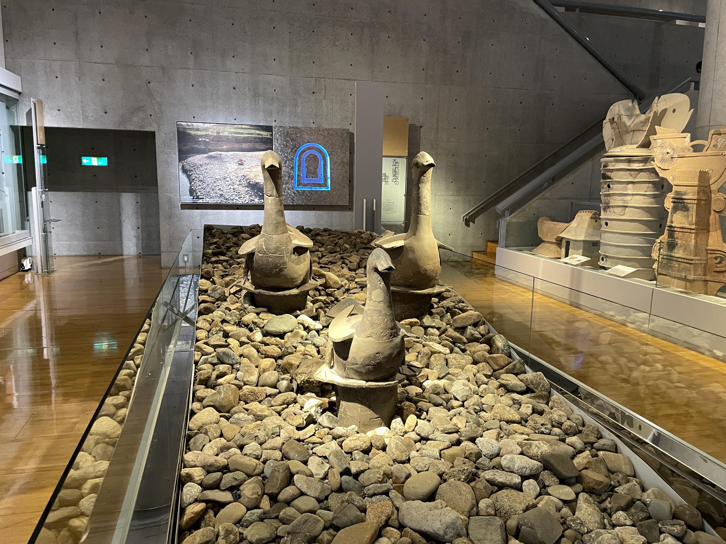 近つ飛鳥風土記の丘に広がる一須賀古墳群からの出土品の数々。明らかにレプリカと分かる金銅製沓の本物はどこかに大切に保管されていて、こんな感じのはずです。