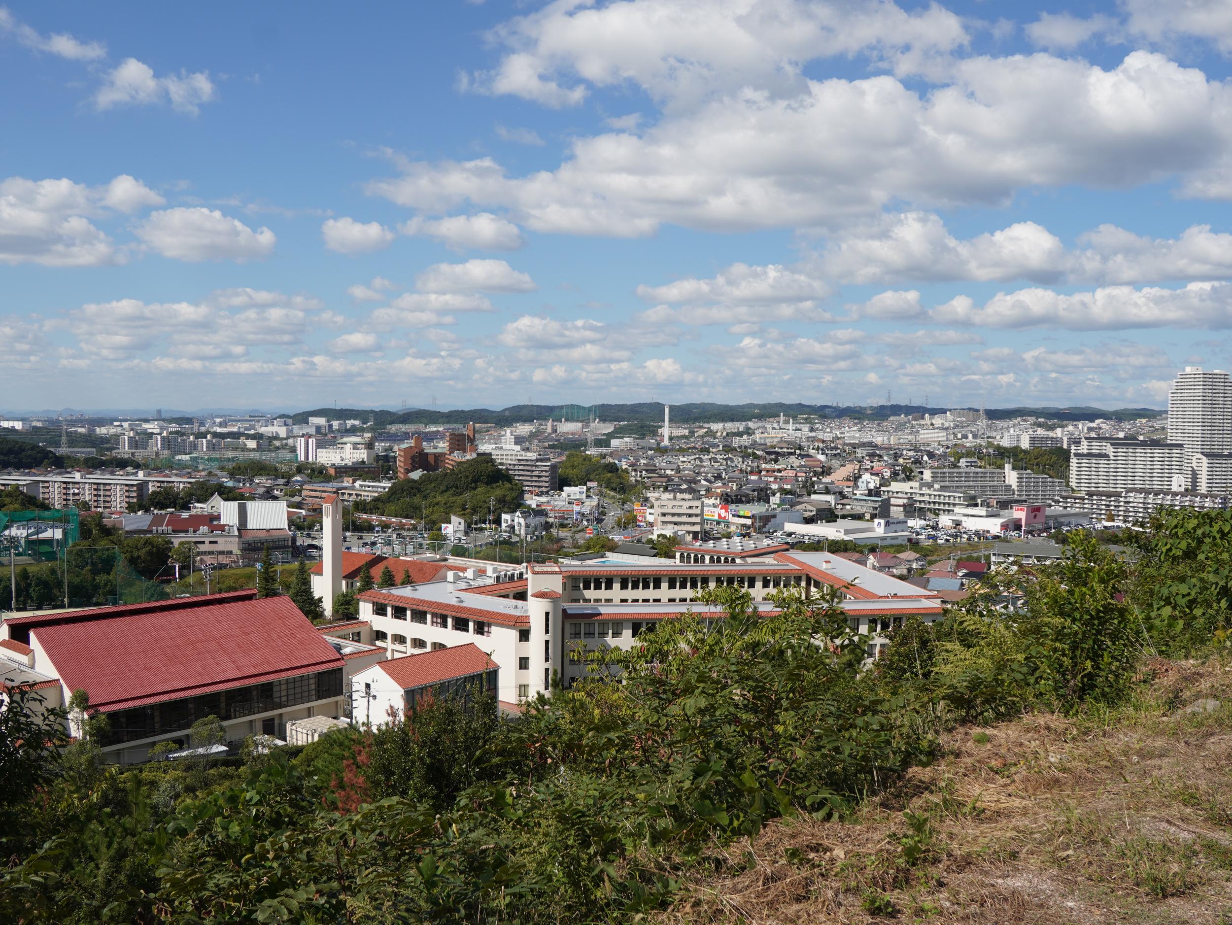 丘の真下は啓明学院、細長い塔の三角屋根に十字架が見えるミッションスクールの中高一貫校です。調べてみると何と我が母校の系属校と分かりました。創設者ランバスファミリーで共通する関西学院、啓明学院、広島女学院、聖和大学でランバスリーグを構成しているそうです。