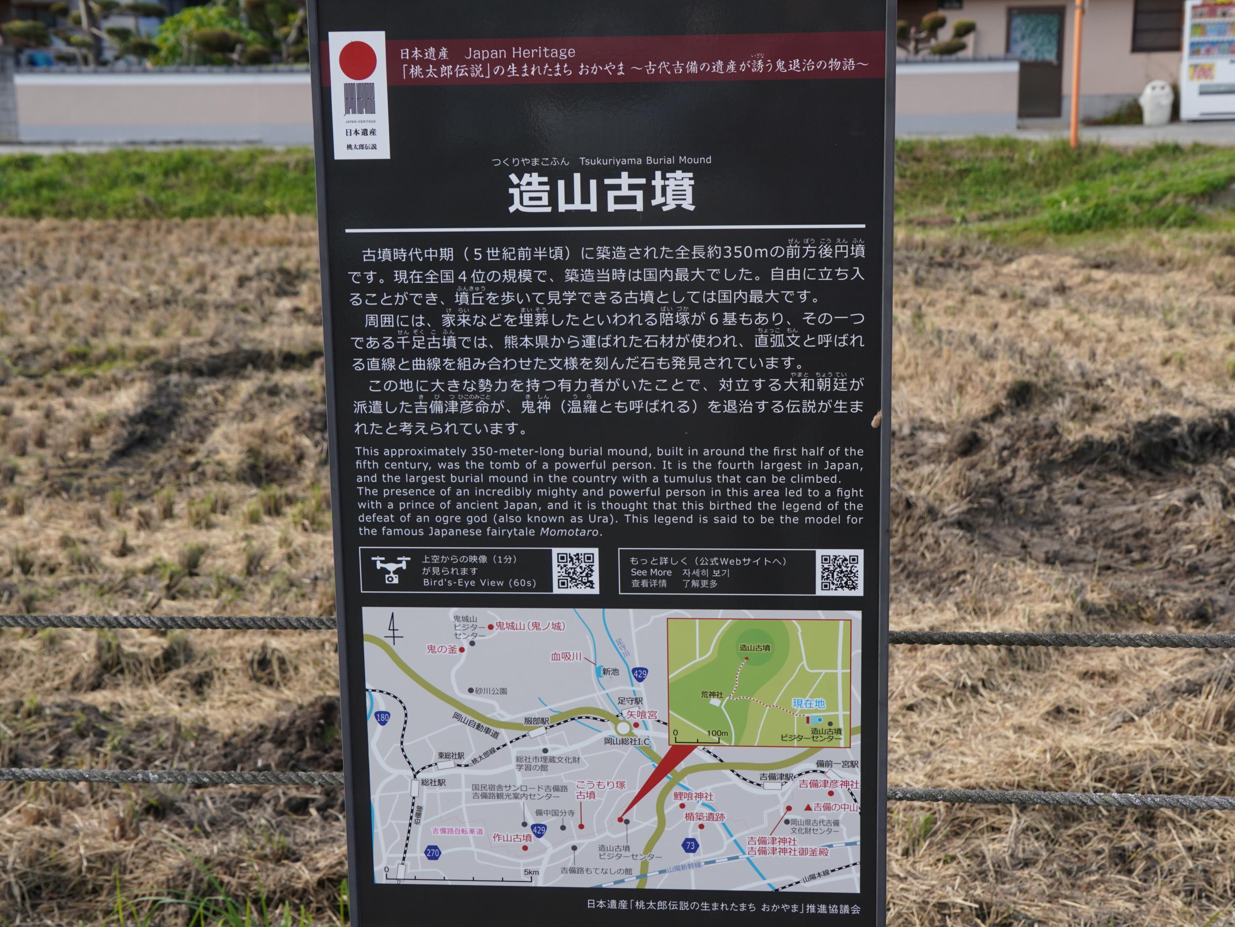 古墳時代中期(5世紀前半)の築造、仁徳天皇陵より少し前で、築造時は全国最大規模だったことになります。案内板のQRコードでドローン撮影の造山古墳の空からの様子を見ることができます。