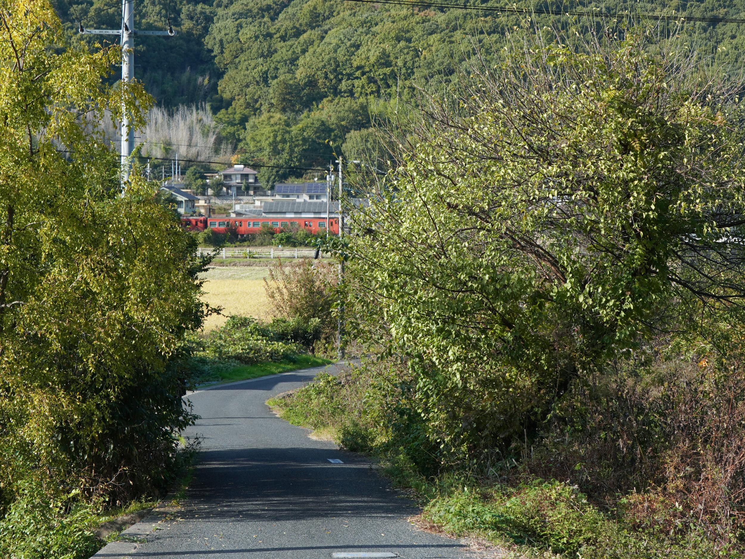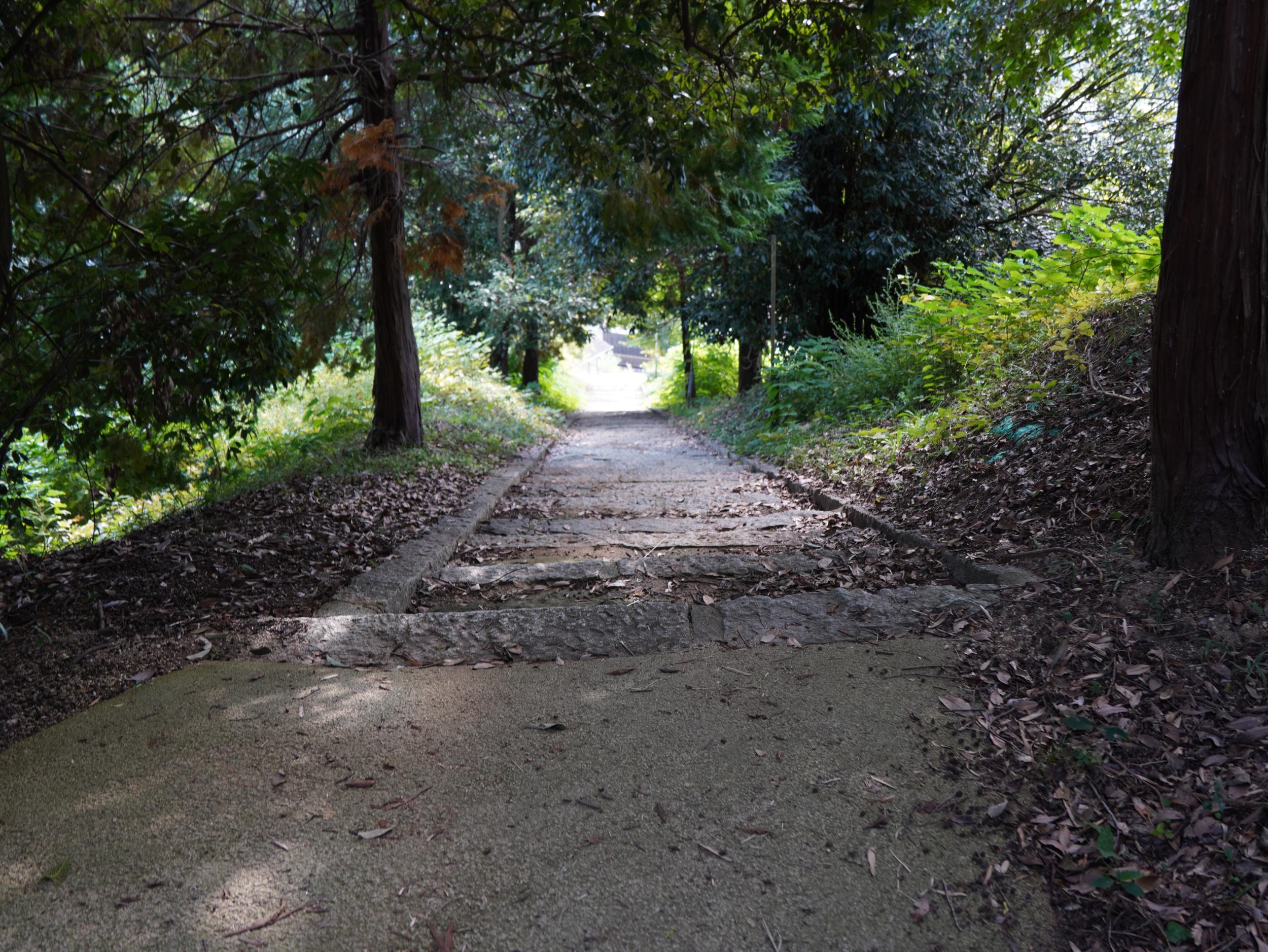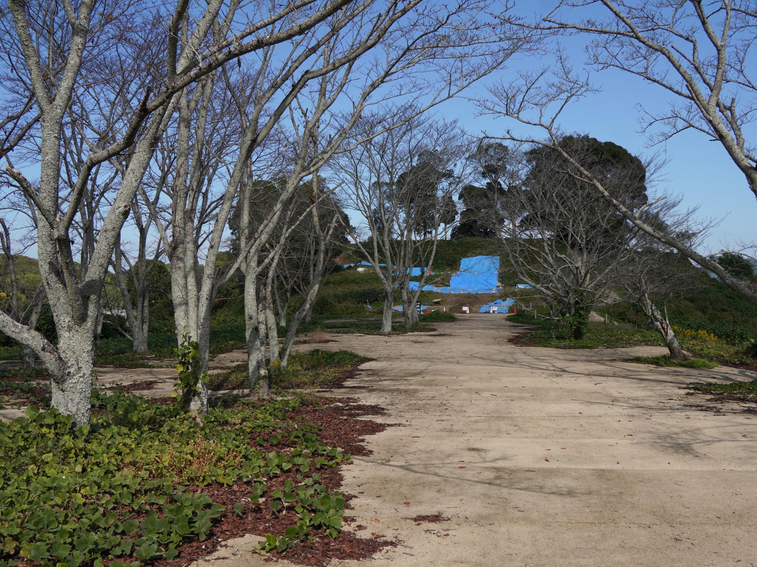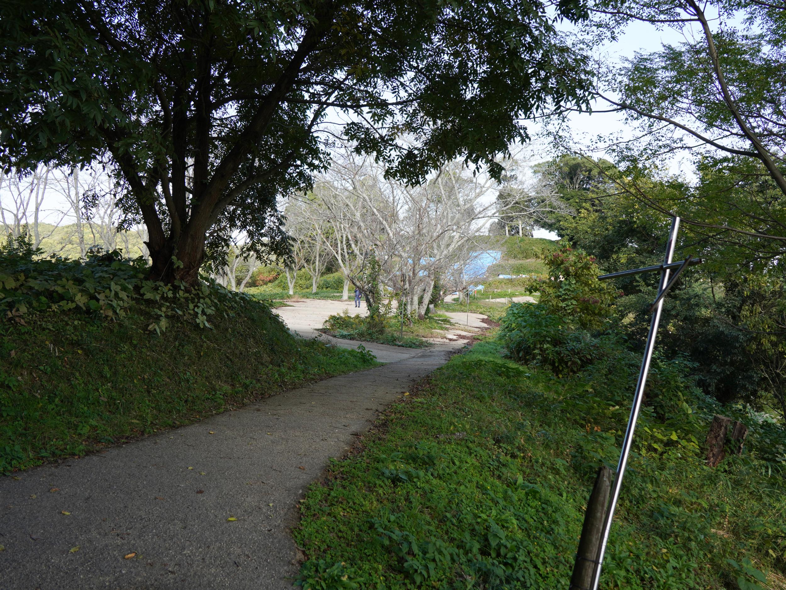 満足して引き上げます。来る前に鬼ノ城の見える血吸川(吉備津彦の矢が当たり温羅の目から吹き出した血で染まったことに由来する川、血の色は酸化鉄で、弥生時代から吉備で鉄器が普及し栄えていたことを連想させる)のポイントにマーカーを付けていたのですが、墳丘の上から鬼ノ城をしっかり見ることができたので、このまま来た道を引き返すことにします。