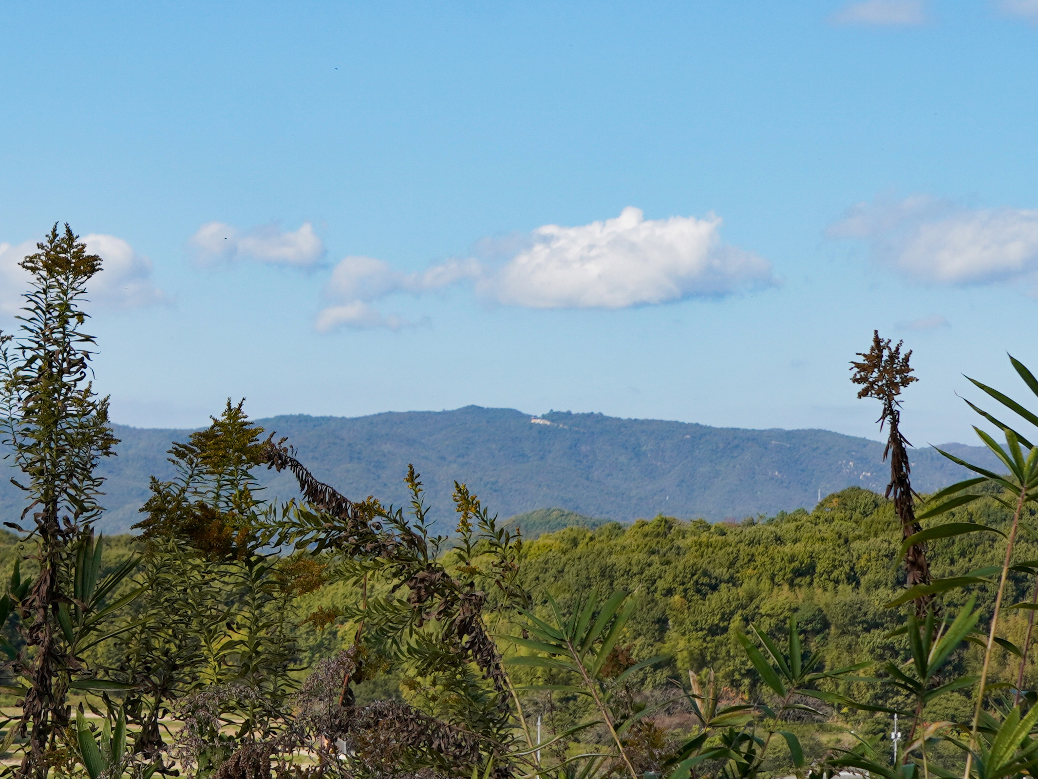 鬼ノ城へ至る山道の入口にビジターセンターがあり、そこまでクルマで行けるものの、対向車があればビビるような道で、慣れないレンタカーではヤバそうなので、訪ねるのは端から諦めていたものの、せめて遠望できればと思っていたのがバッチリ確認、それも造山古墳の墳頂から確認できたのは感動です。