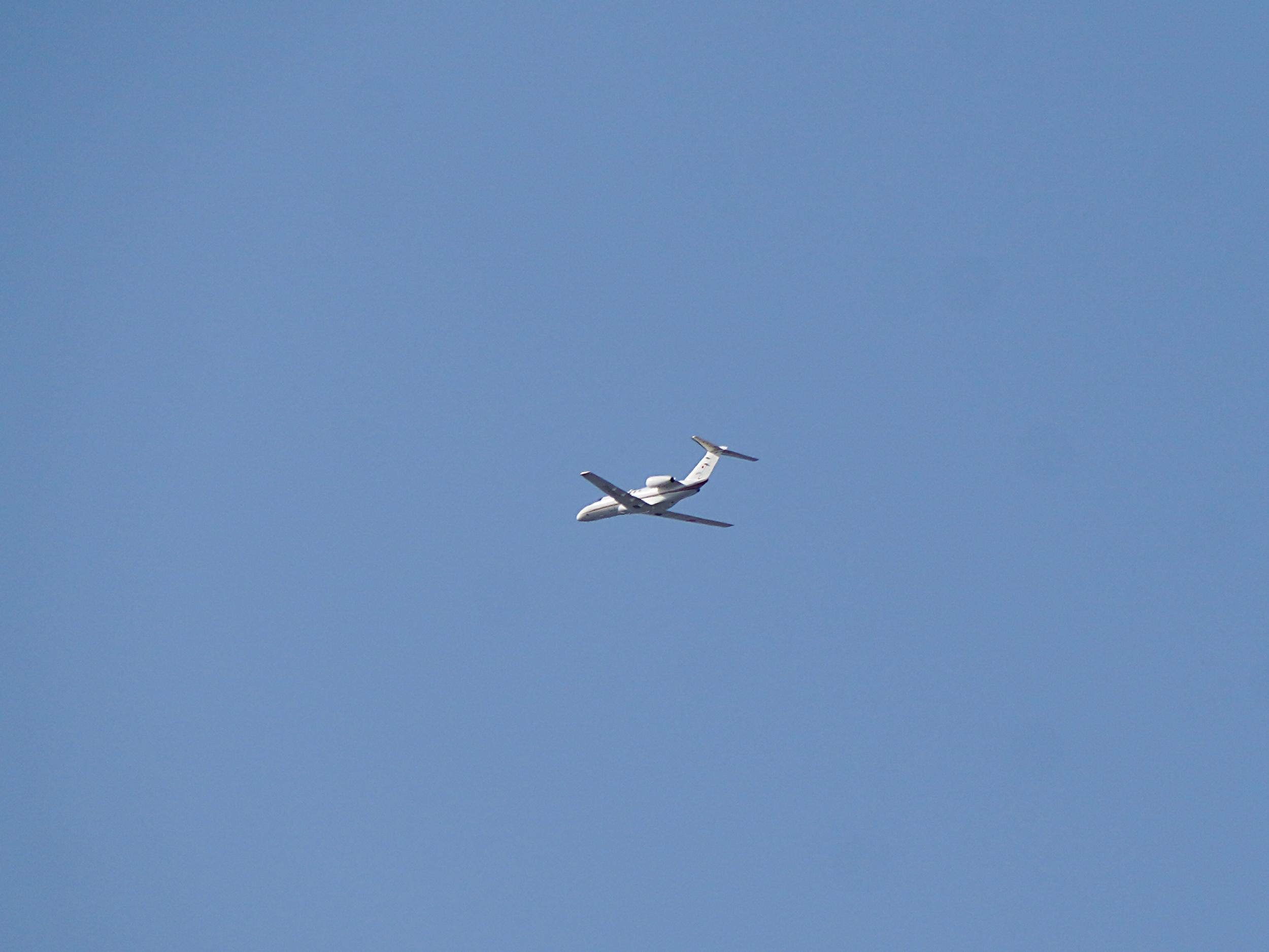 上空を東から西へしきりに飛行機が通過して行きます。そのウチの1機を撮ってみると見たことのない小型機、国土交通省セスナ525サイテーションジェットと分かりました。