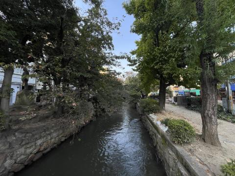 商店街のアーケードを抜けると西川緑道、この辺りでコウモリに会ったのを思い出しました。