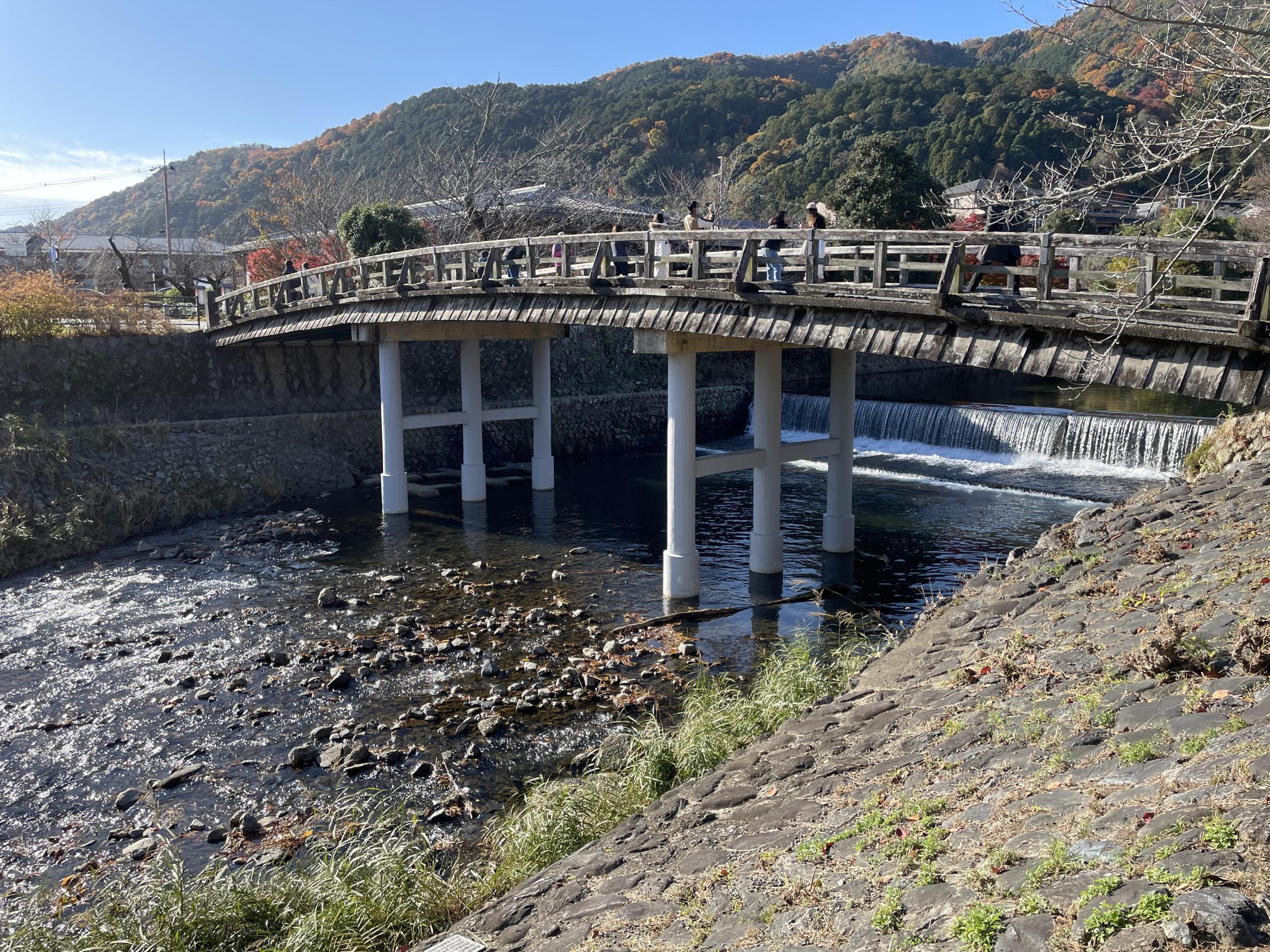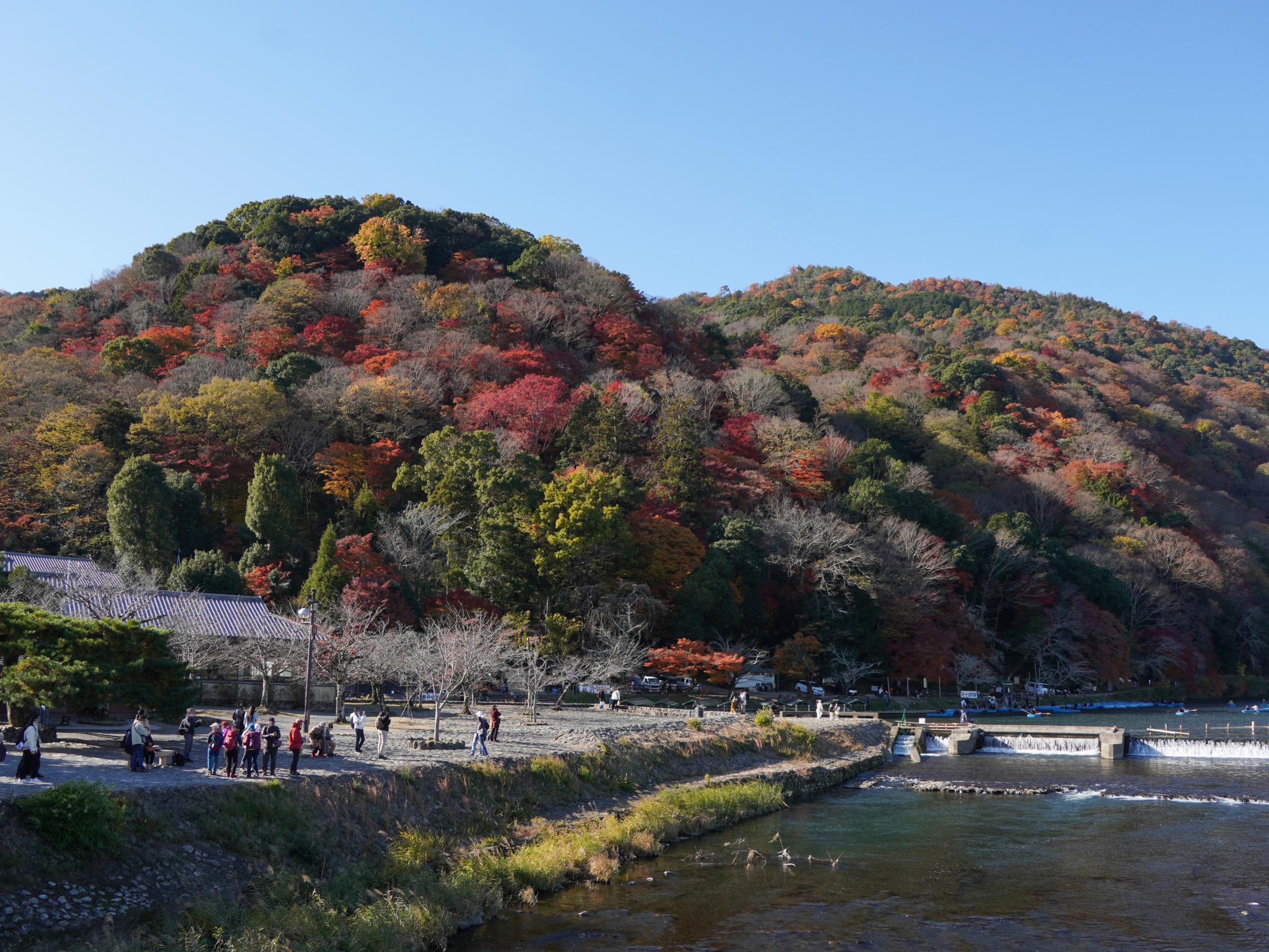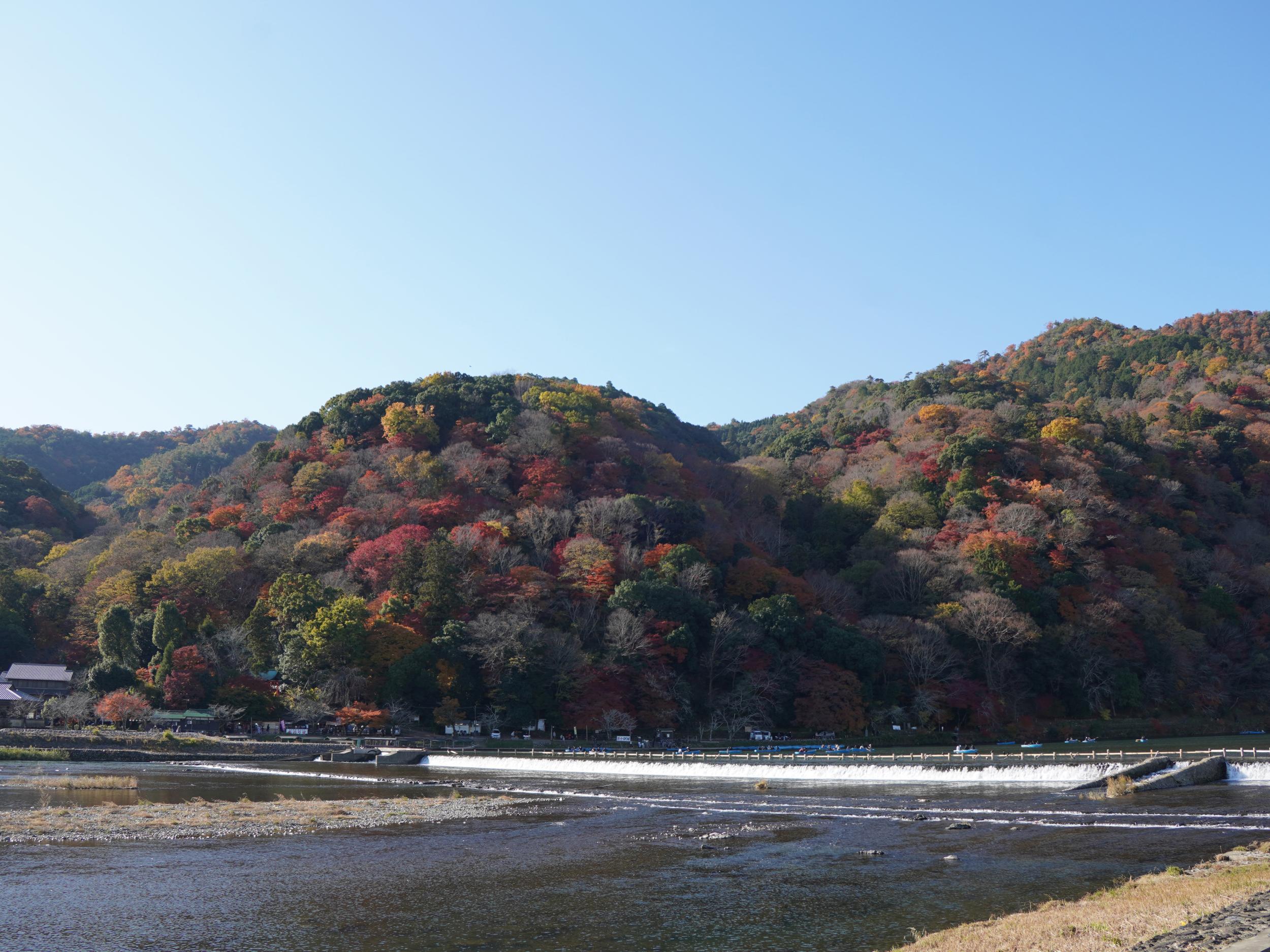 こんなに綺麗に色づいている嵐山を見たのは初めて。大悲閣を訪ねることも考えていたのですが、大堰川右岸は日陰の道が続くので渡月橋を渡ります。