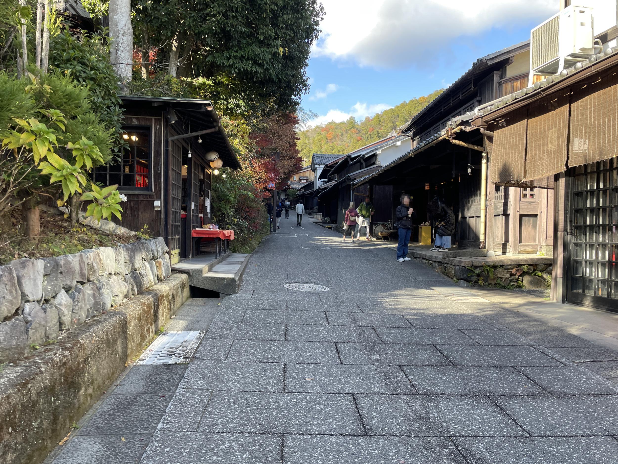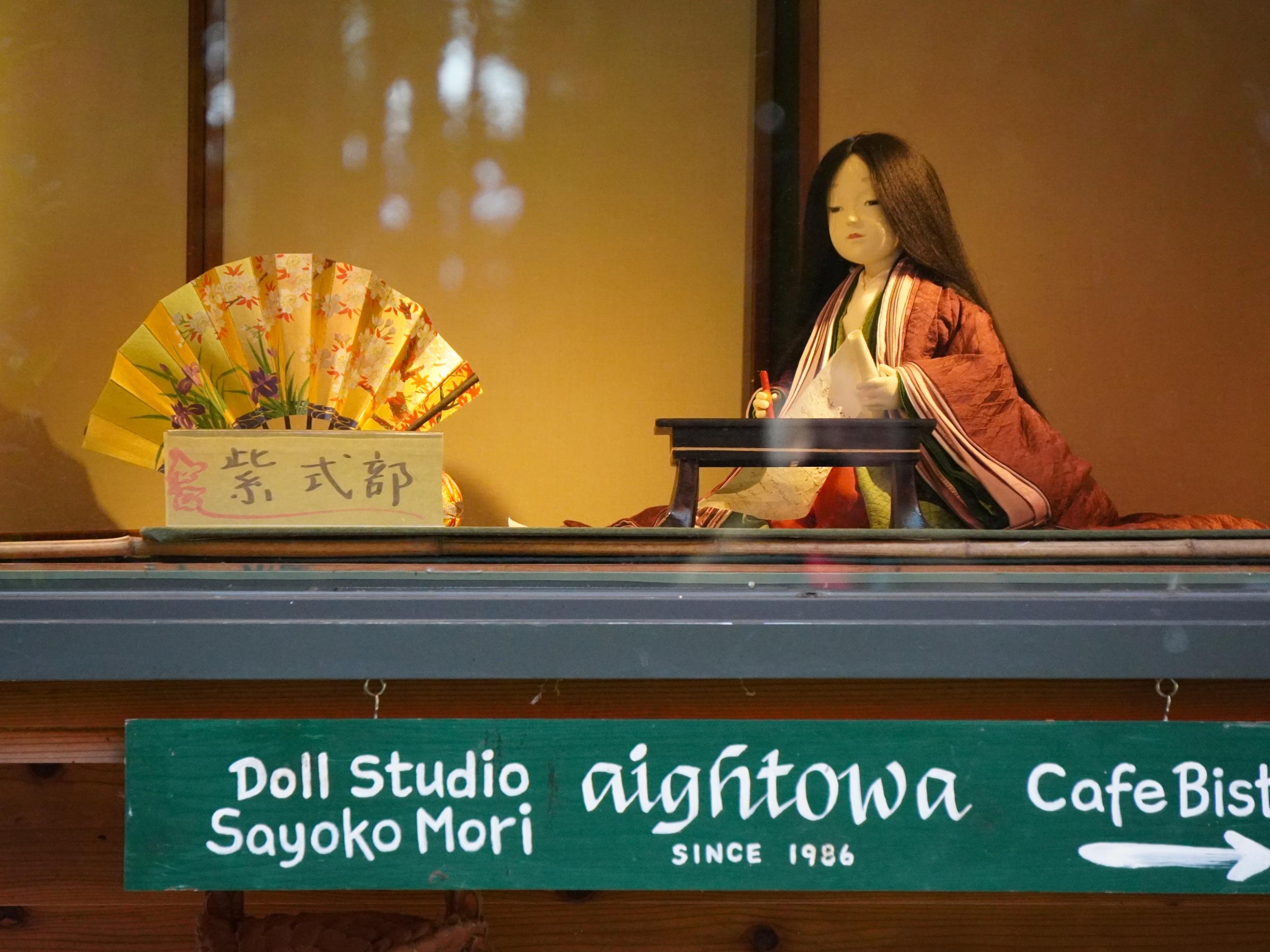 あだしのまゆ村という崖の上の人形店の崖下に現在地・鳥居本の町並みジオラマ、町を歩く人たちはまゆでできてます。読みにくい文章を読み直してみると、この先愛宕神社の一の鳥居があってそこから整備された通りの入口まで伝統的建造物群保存地区に指定されていて、この先の方は茅葺き、ここら辺までは瓦葺きの町家が並んでいて、ふたつの村が合体して構成されたものらしい。源氏物語の恋物語の舞台、さらには古今集や新古今集のもののあわれの舞台となり、小倉百人一首や松尾芭蕉らによって語り継がれ歌い継がれてきた場所だそうです。