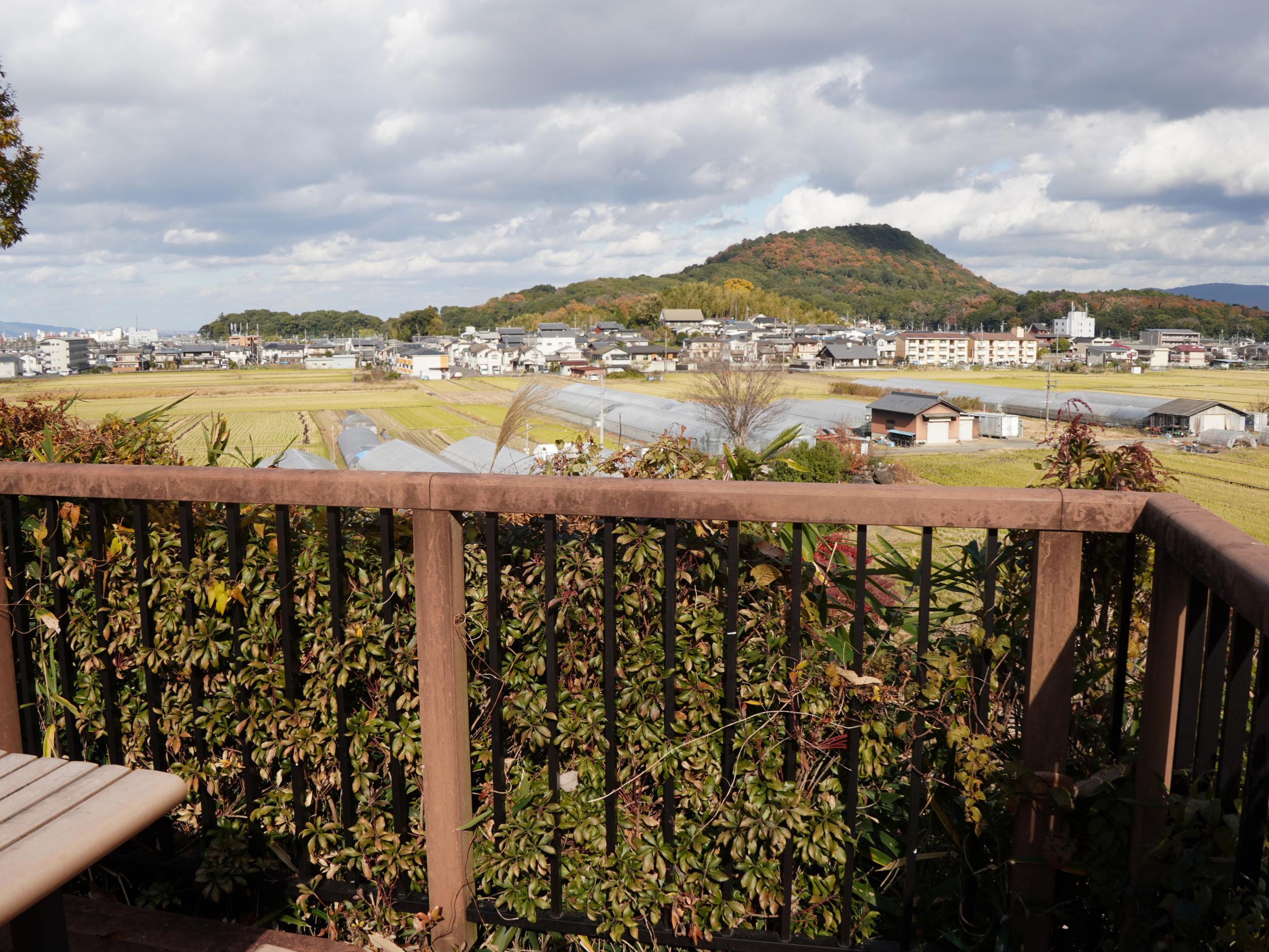 道路を渡り公園に入るも人っ子ひとりいません。新沢千塚古墳群公園(PDFマップ)の西の端に位置する173号墳と二上山です。