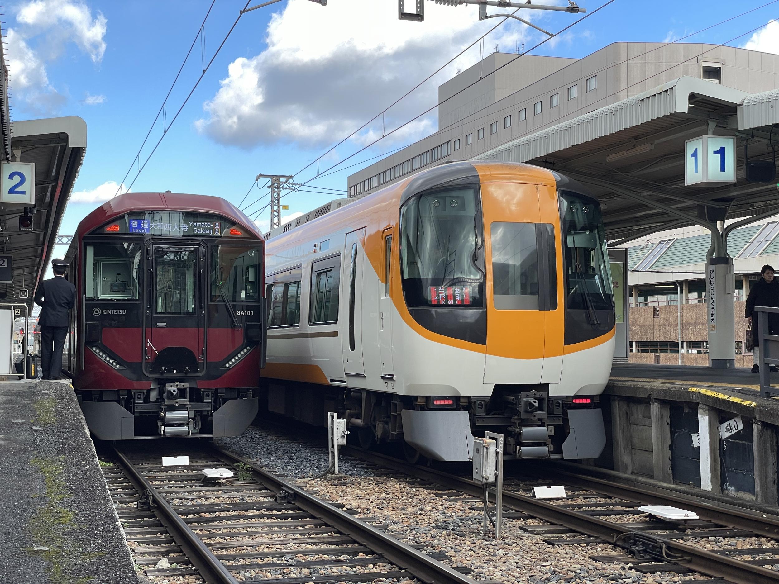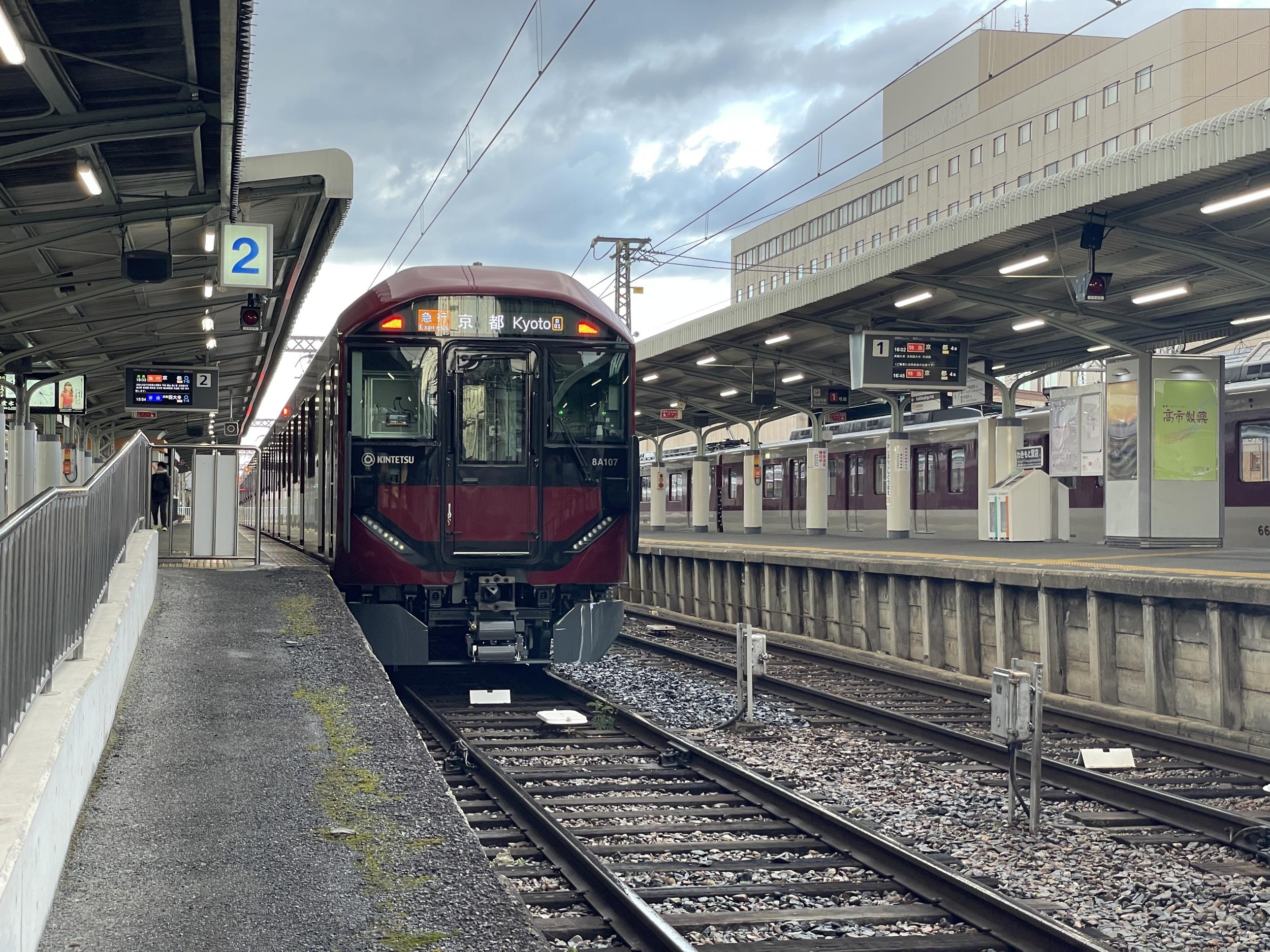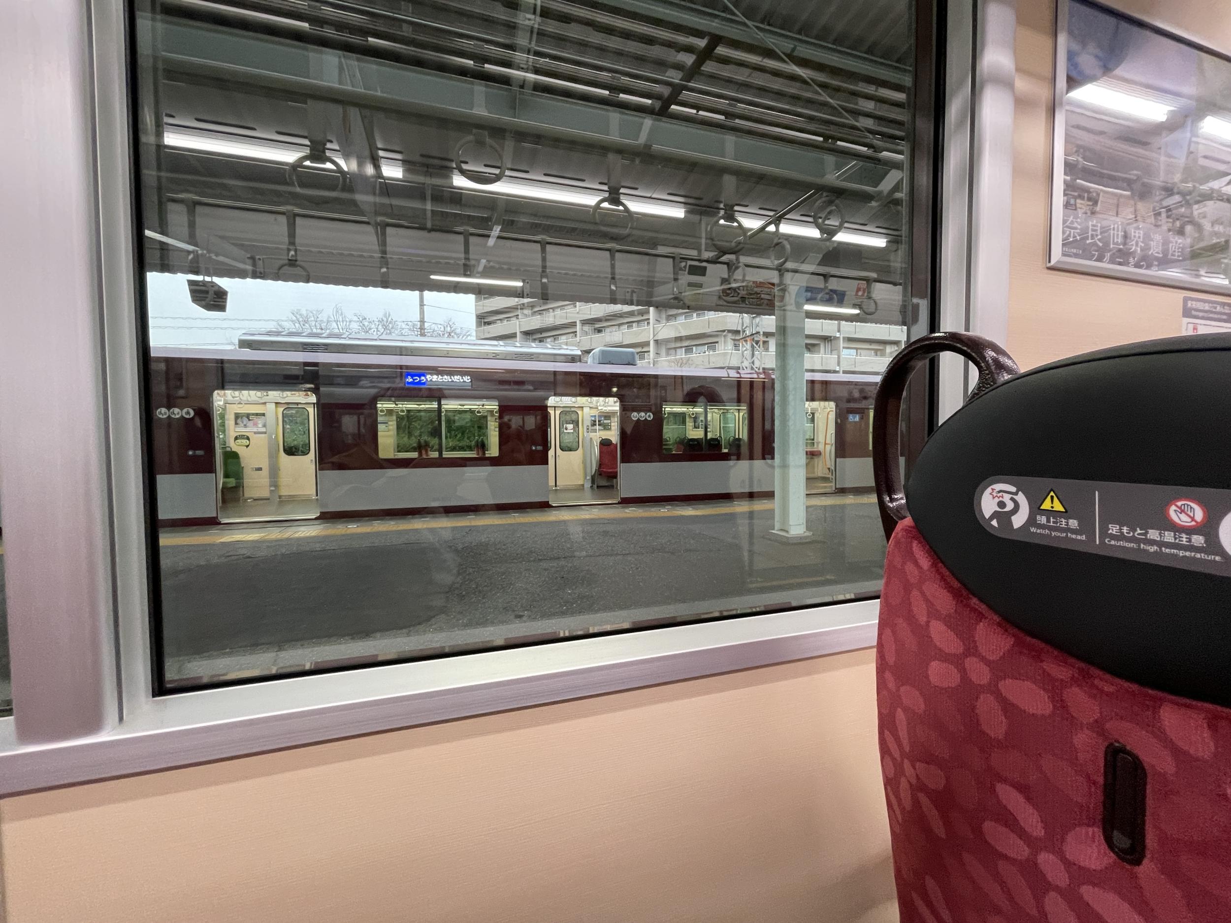 3列しかないクロスシートで視界が広がる真ん中の列に腰を下ろすと、3番線にも8A系の大和西大寺行普通が入線してきました。8A系は既に少なくとも7編成が導入され、奈良線よりも京都線橿原線メインで運用されているようです。