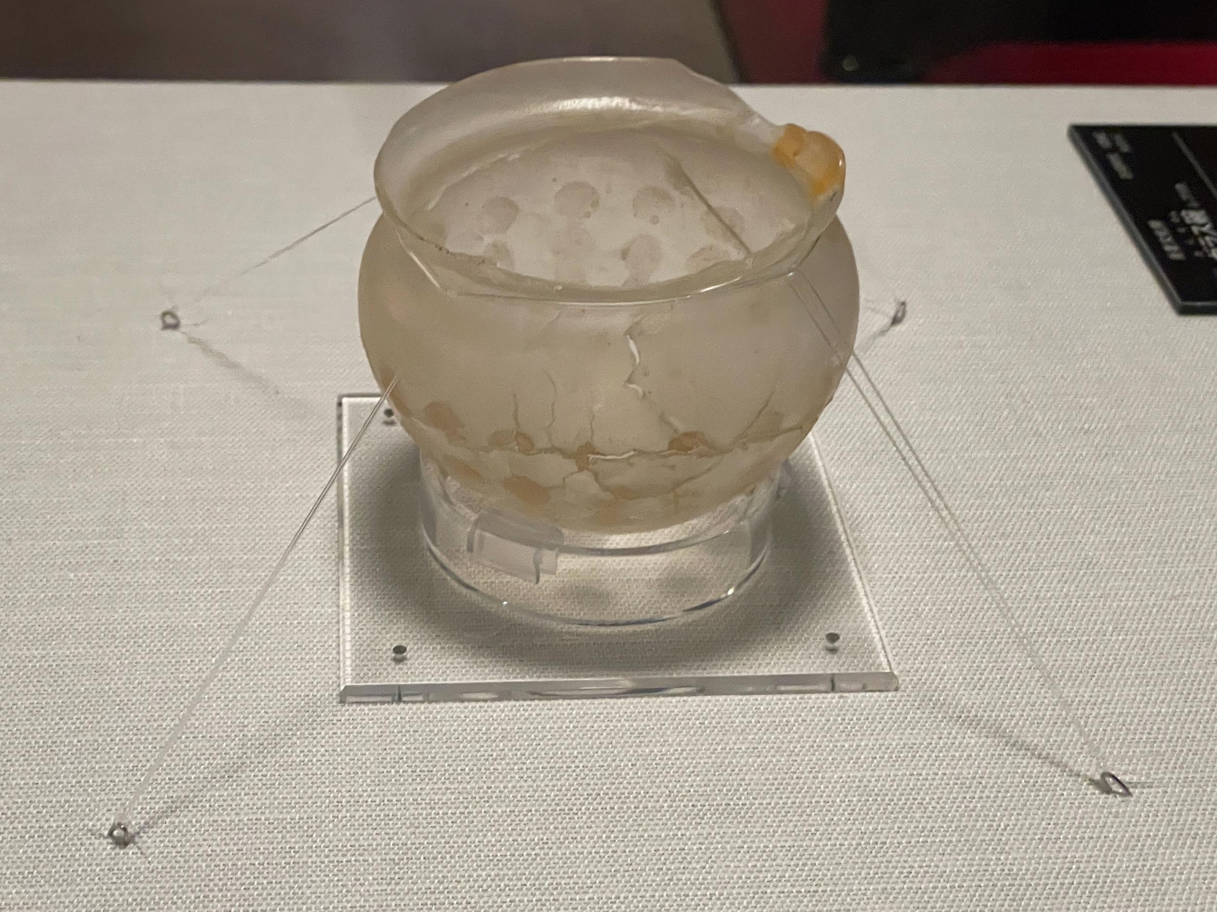 東京理科大による蛍光X線分析で、ローマ帝国領内で出土したローマンガラスと化学組成が一致することが判明したガラス皿とガラス椀のレプリカ、重要文化財として実物は東京国立博物館蔵。ローマ帝国伝来と裏付けられた初めての日本国内出土品だそうです。