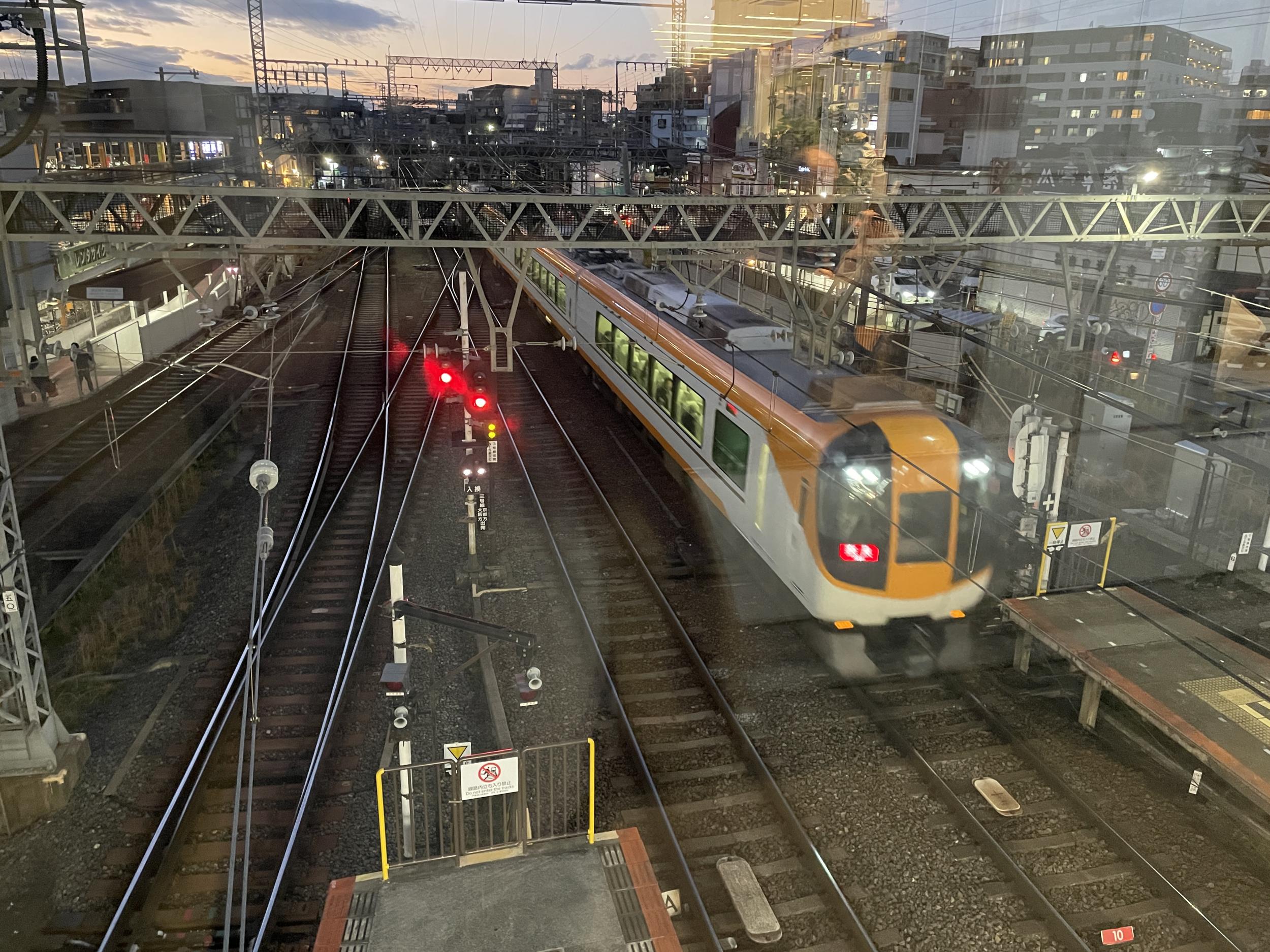 2番線には8A系の京都行急行、後から気がついたのですが1番線の向こう0番線に電車が停まっています。0番線は確か狭軌だったはず、停車中に電車の車番が66で始まっていて南大阪線の車両です。これから標準軌の台車に履き替えてモト90形に挟まれて五位堂へ回送、検査を受けるものと思われます。
