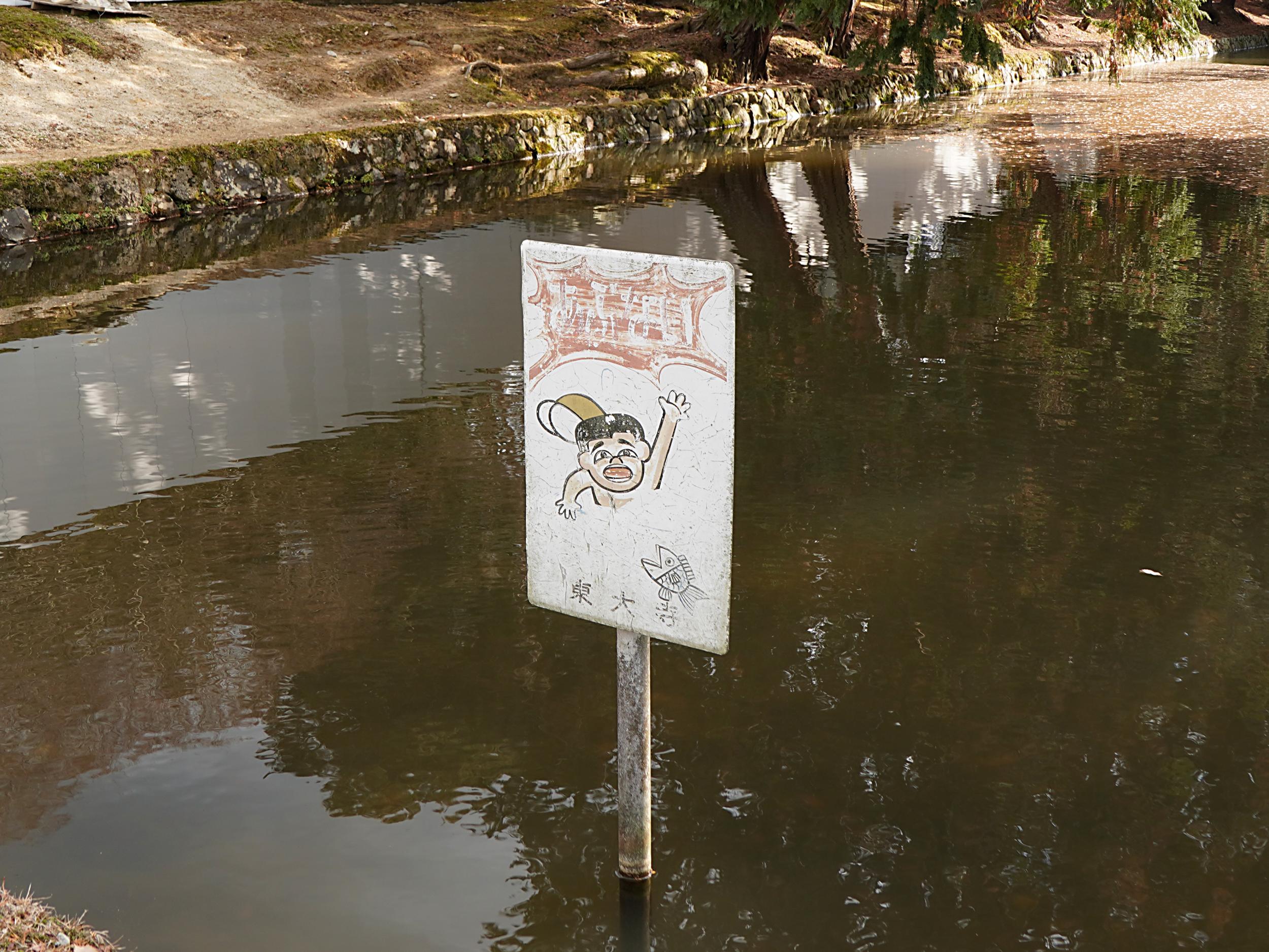 大仏殿東側にある用水池のような長池に笑える看板。この池には奈良県指定天然記念物のワタカという魚がいるはずですが、コイしか見当たらず。