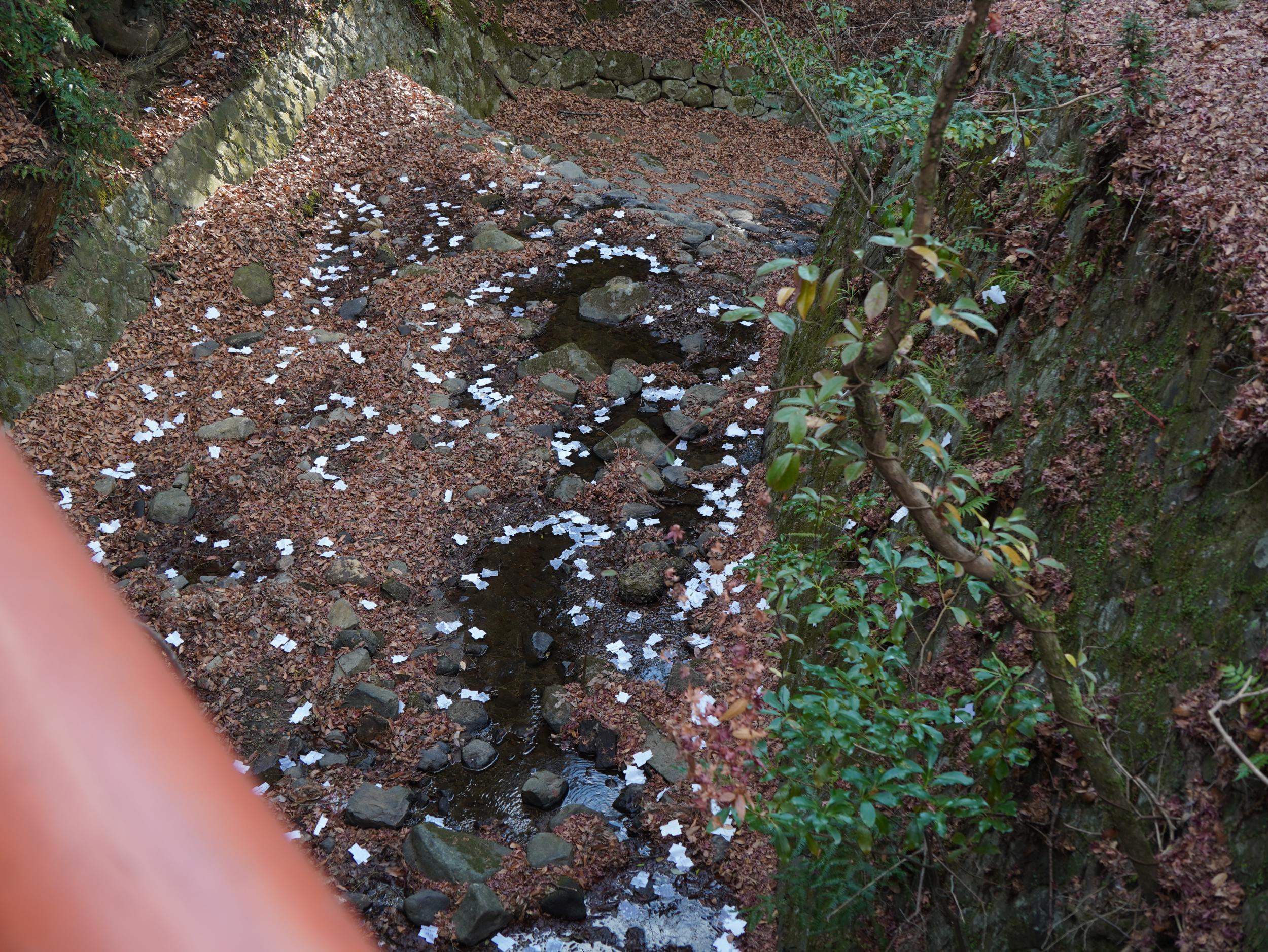 緋毛氈のかかった縁台の向こうは水谷川(みずやがわ)の谷、そこになにか紙切れがいっぱい散らばってます。