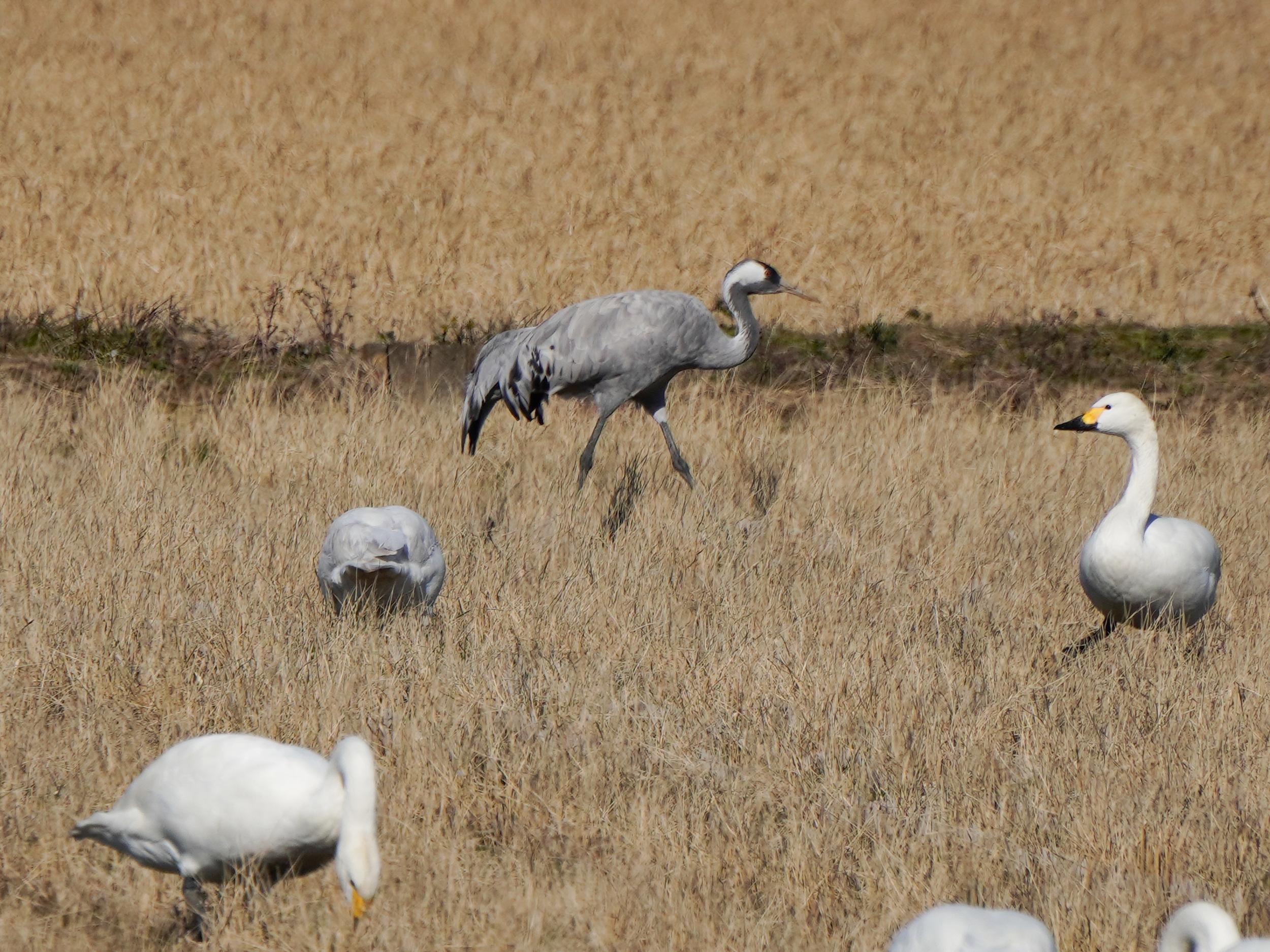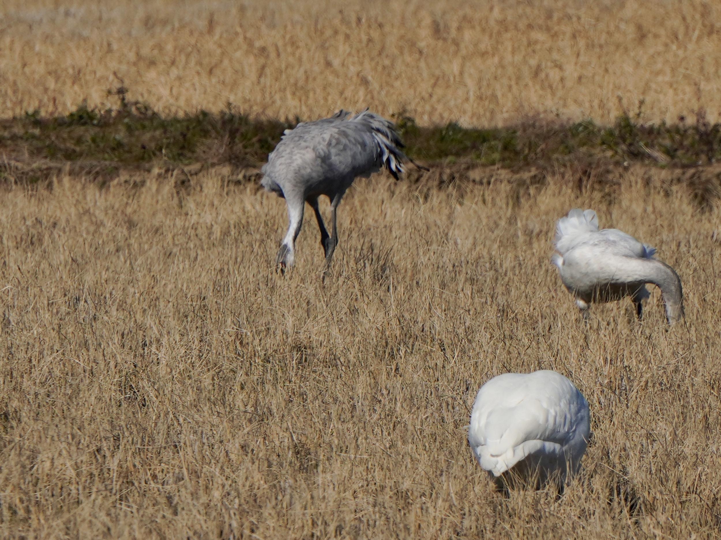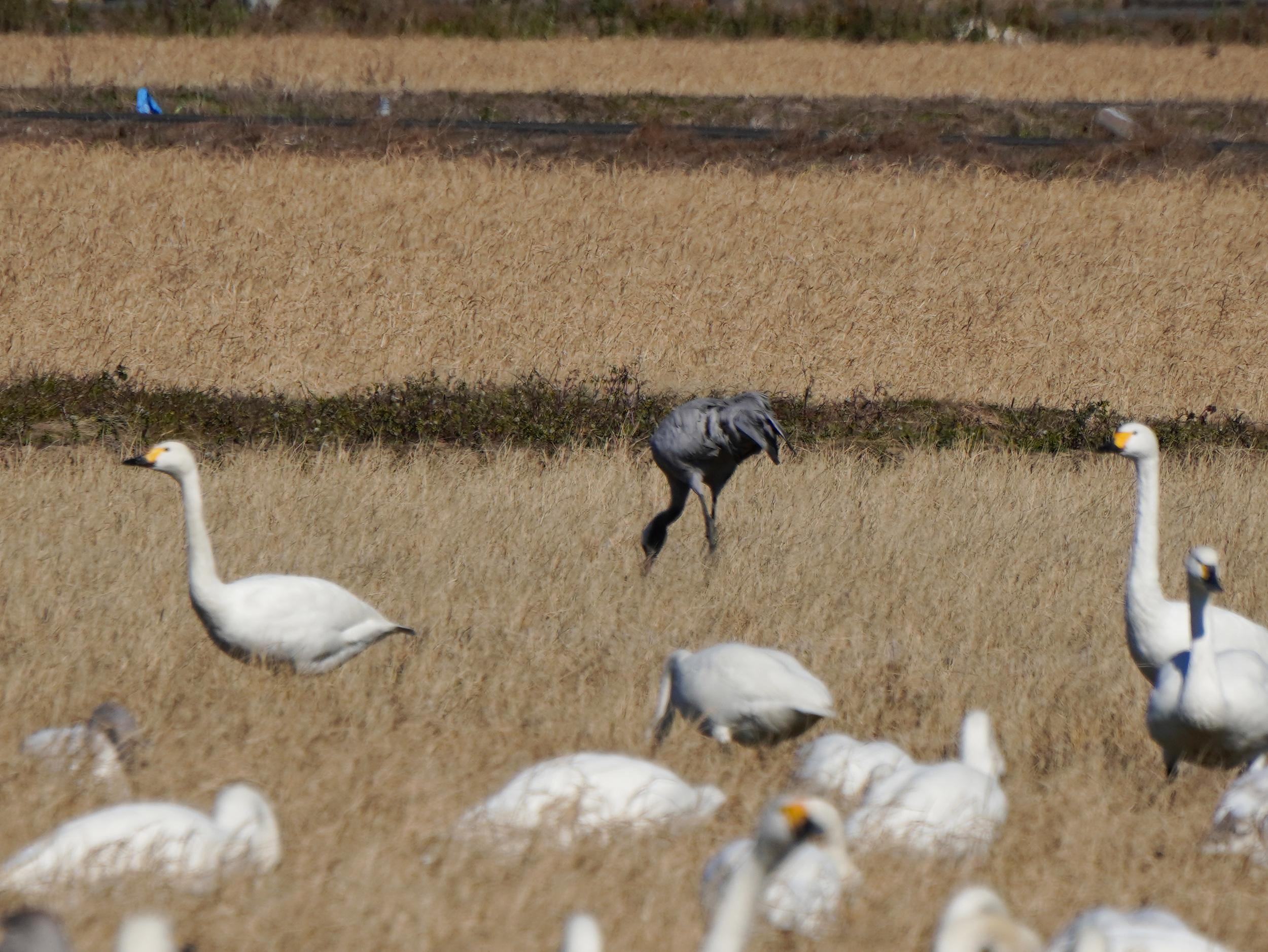 コハクチョウたちからちょっと離れてクロヅルがいました。10年前に宍道湖で会ったナベヅルと似た感じです。