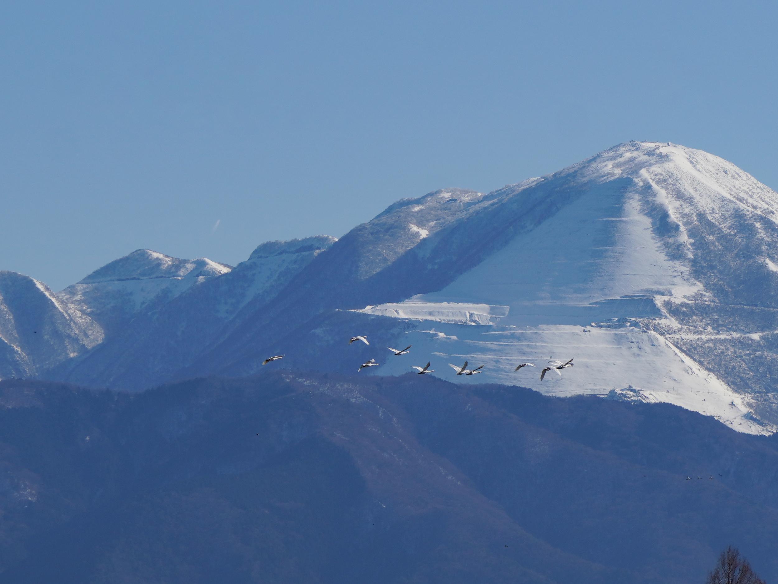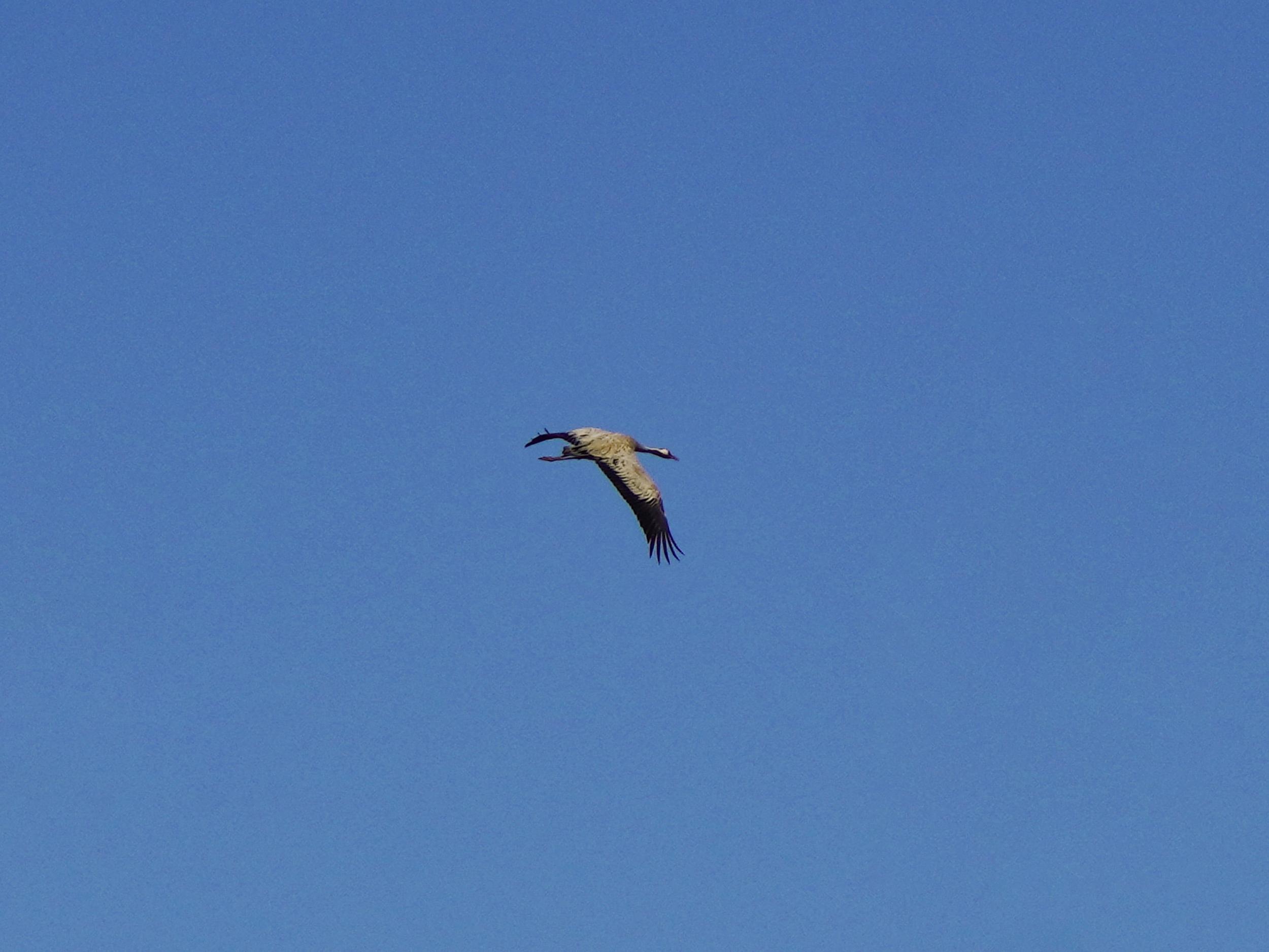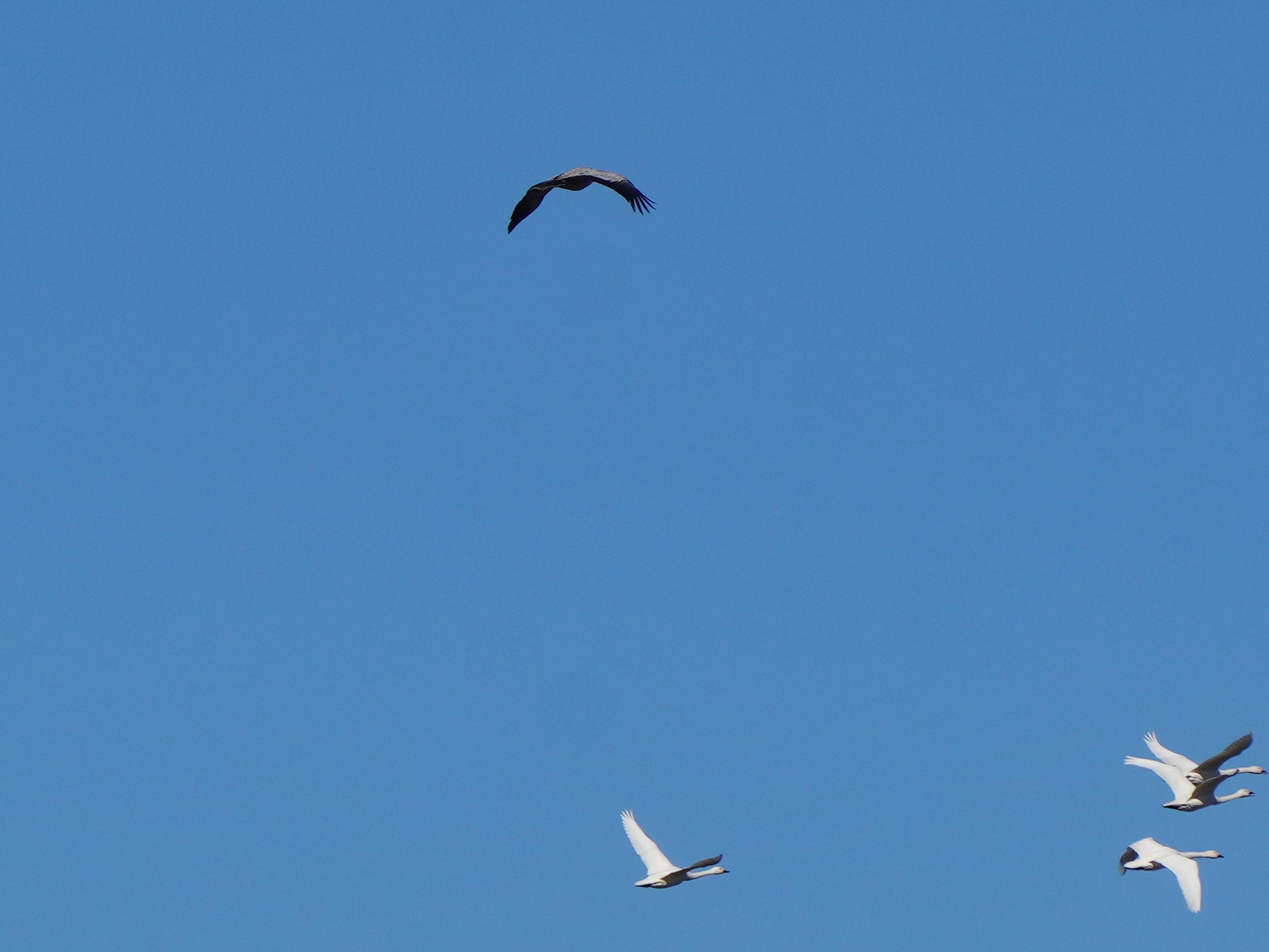 コハクチョウたちからちょっと離れてクロヅルがいました。10年前に宍道湖で会ったナベヅルと似た感じです。