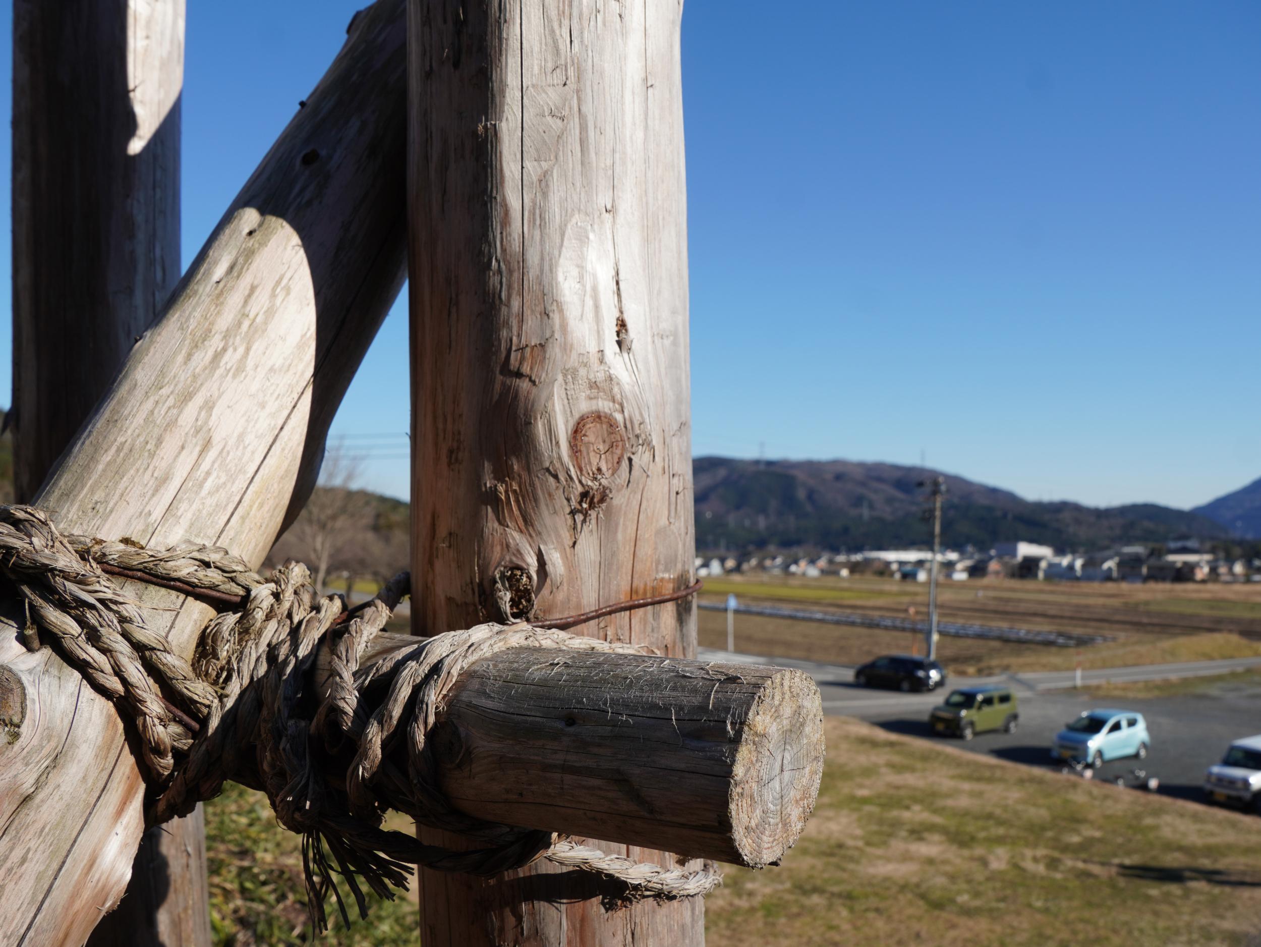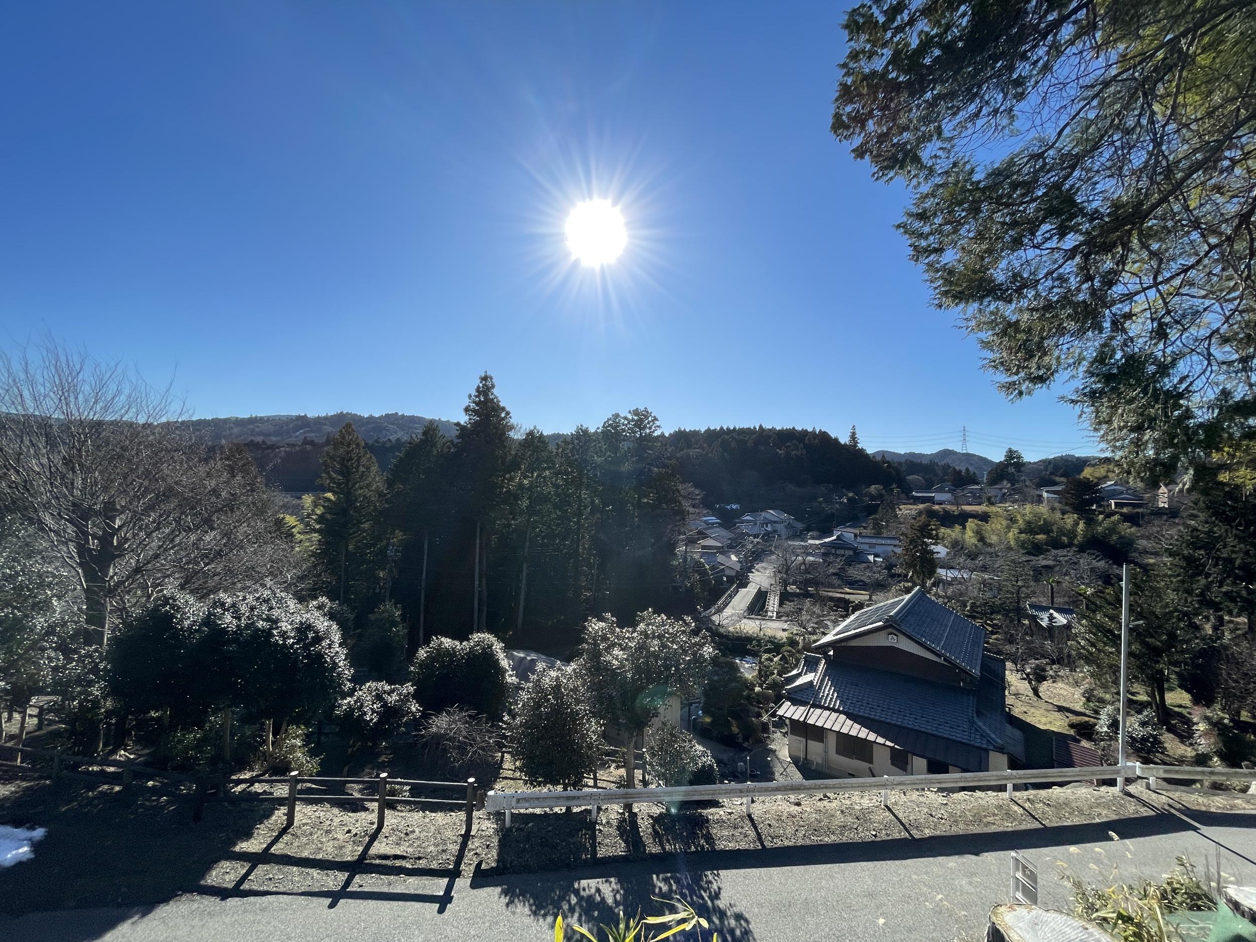 さほど貴重な文化財とかがある訳でもないのに展示館内はどうやら撮影禁止ぽいので、外に出て資料館の裏手に回ると藤古川の谷に向かって展望台になっていました。藤古川に架かる橋が東山道、川の向こうから近江軍が攻めてくるところを想像してみます。太陽の左下がその約千年後に小早川秀秋が東西どっちに味方するか悩んでいた松尾山です。