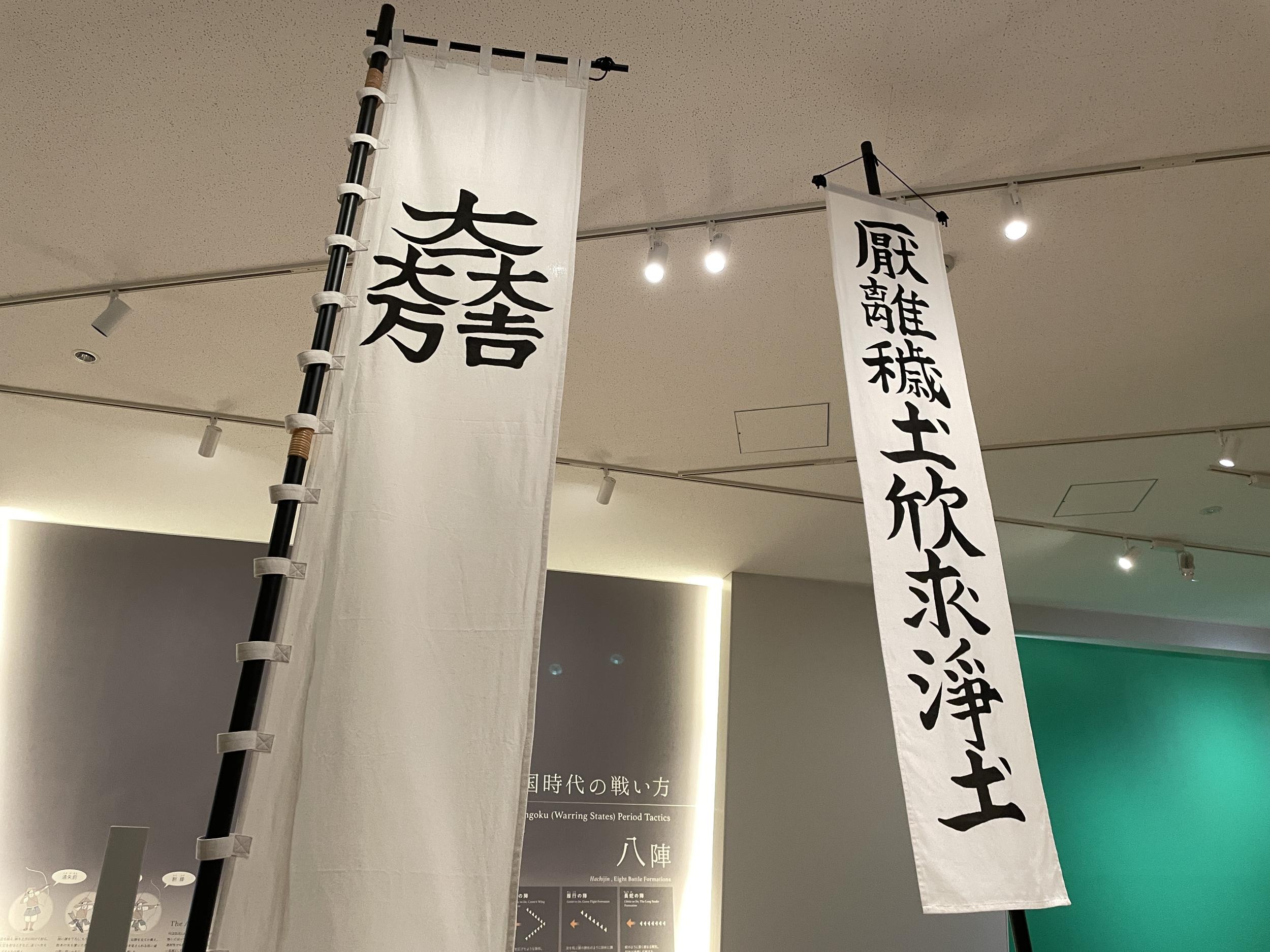 2階に上がり撮影禁止の展示室をささっと見て、戦国体験コーナー。陣羽織を来て記念撮影もできるようです。さっきから気になっていた「大一大万大吉(だいいちだいまんだいきち)」は石田三成の旗印と分かりました。