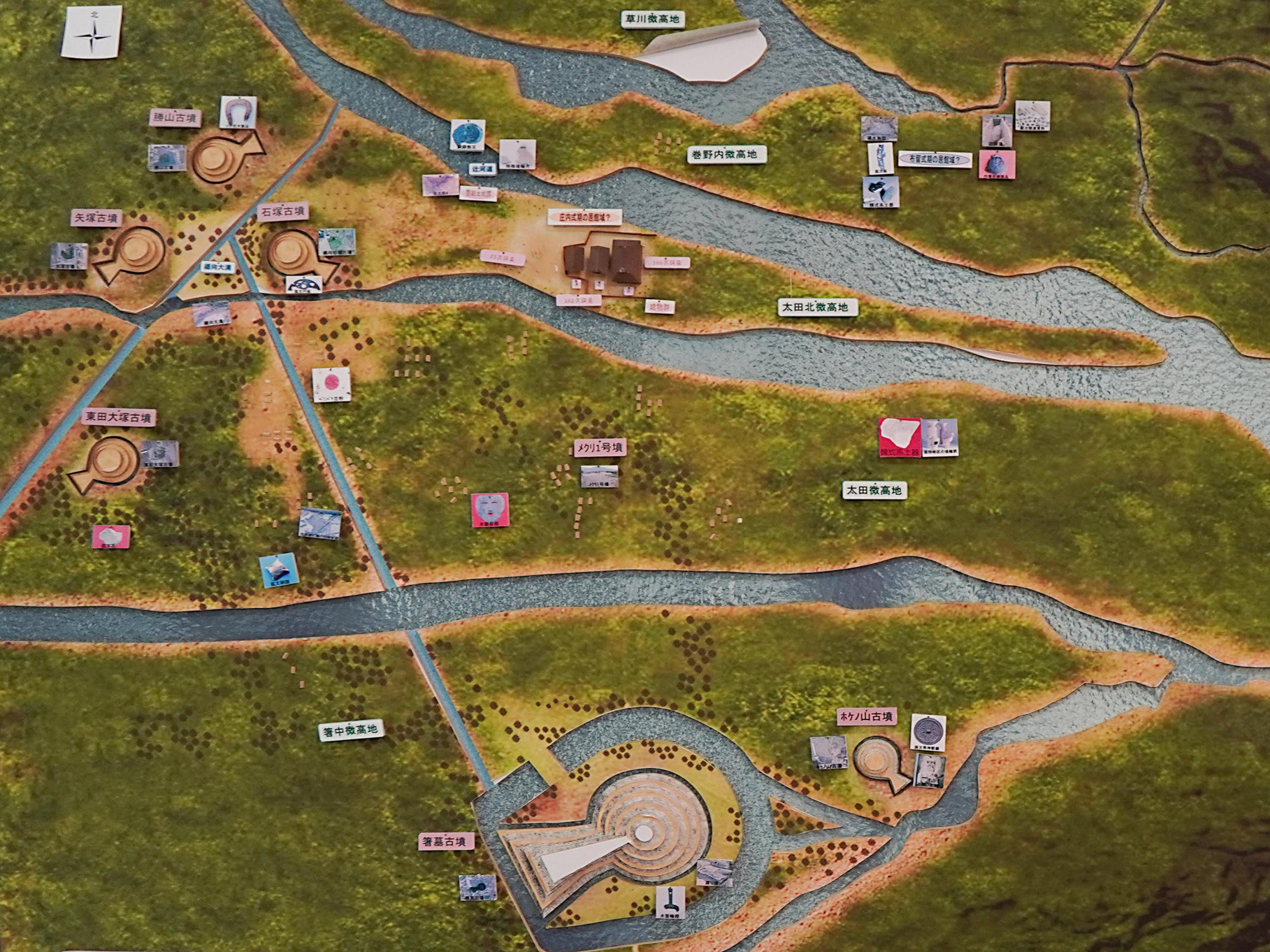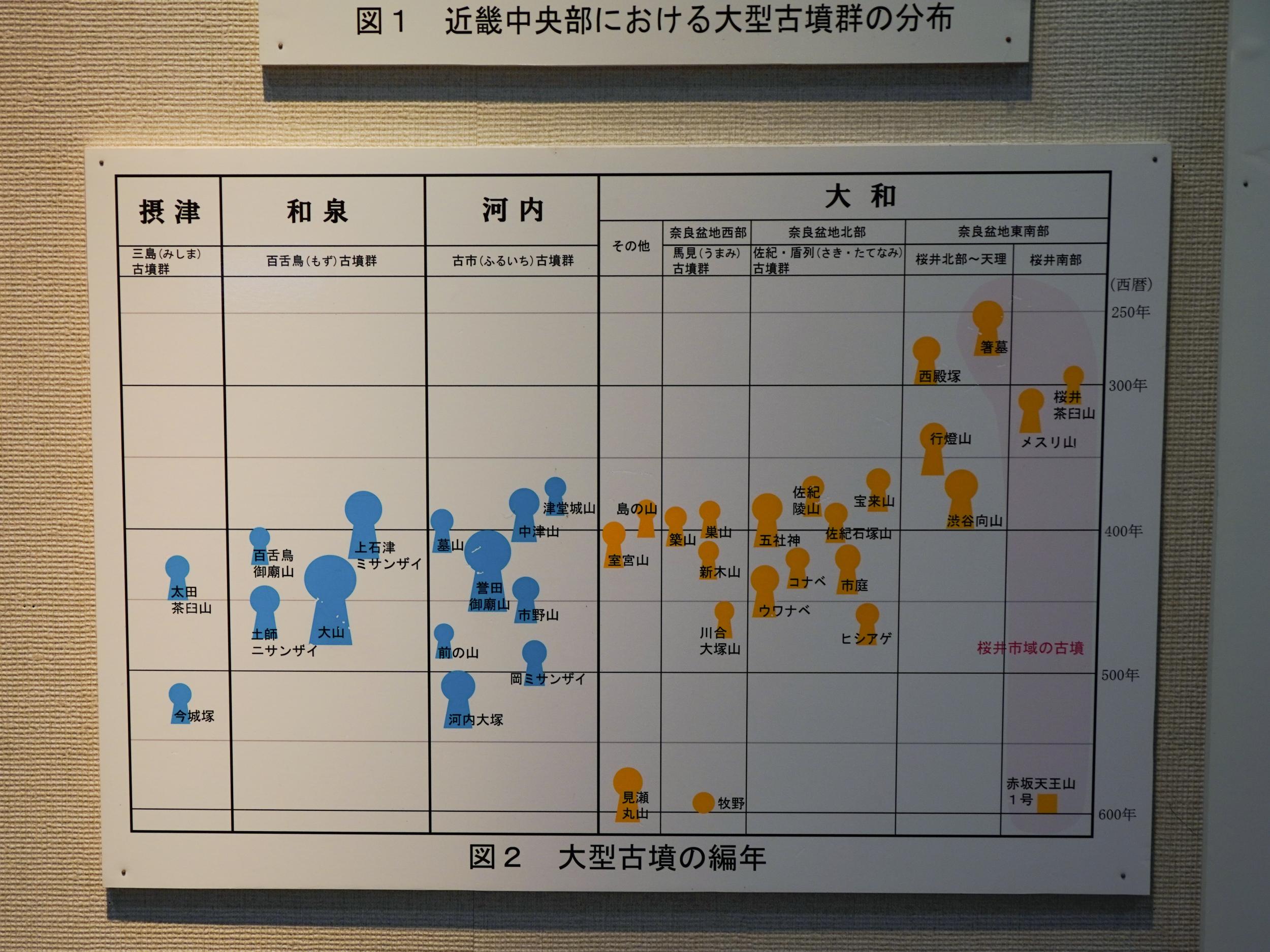 大型古墳群分布図で西殿塚古墳が箸墓古墳に次ぐ2番目に古い大型前方後円墳と確認。パネルに大仙古墳が大山とあるのは誤字かと思いきや大山と表記することもあるようです。