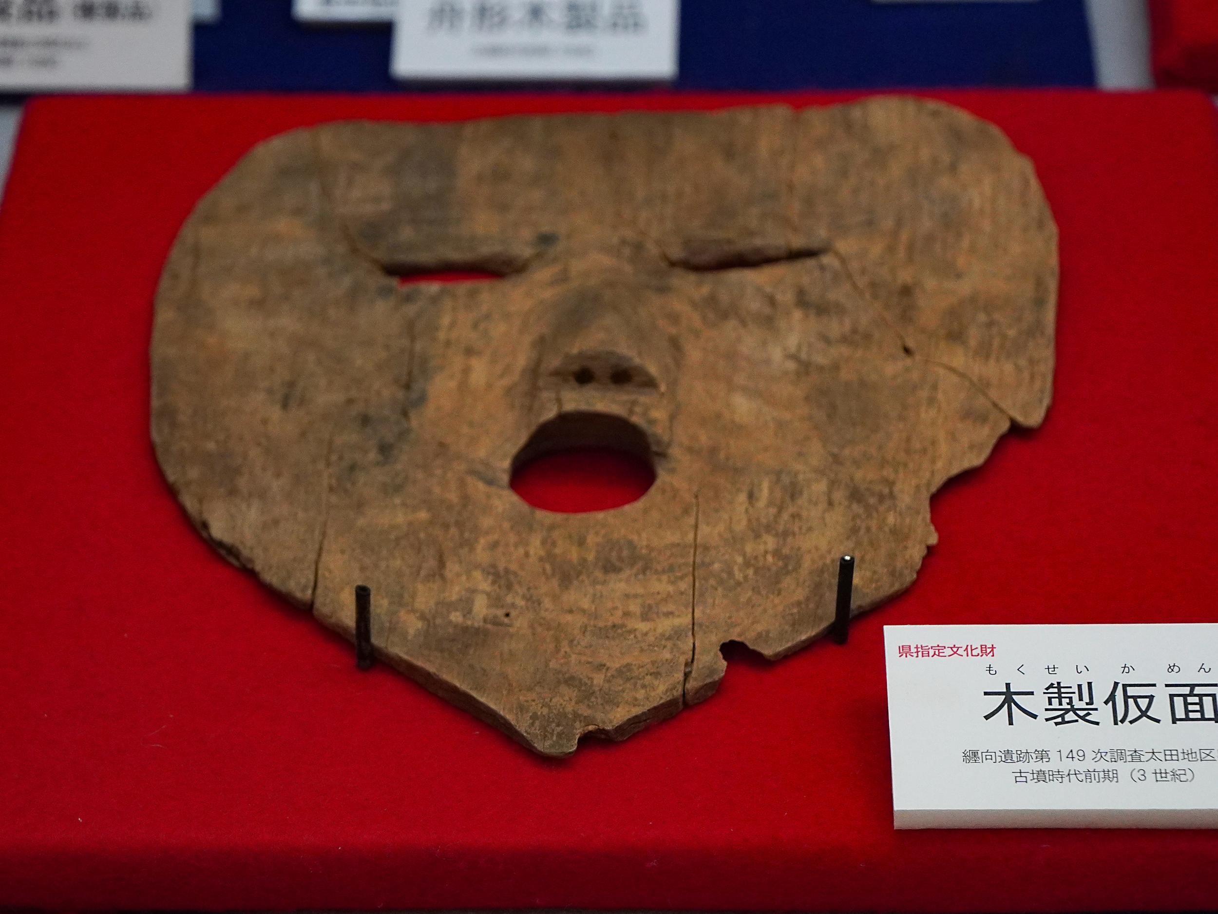 当資料館のシンボル的存在の木製仮面(纏向遺跡)とその制作工程のパネル。