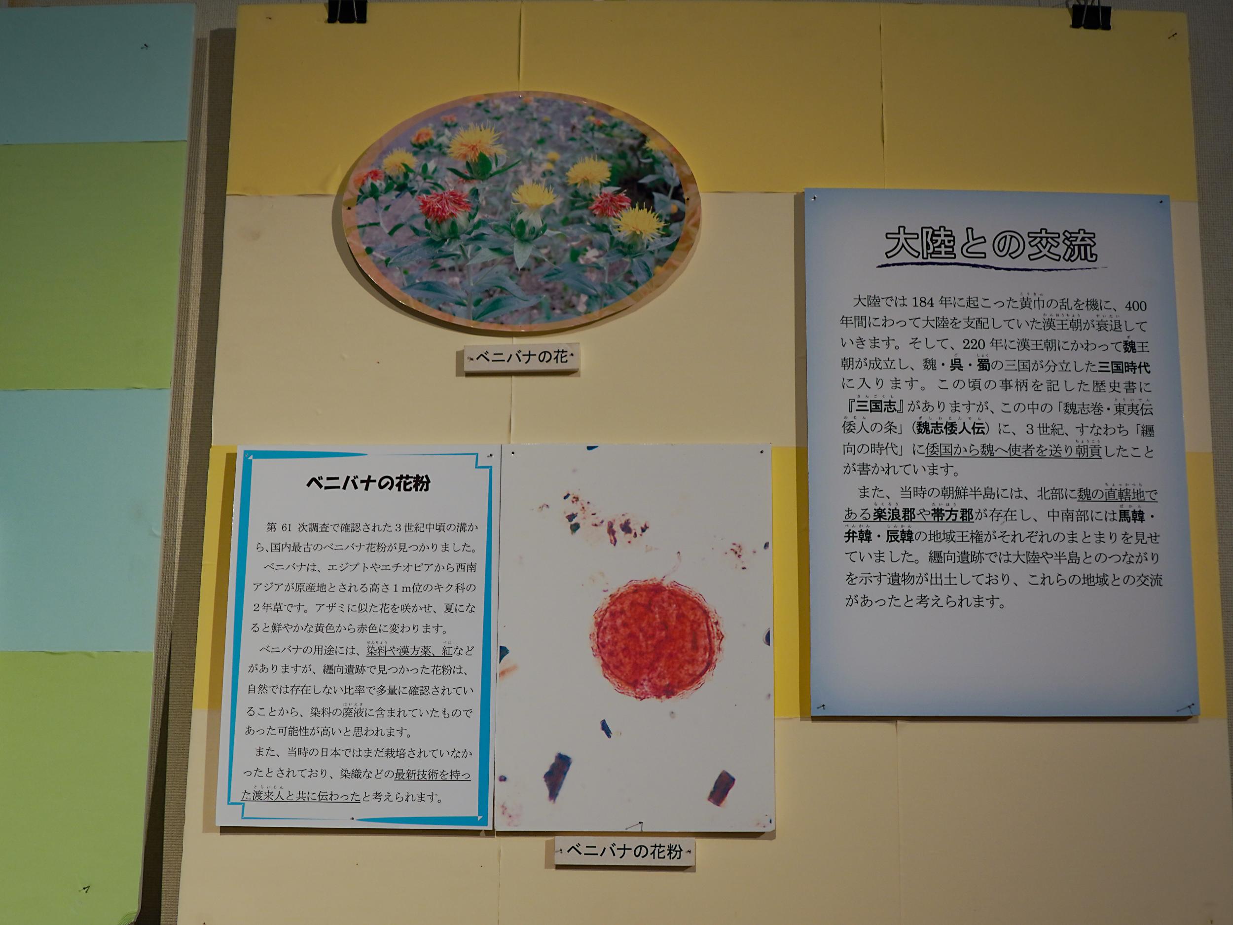 また纏向遺跡では3世紀中頃の溝からベニバナの花粉が大量に出土、染料の廃液に含まれていたものの可能性が高いと推測され、染色などの最新技術を持った渡来人が伝えたもののようです。