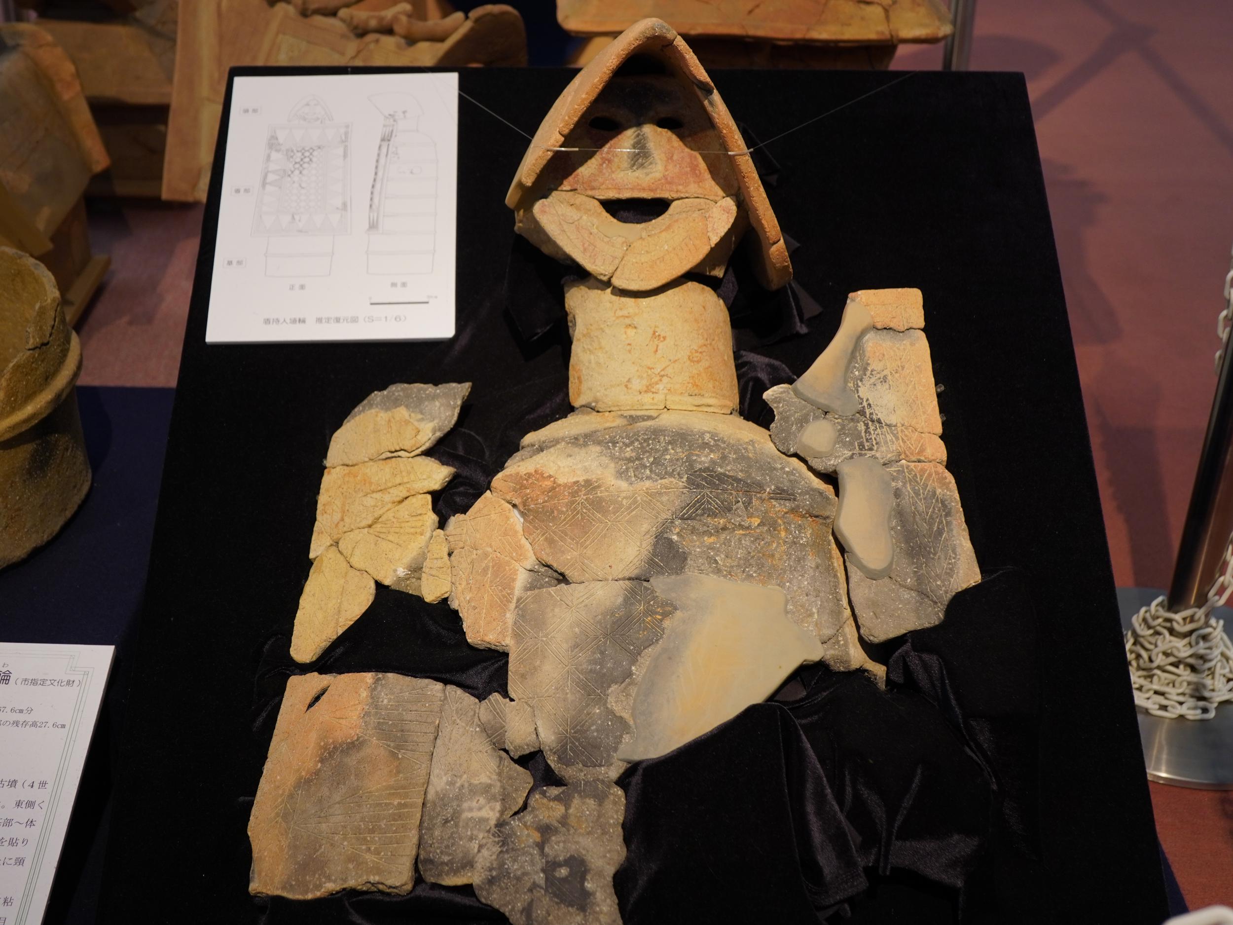 もうひとつの当館のシンボル、茅原大墓古墳(4世紀末)から出土の盾持人埴輪。表情が豊かですが、人物の顔を表現する日本最古の埴輪らしい。