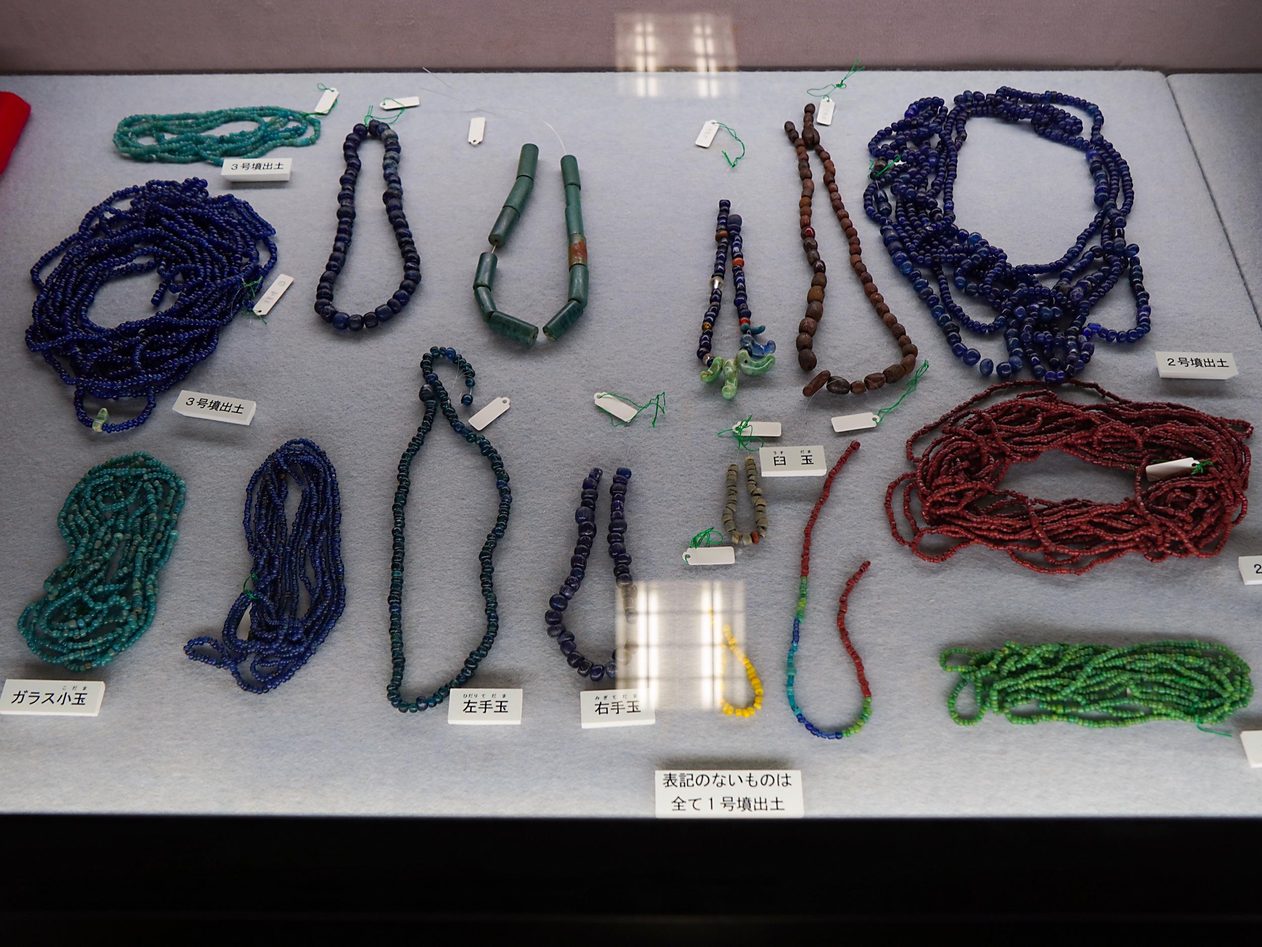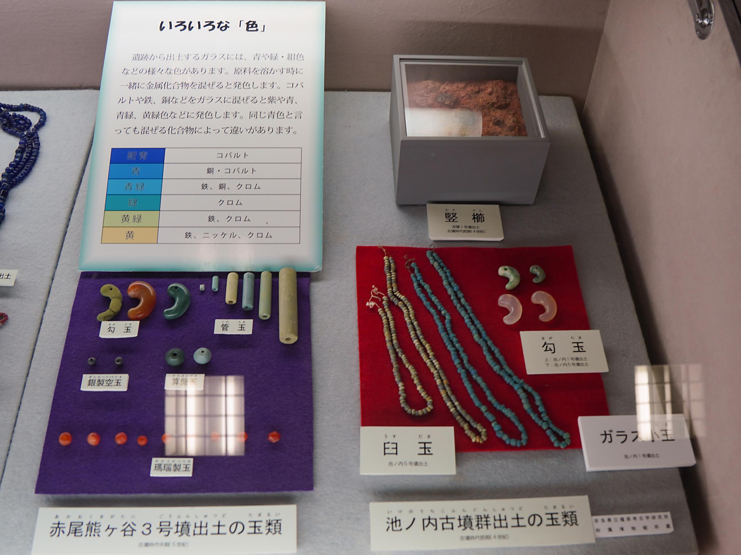 実にカラフルな玉類。コバルト、銅、鉄などの金属化合物を混ぜて発色させていると分かりました。