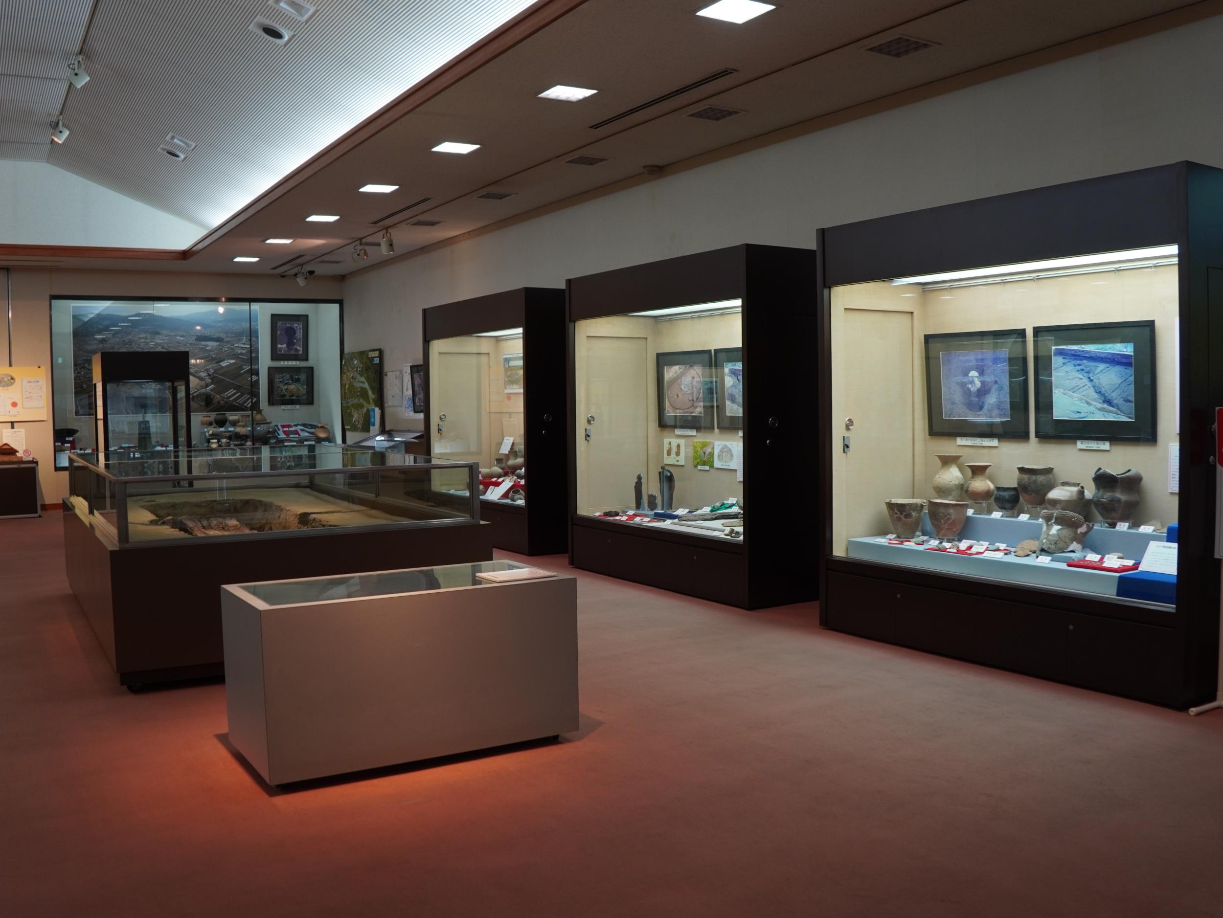 展示室に入ったところです。手前の箱には大福遺跡出土の弥生時代中期の18〜25歳の小柄な女性と思われる仰臥屈葬された人骨が眠っています。