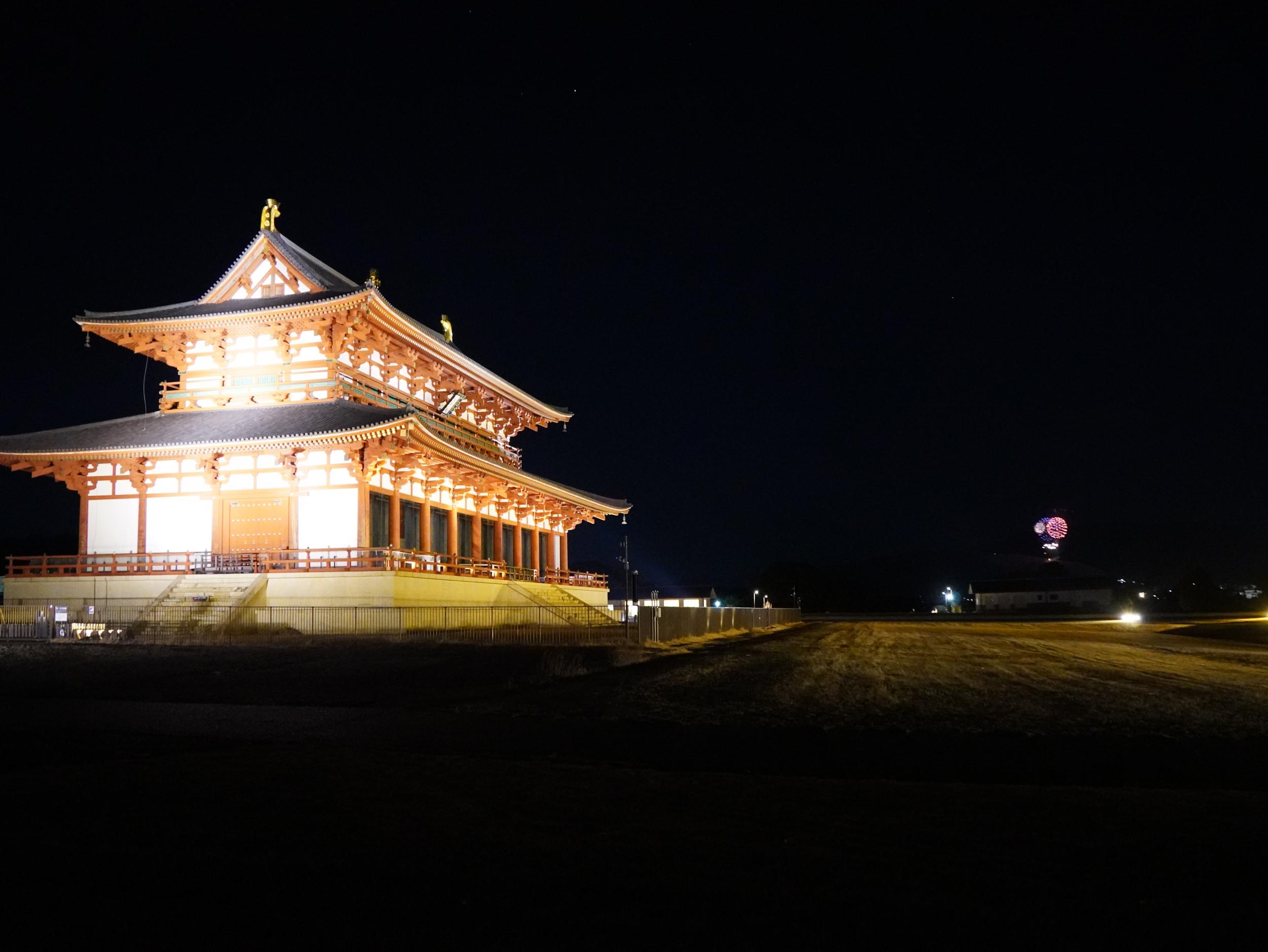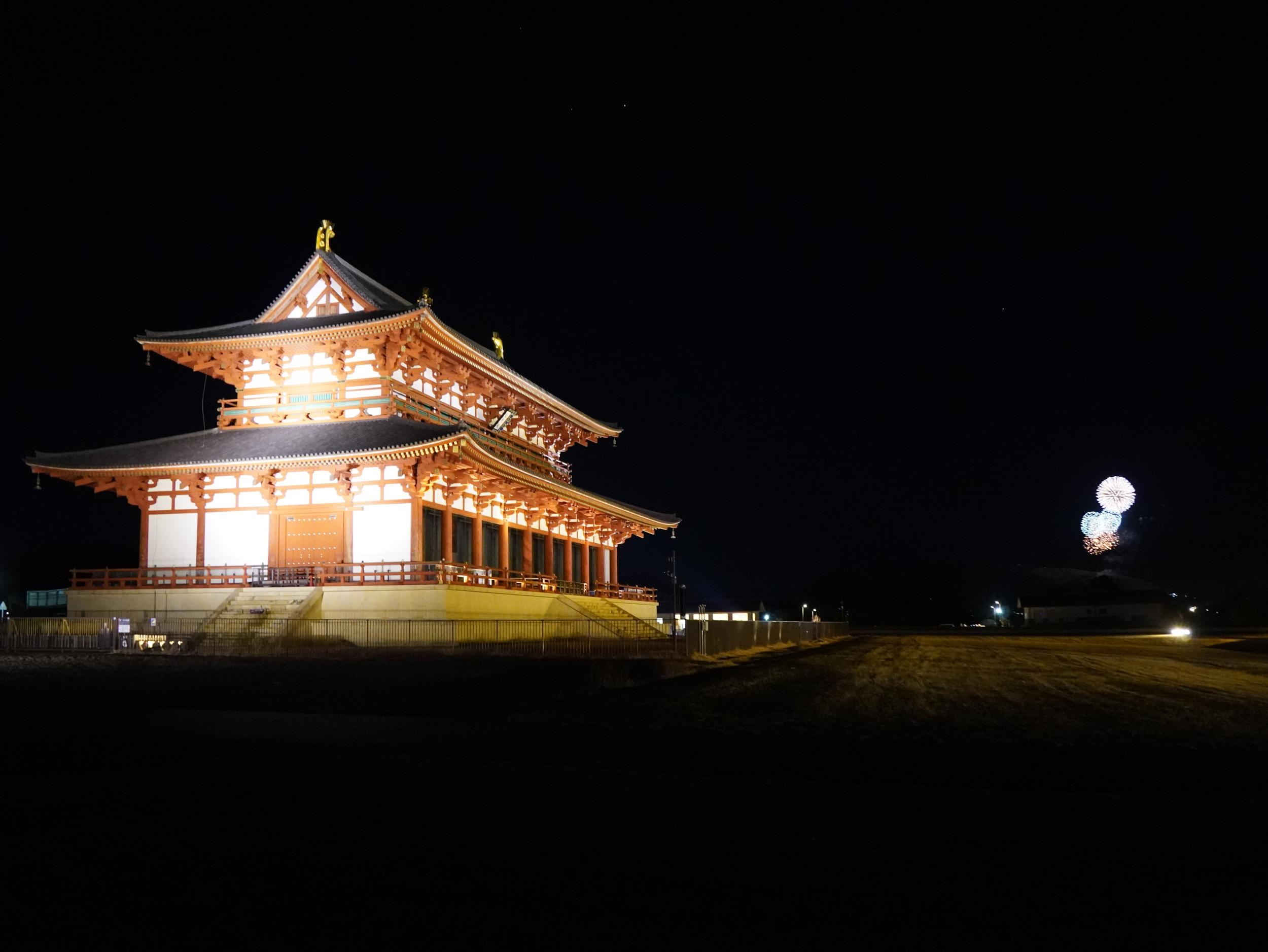 平城宮跡に着くと大極殿西側に数十人のギャラリー。iPhoneで撮ってみると真っ暗な夜空が青くこれは違うやろという発色、ZV-E10にします。