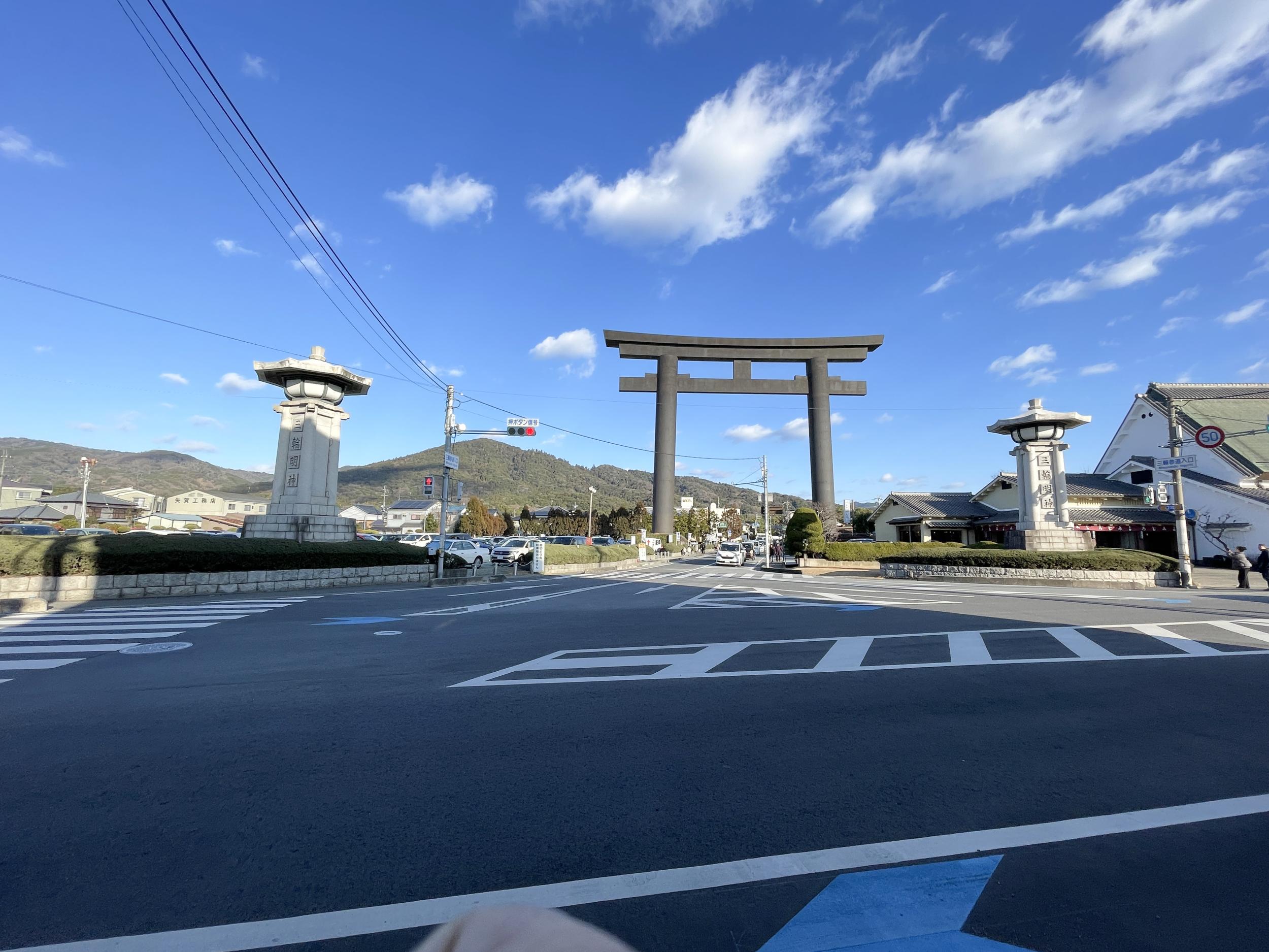 大神神社の大鳥居は三輪山と直線上に無いと気づきました。渋滞で遅れていたバスで桜井駅へ、こんども貸し切りで先行きが心配な路線です。