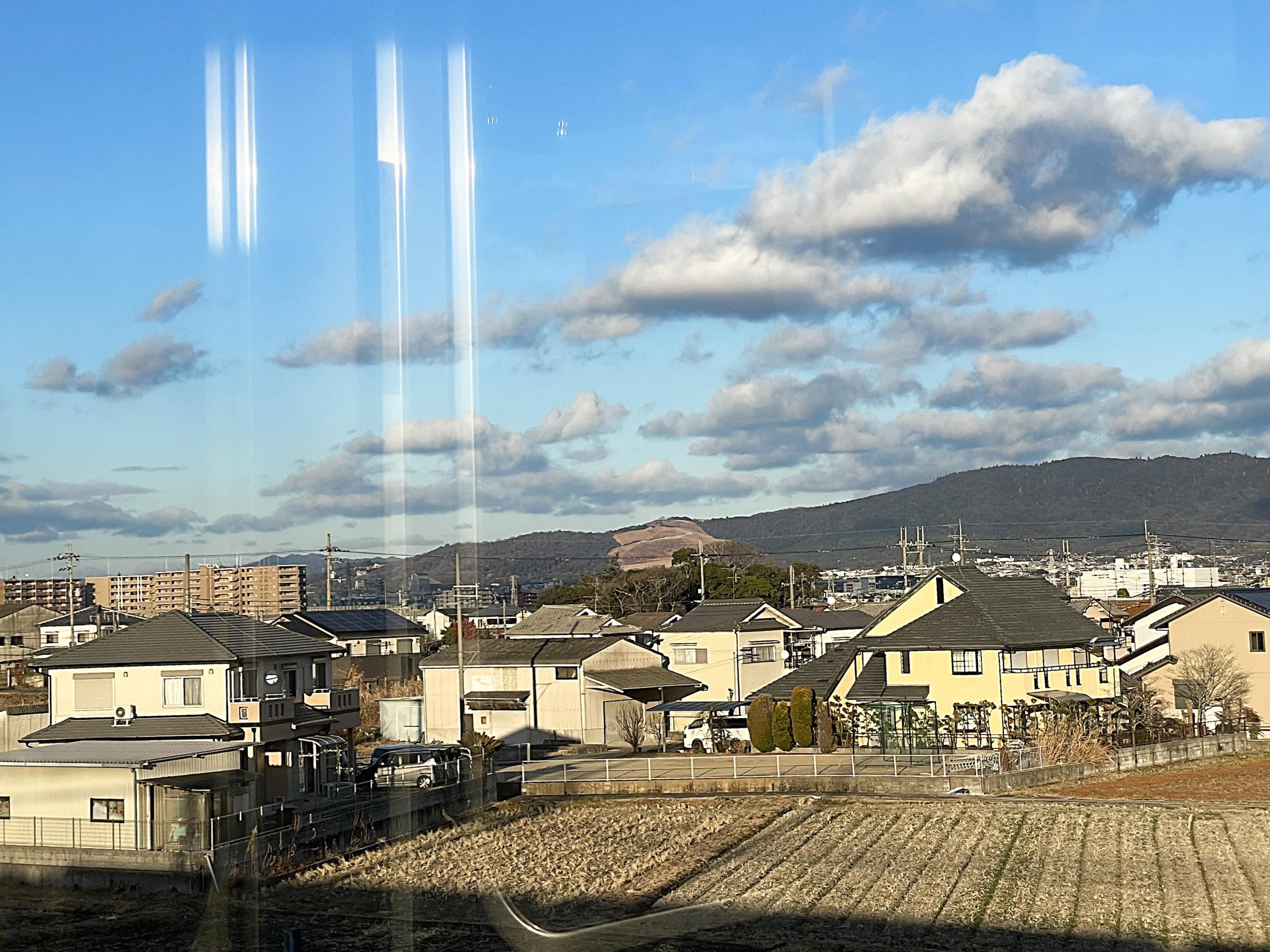 今日は若草山焼きの日、8年ぶりに行ってみることにして大和八木で橿原線に乗り換えます。橿原線がJR大和路線と交差する辺りから若草山がよく見えます。