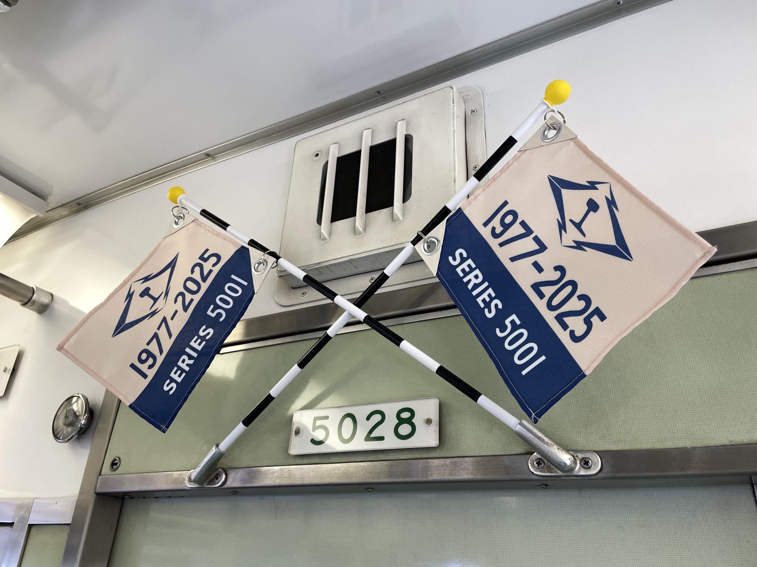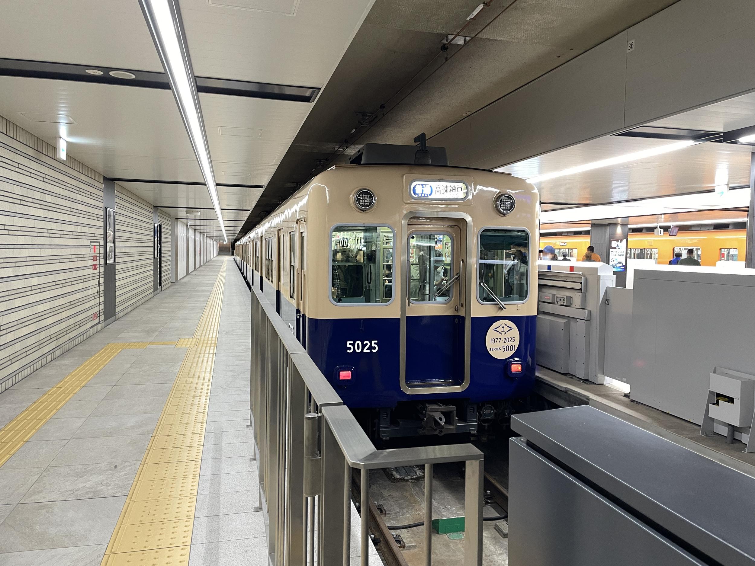 5001形の運用をチェックして三宮から乗車。ヘッドマークはまるでペイントされたように見えるのですが、よく見ると円板の影があるので、やはりフックに掛けられているようです。