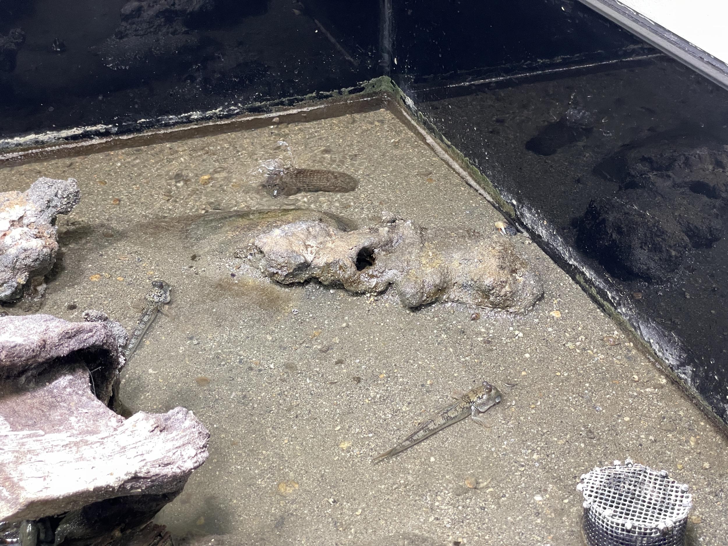 クラゲの展示は靴を脱いで上がるカーペットの敷かれた部屋、その隅っこにトビハゼ、和歌浦のトビハゼとは別の奄美のマングローブに生息するミナミトビハゼ。
