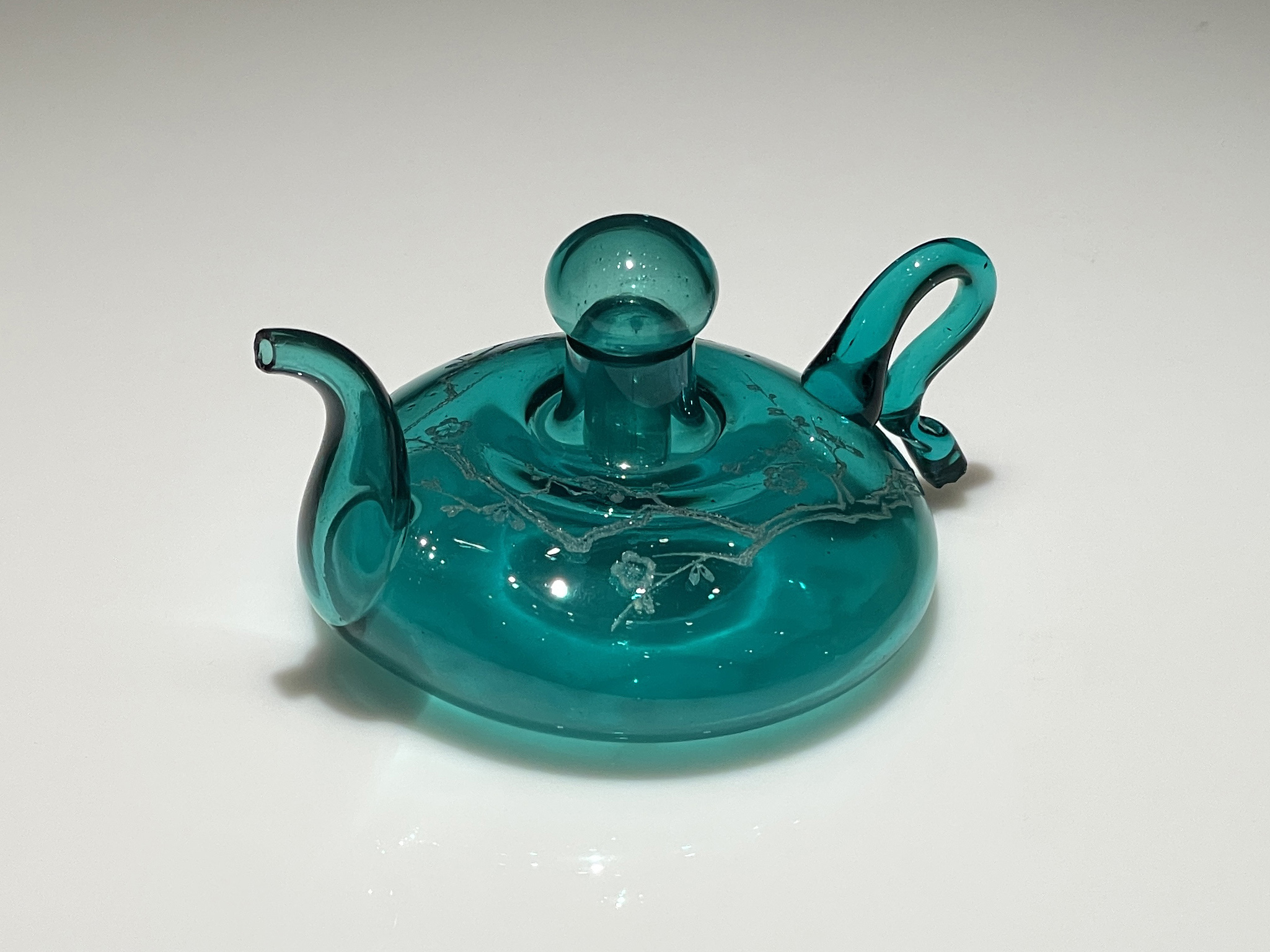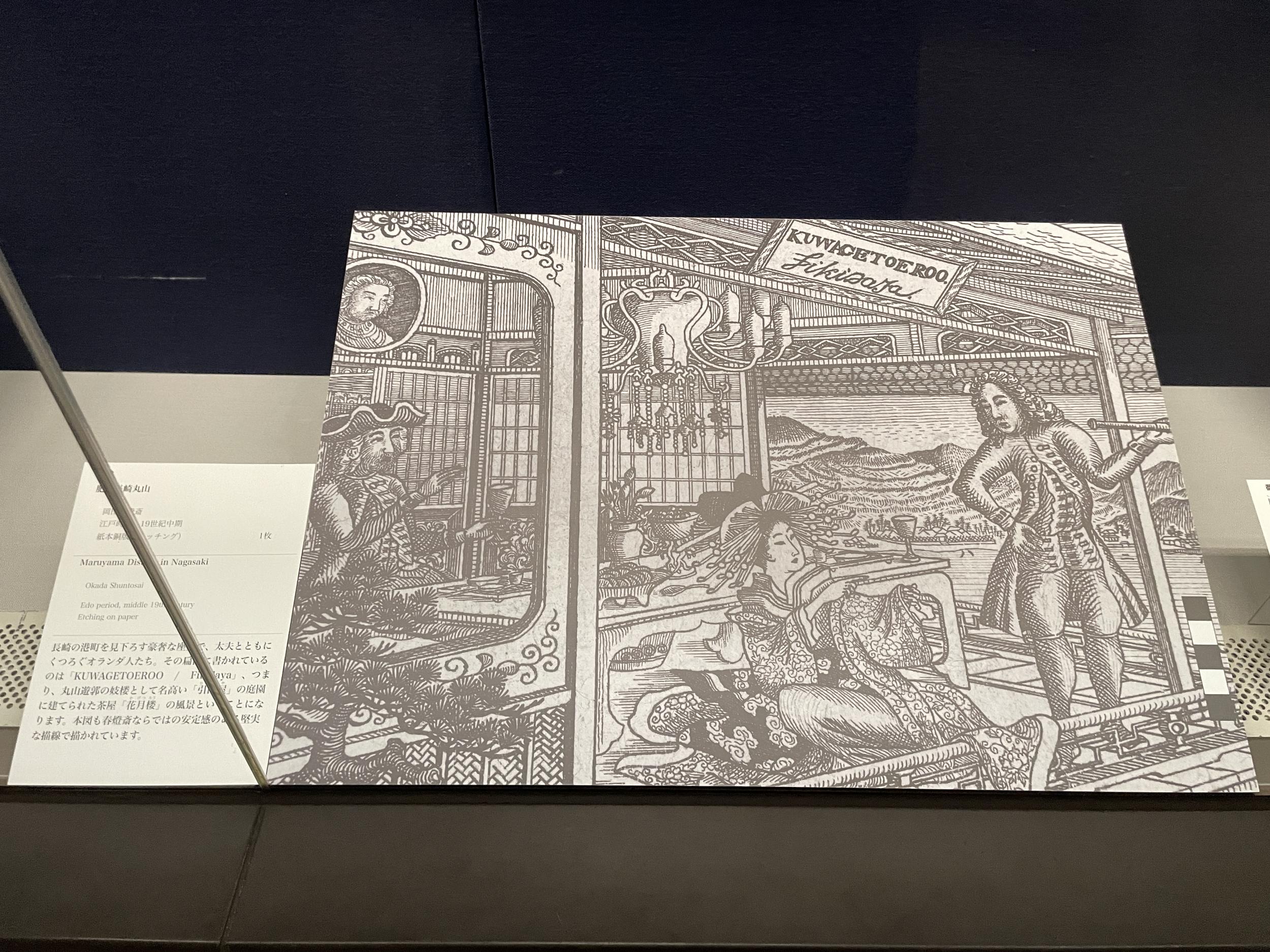 びいどろ・ぎやまん・ガラス展示コーナーのぎやまん彫り梅枝文緑色ガラス手つき水注(江戸時代中期)、5cmほどの小さなガラス器に梅の枝が描かれています。器の大きさや形状からすると今際の際の病人に水を与える水注と思われます。水注に描かれた梅を見せながら、春になったら一緒に梅見しましょうね、と声をかけながら水を与える看病人の姿が浮かびます。上述の銅版画といい、ずっと遡って銅鐸といい、こういう繊細細密なものは太古から日本人の得意技ですね。