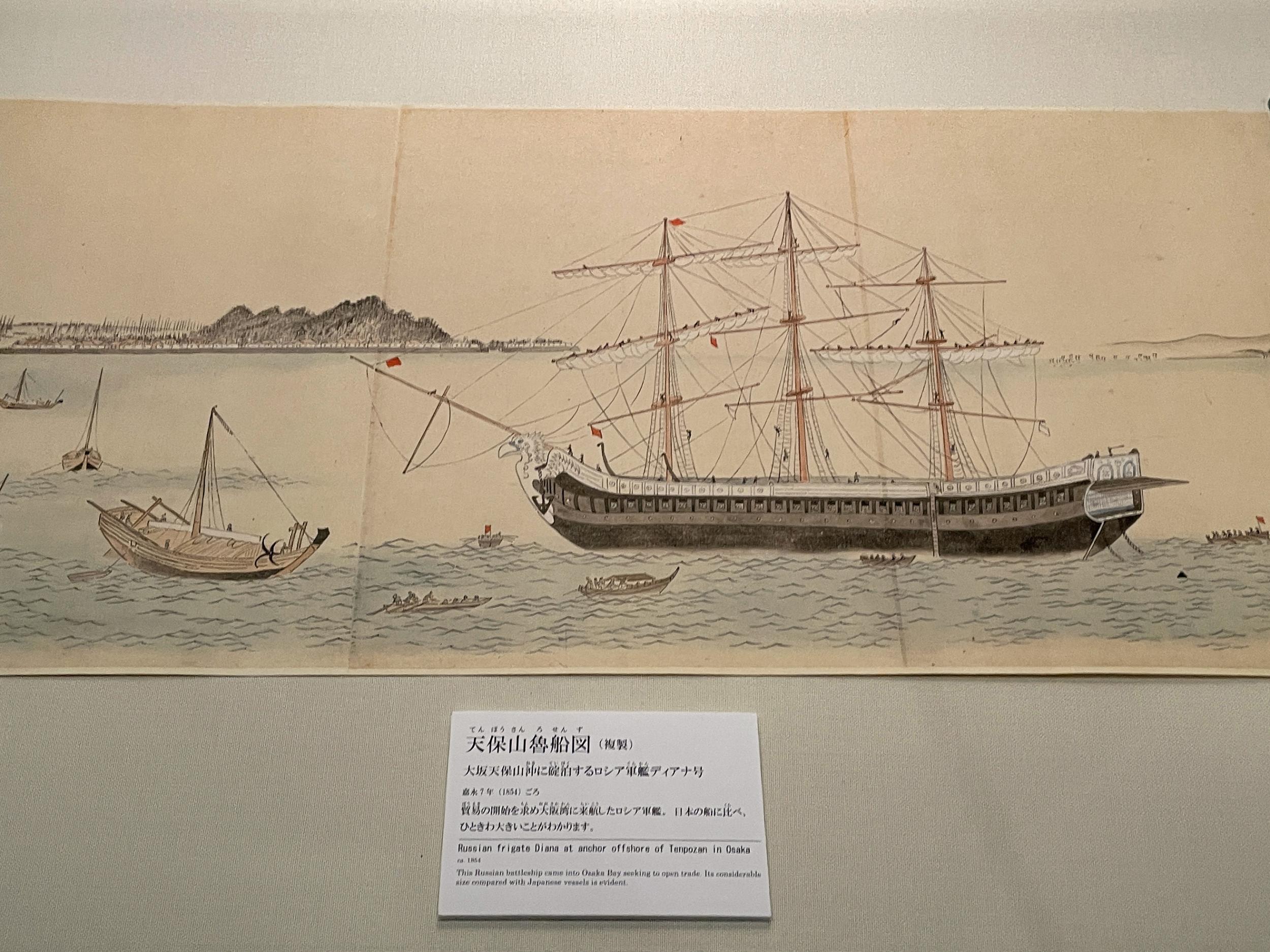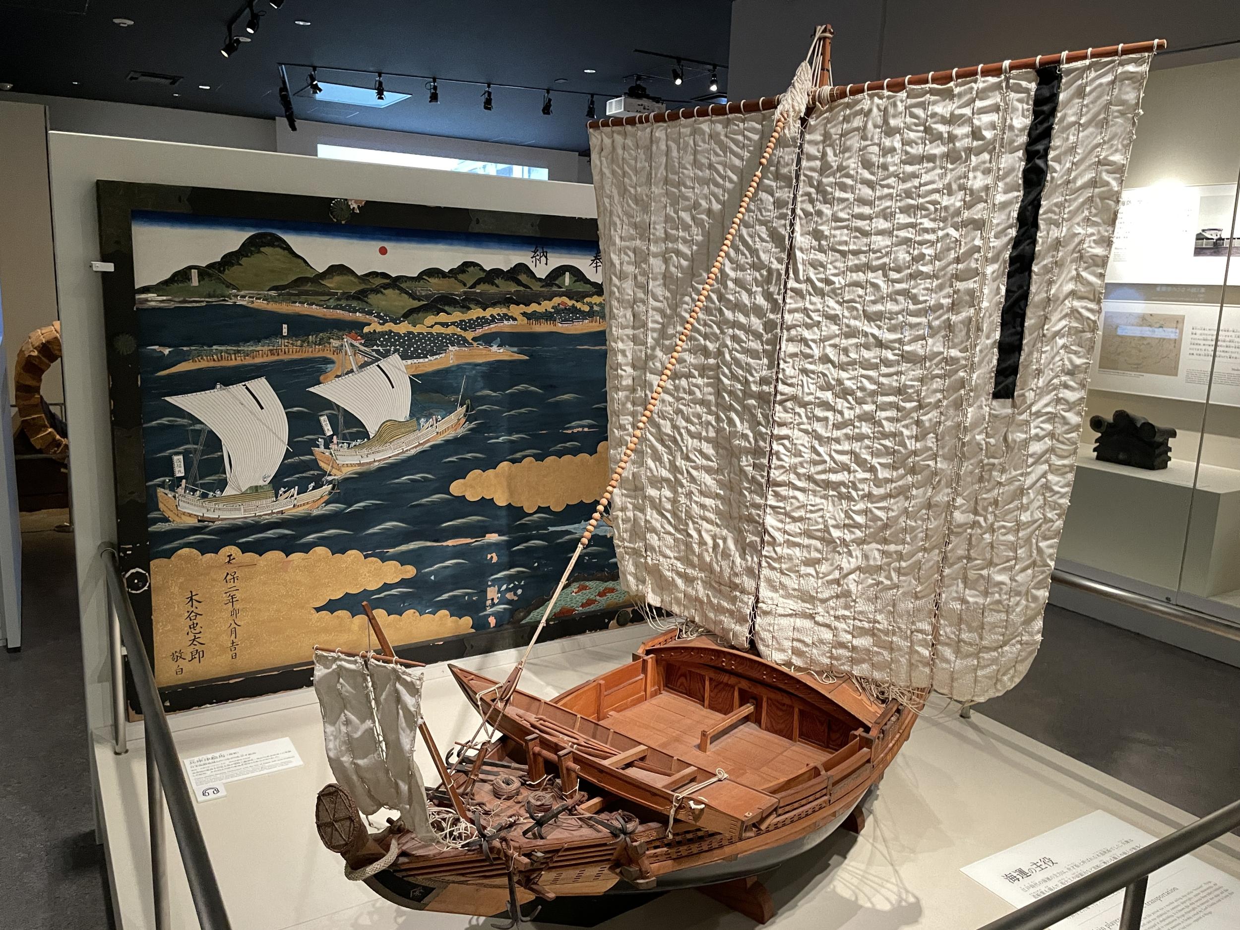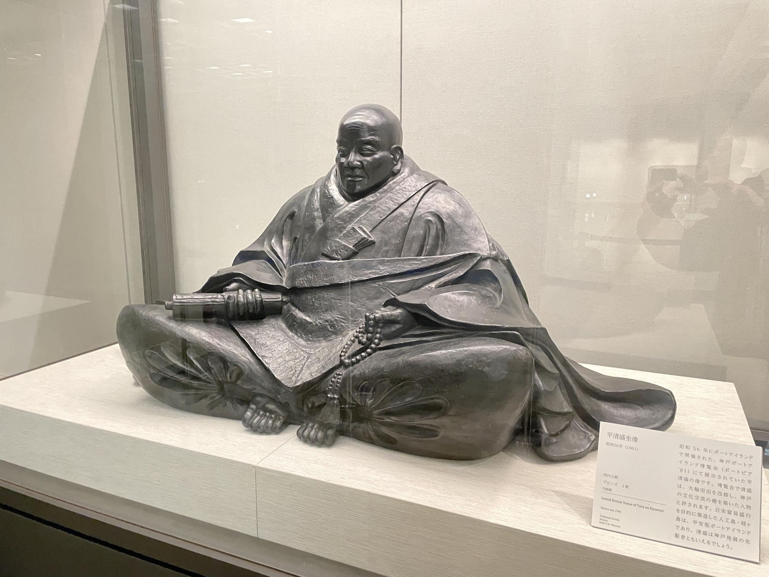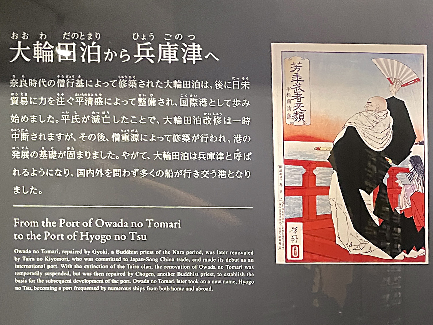 大輪田泊から兵庫津へのパネルに平清盛を描いた月岡芳年の浮世絵、福原京から海へ向かって扇を振る姿がかっこいい。ちなみに大輪田泊を修築したのは行基さんです。